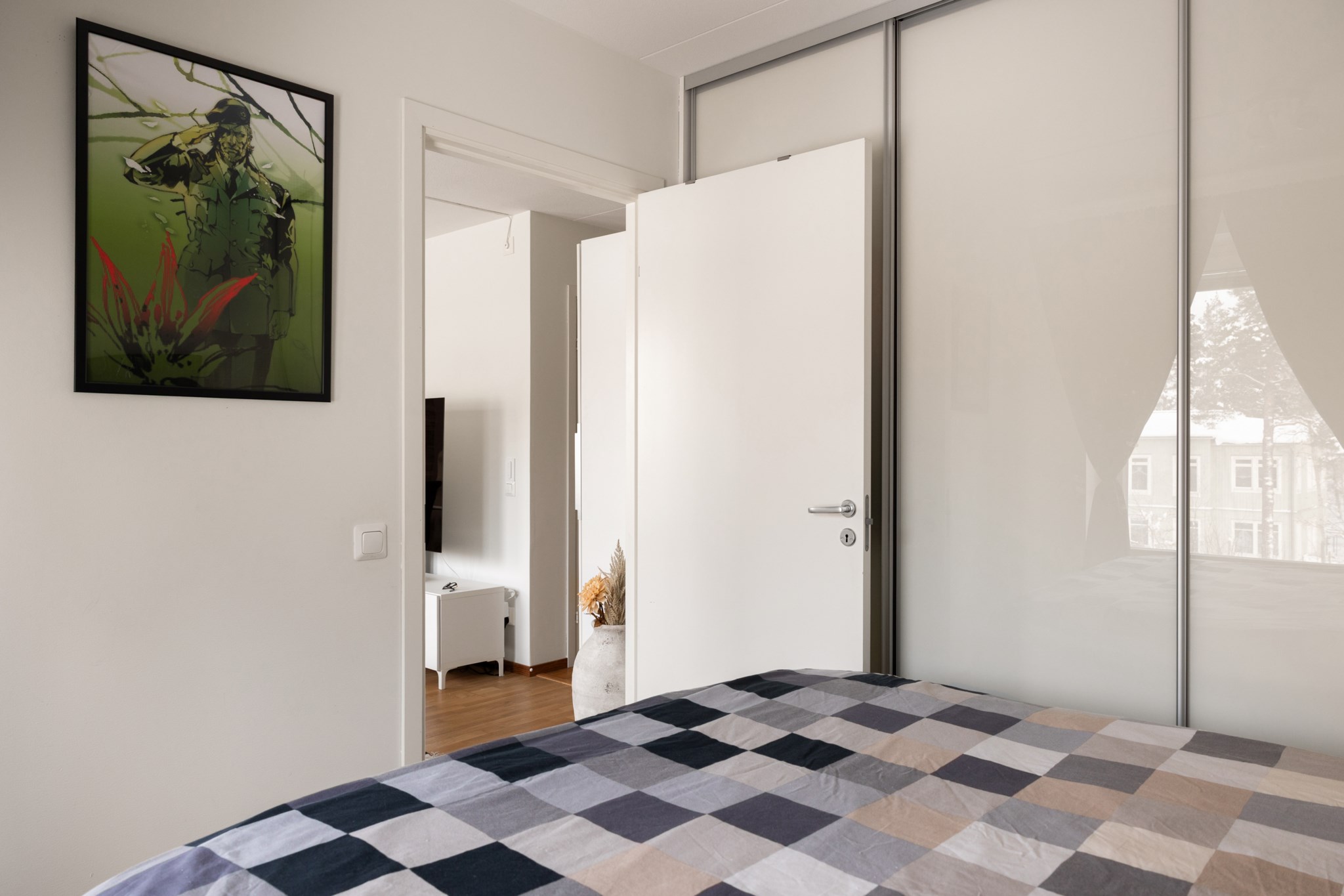 Från vardagsrummet nås den rymliga balkongen, ett tydligt mervärde i bostaden. Här finns gott om plats för möbler och odling och läget högt upp ger en fri och privat känsla med utsikt mot grönskande omgivningar. Balkongen blir en naturlig plats för morgonkaffe, långa sommarkvällar och lugna stunder.