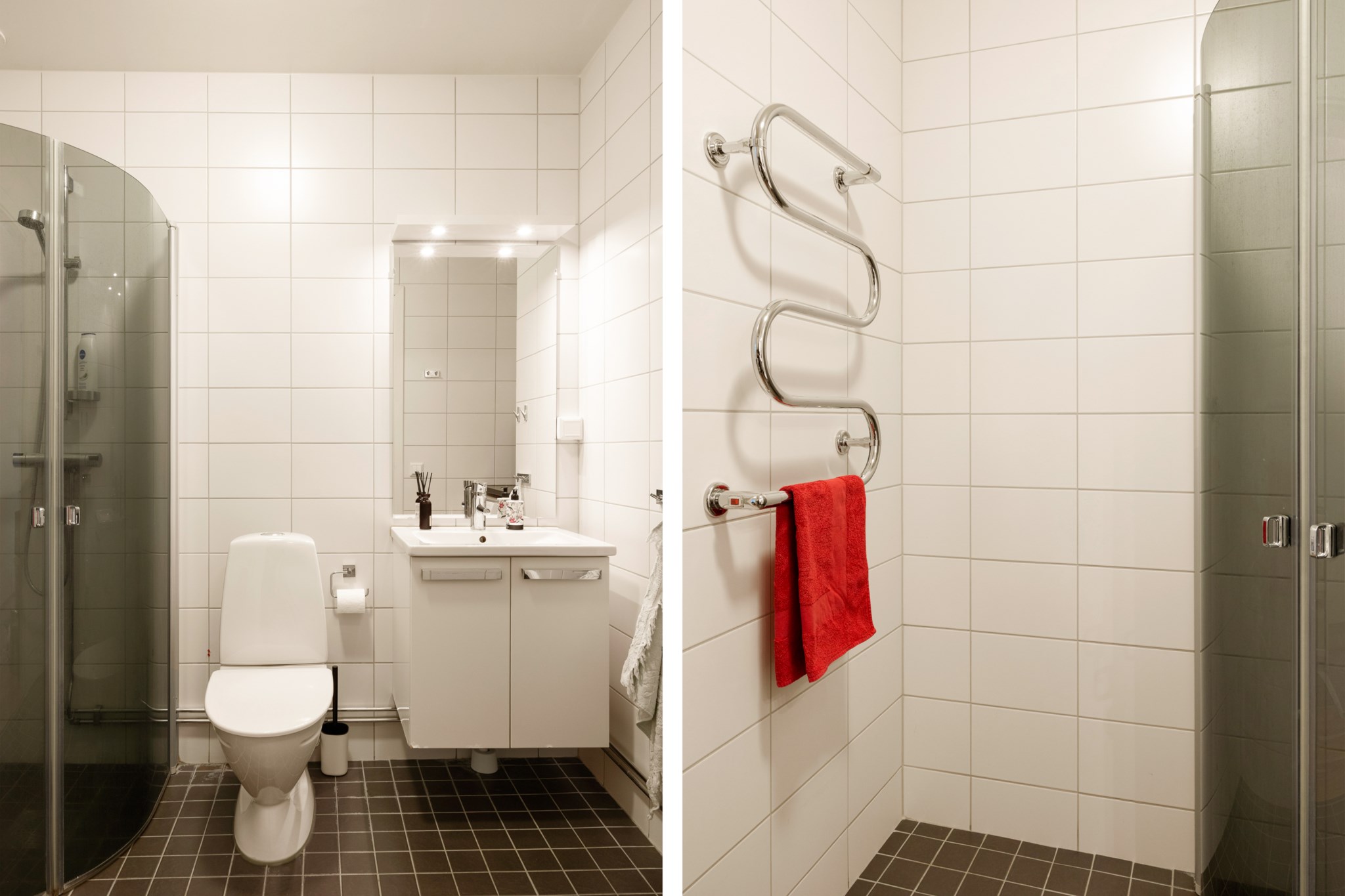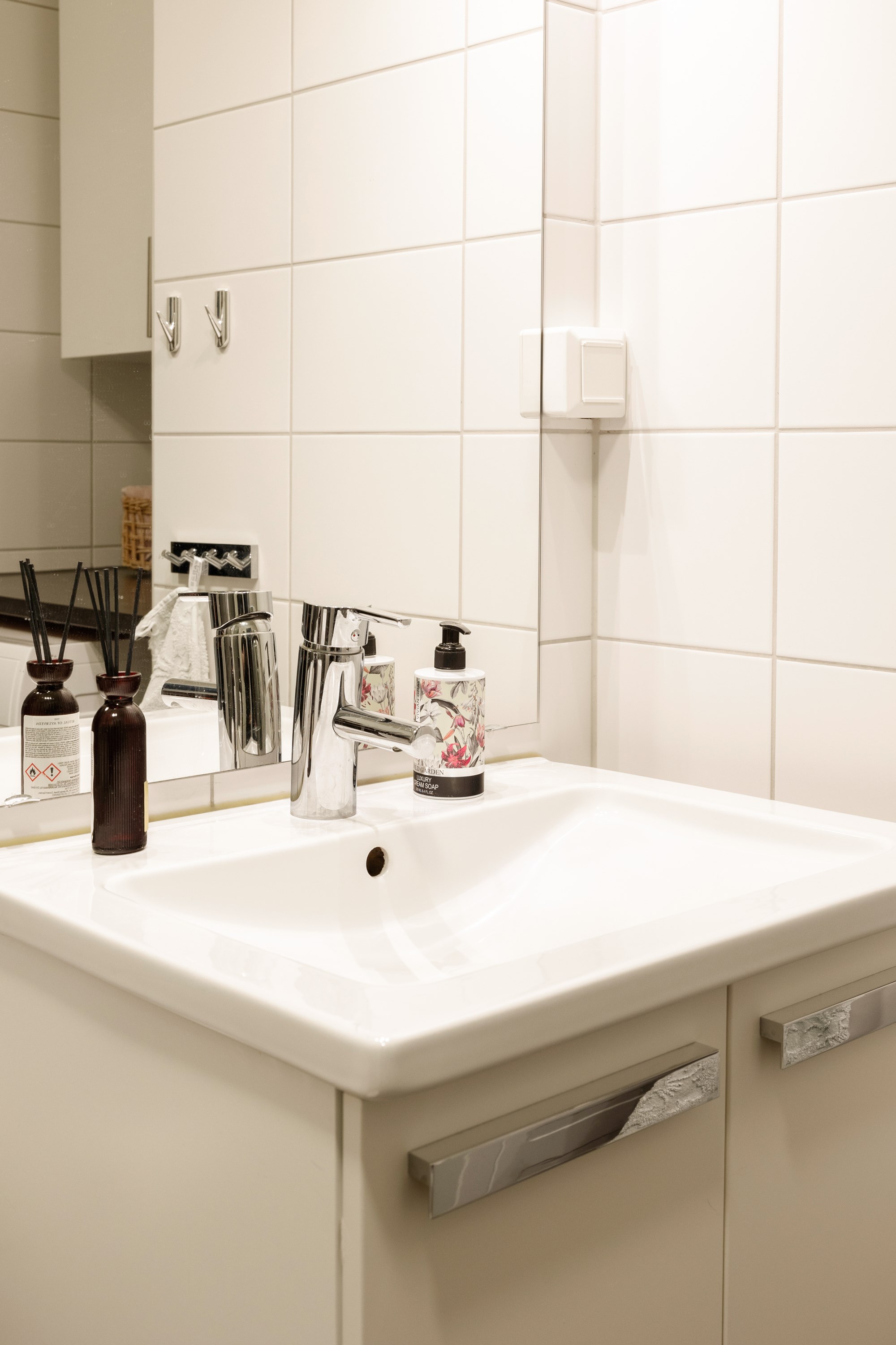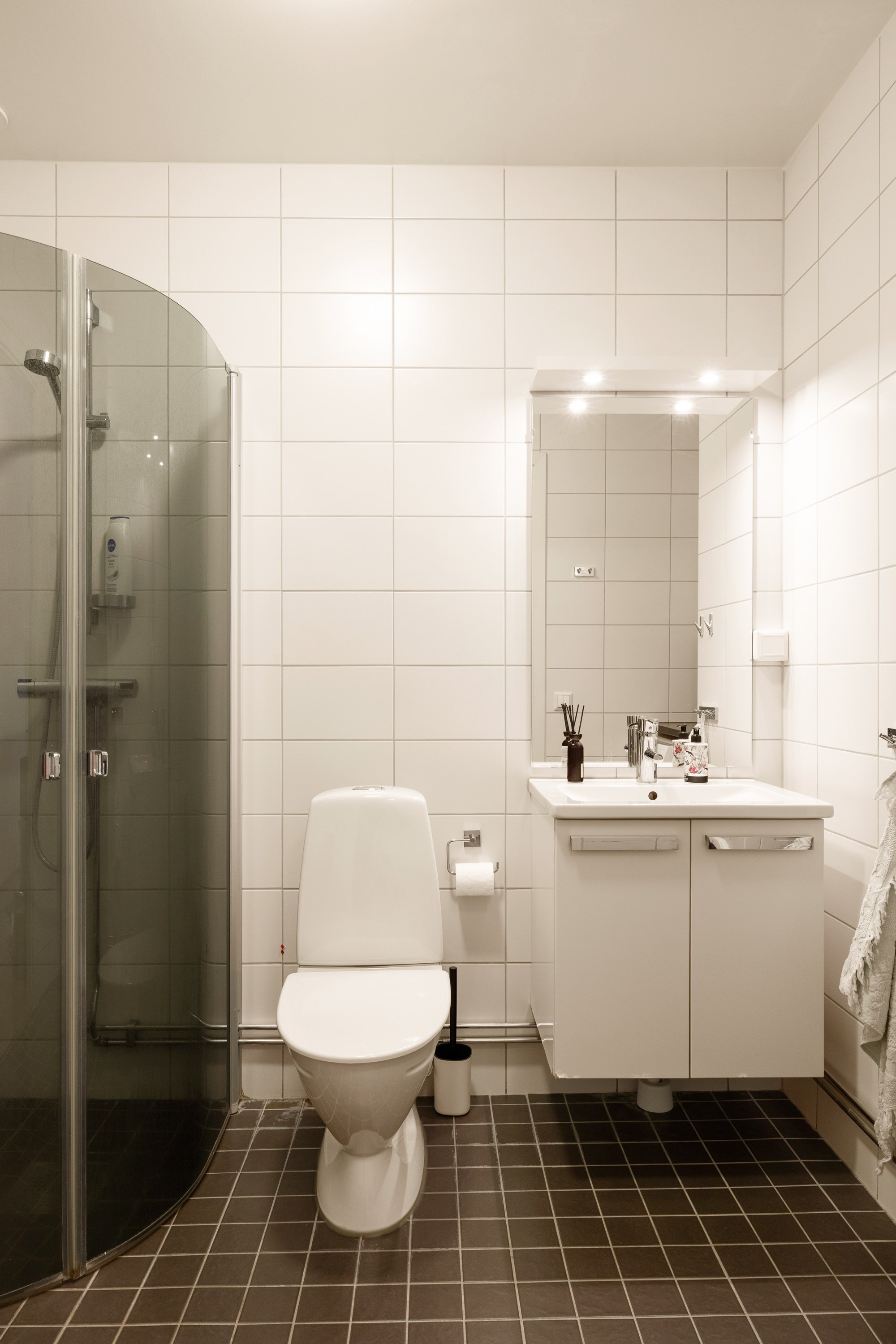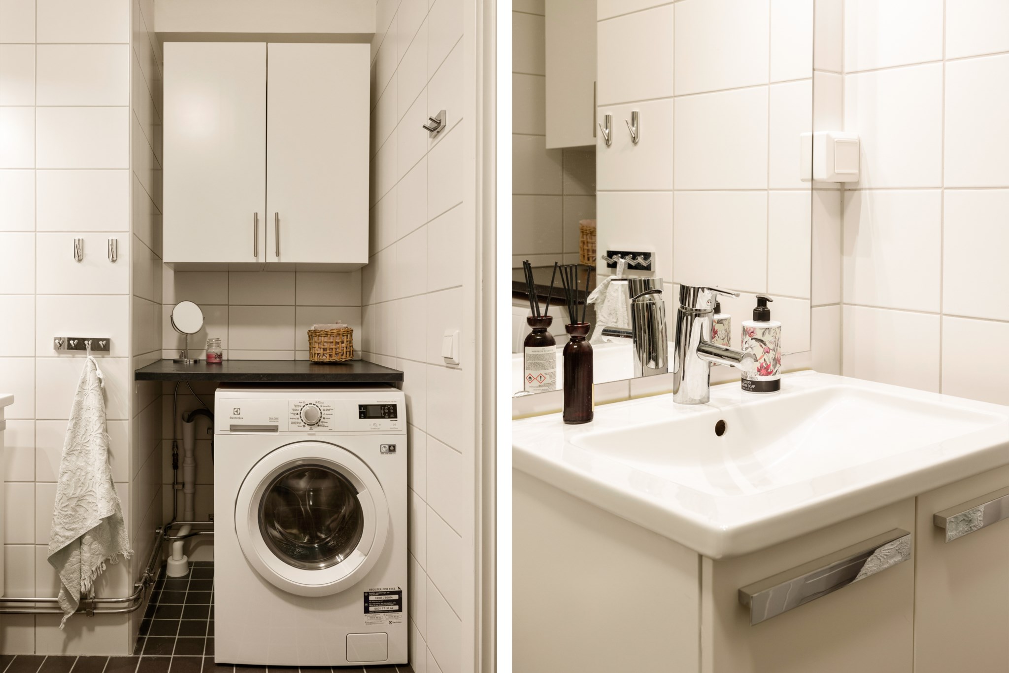 Det stilrena badrummet är fullt utrustat med badkar, kombinerad tvättmaskin och torktumlare, WC samt kommod – allt i ett modernt och fräscht utförande.