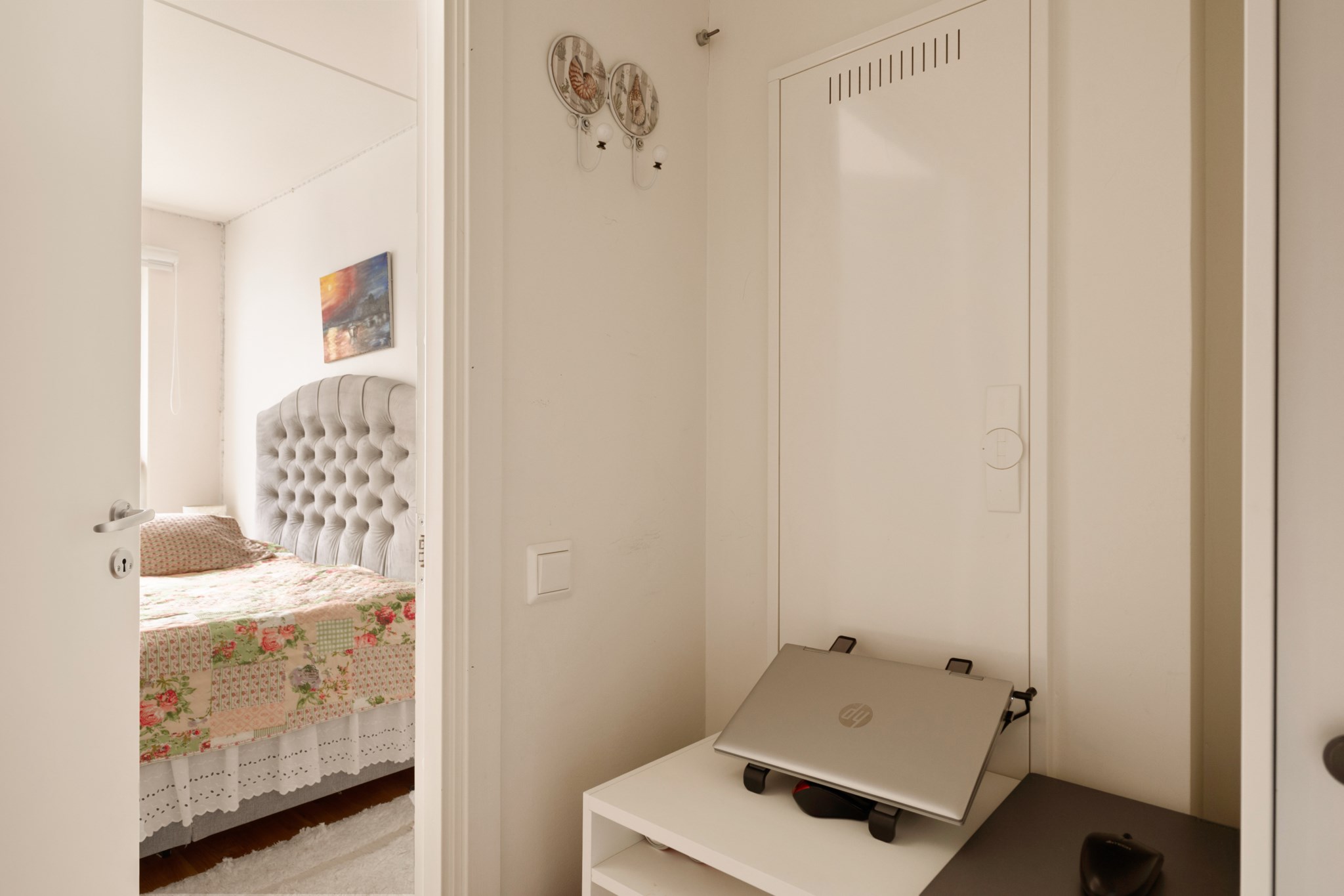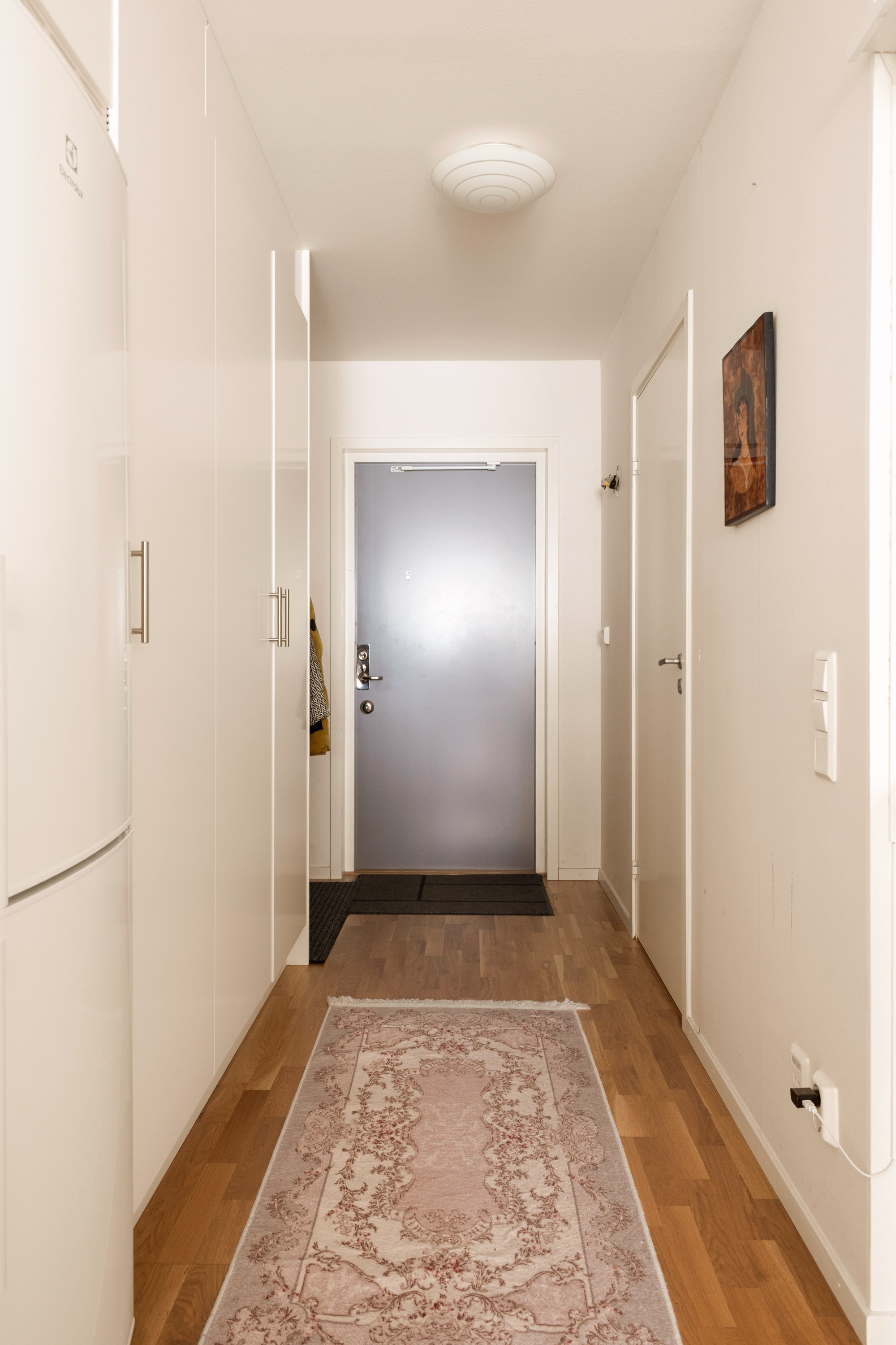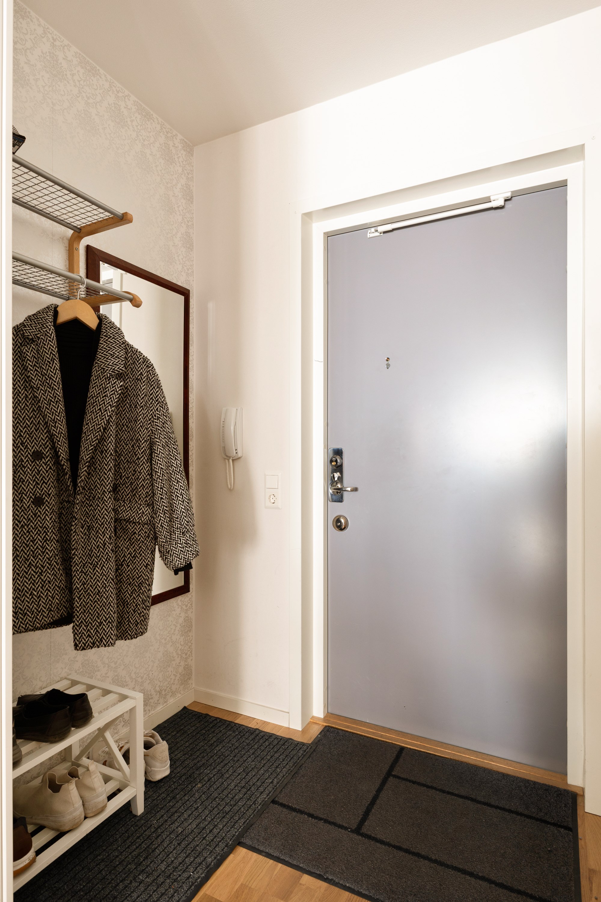 Det separata sovrummet är väl tilltaget och rymmer enkelt en större säng samt tillhörande möblemang. I anslutning finns goda förvaringsmöjligheter i form av klädkammare, och hallen erbjuder ytterligare förvaring med garderober och kapphängare. Bostaden disponerar även ett externt förråd.