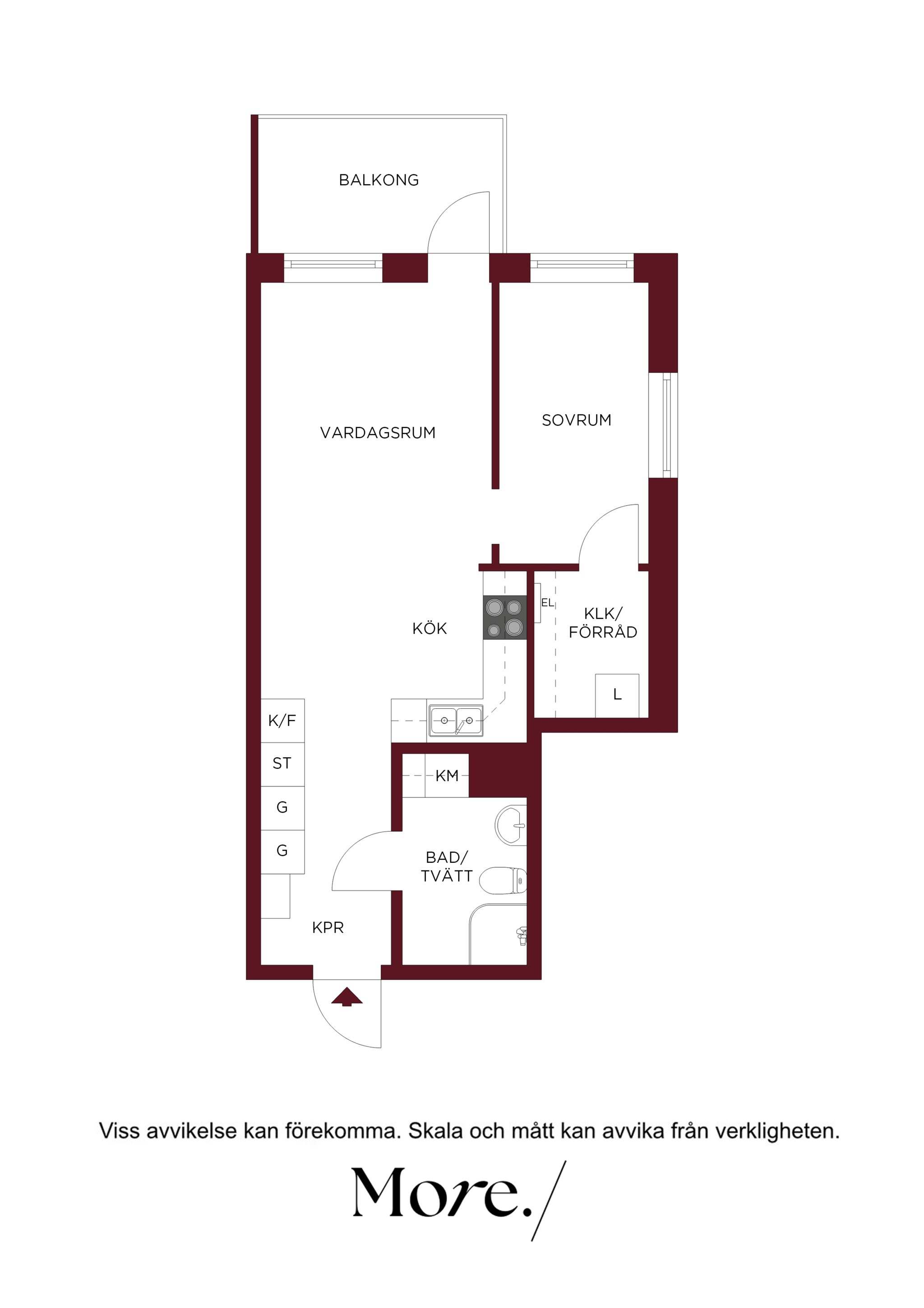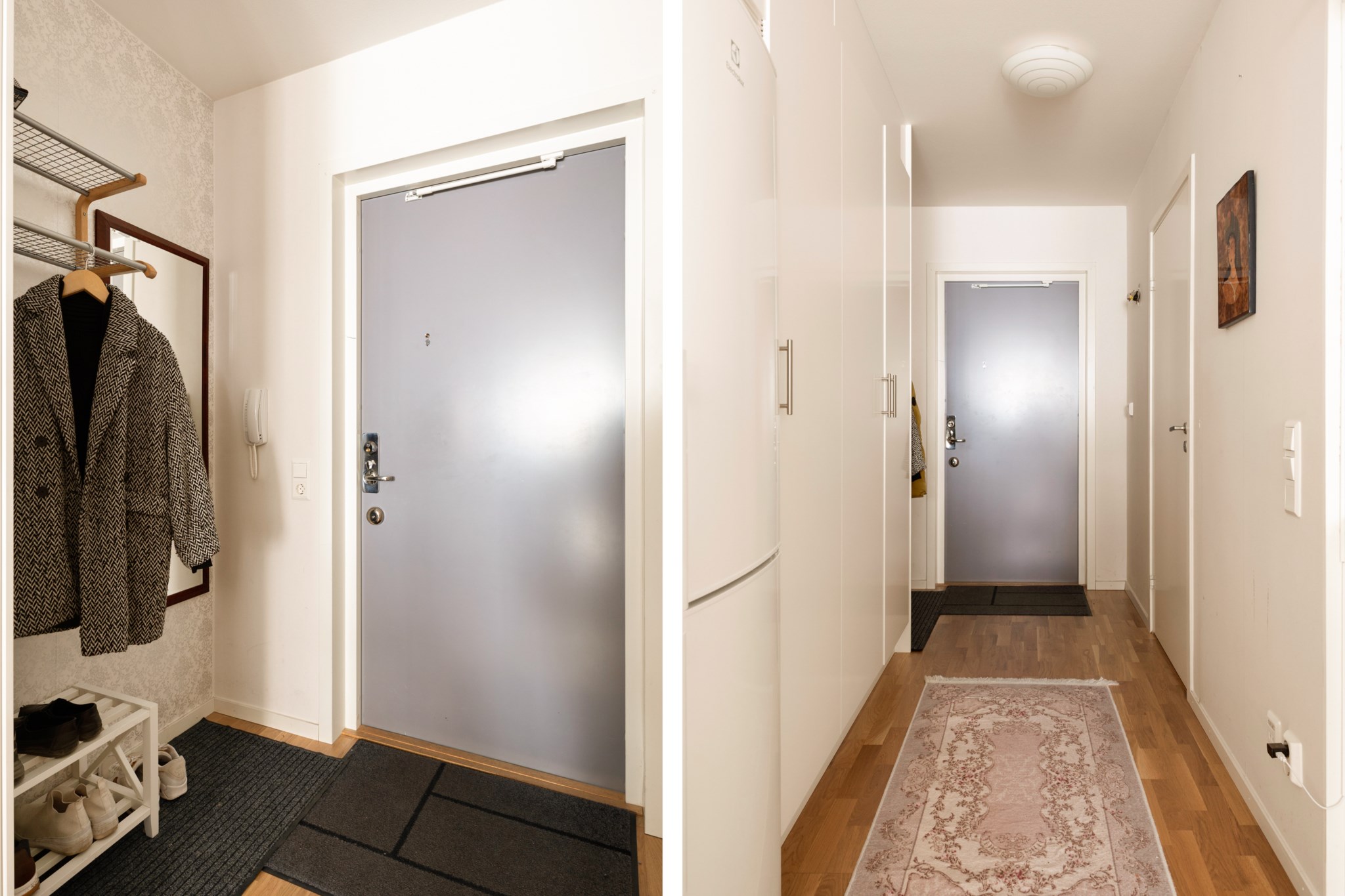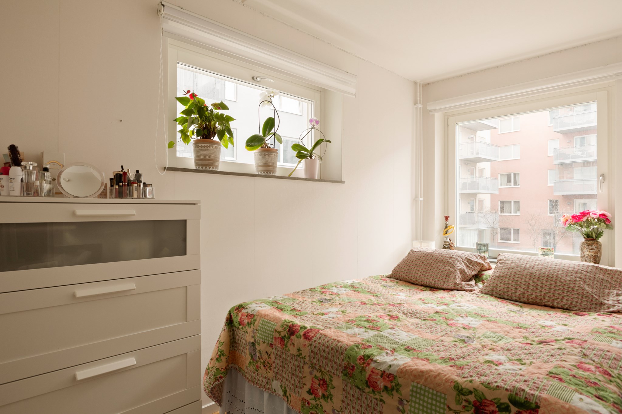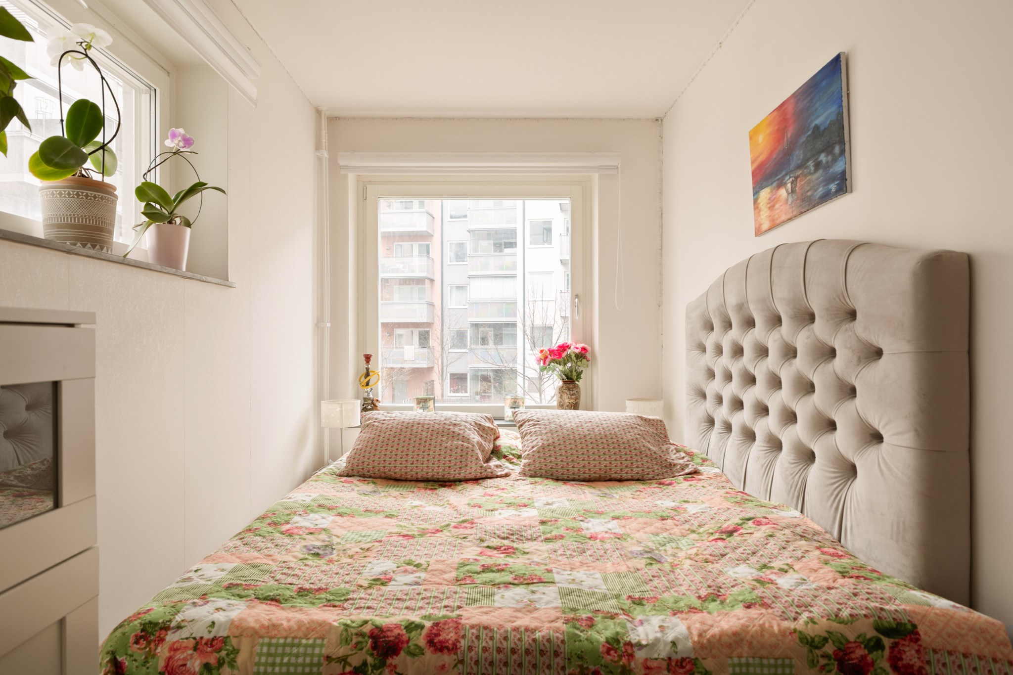 Det separata sovrummet är väl tilltaget och rymmer enkelt en större säng samt tillhörande möblemang. I anslutning finns goda förvaringsmöjligheter i form av klädkammare, och hallen erbjuder ytterligare förvaring med garderober och kapphängare. Bostaden disponerar även ett externt förråd.