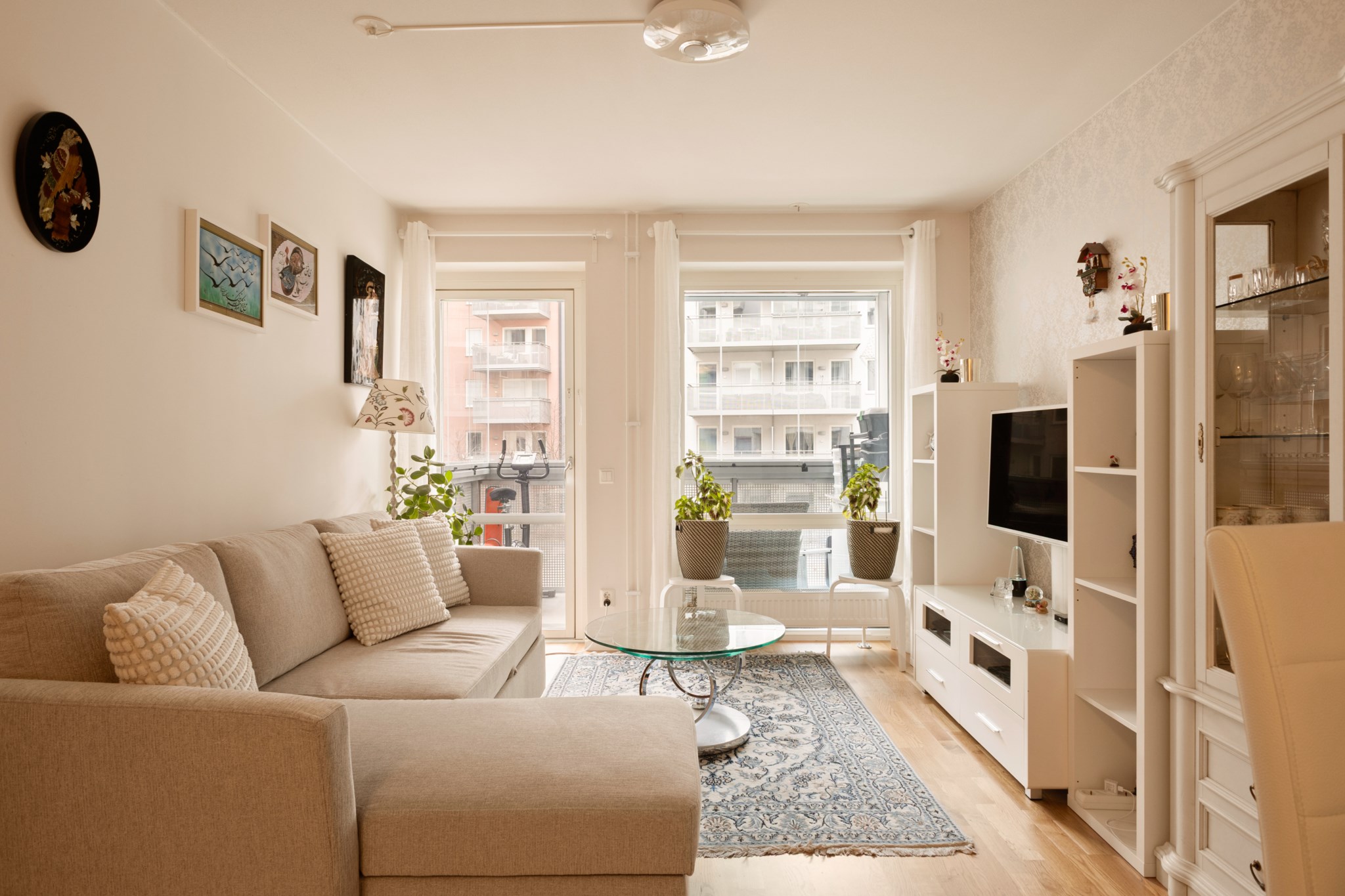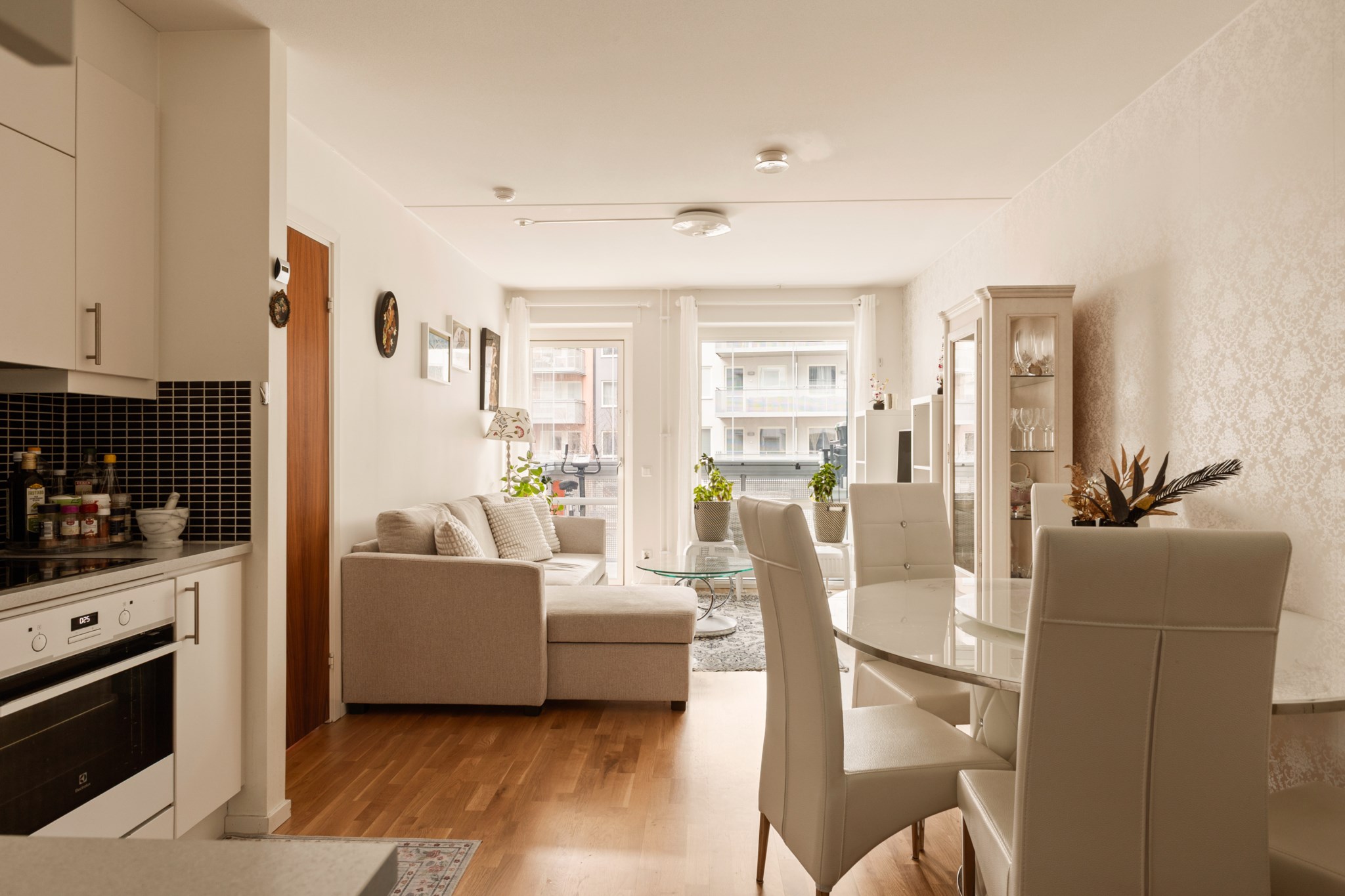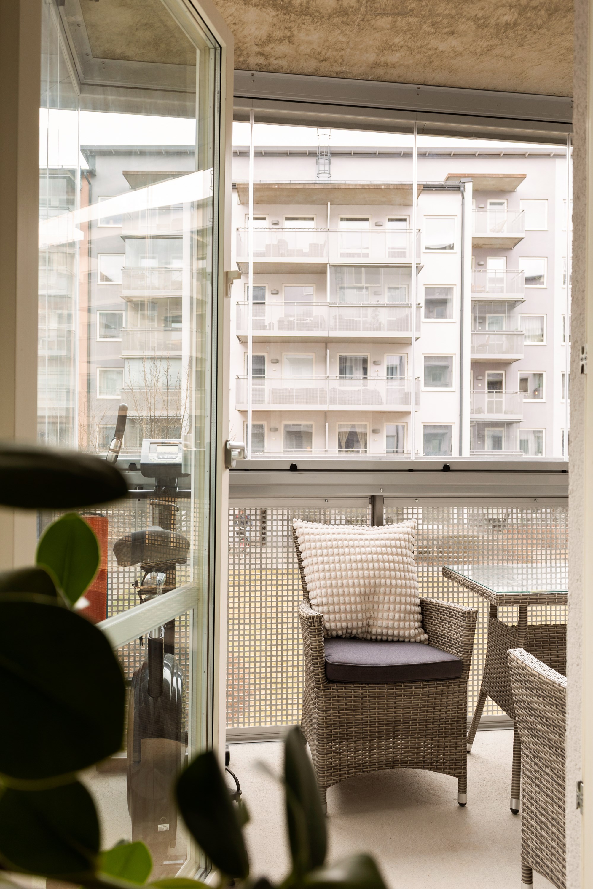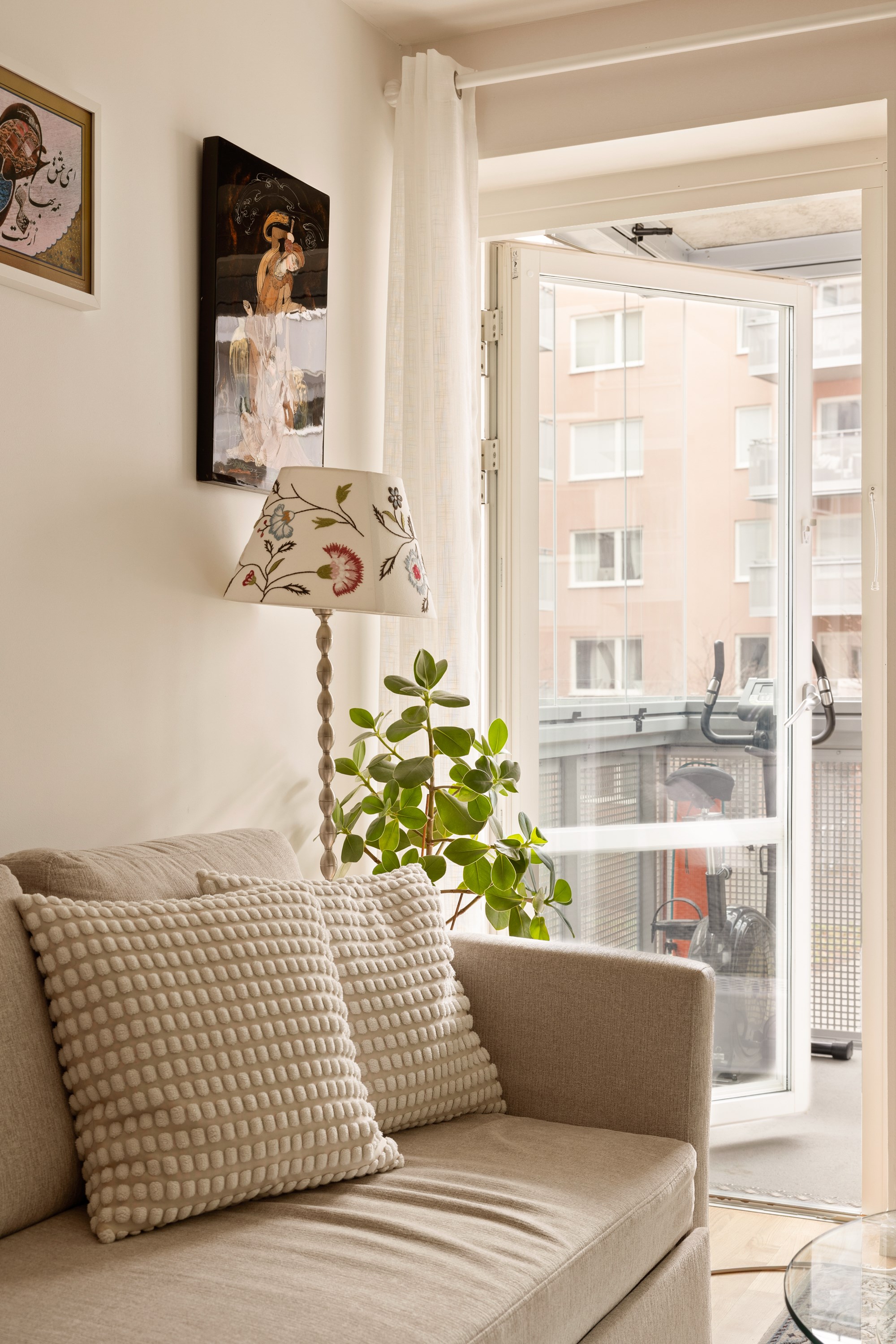 Vardagsrummet har direkt utgång till den rymliga balkongen som vetter mot den lugna innergården – en självklar plats för avkoppling under årets varmare månader.