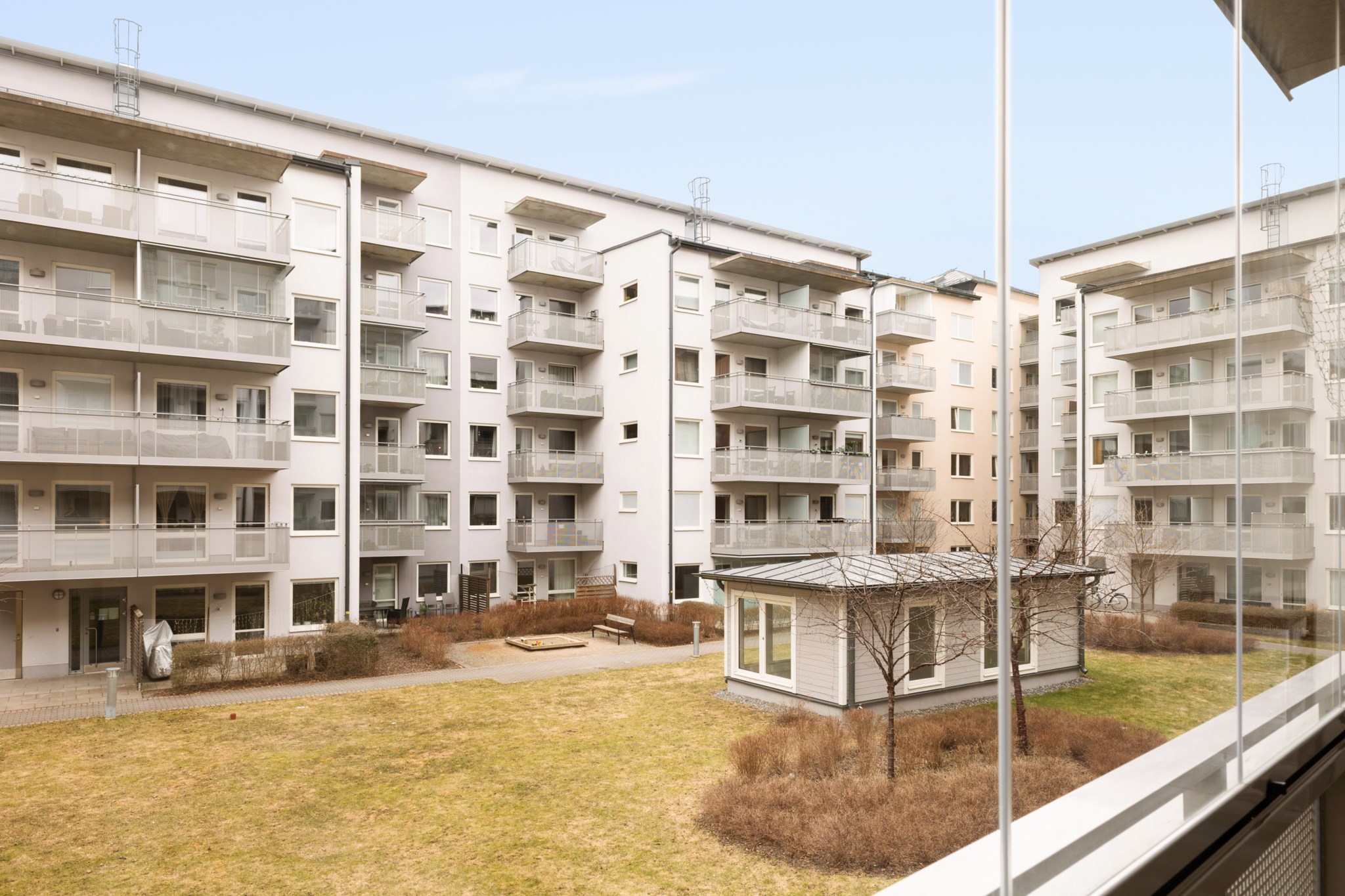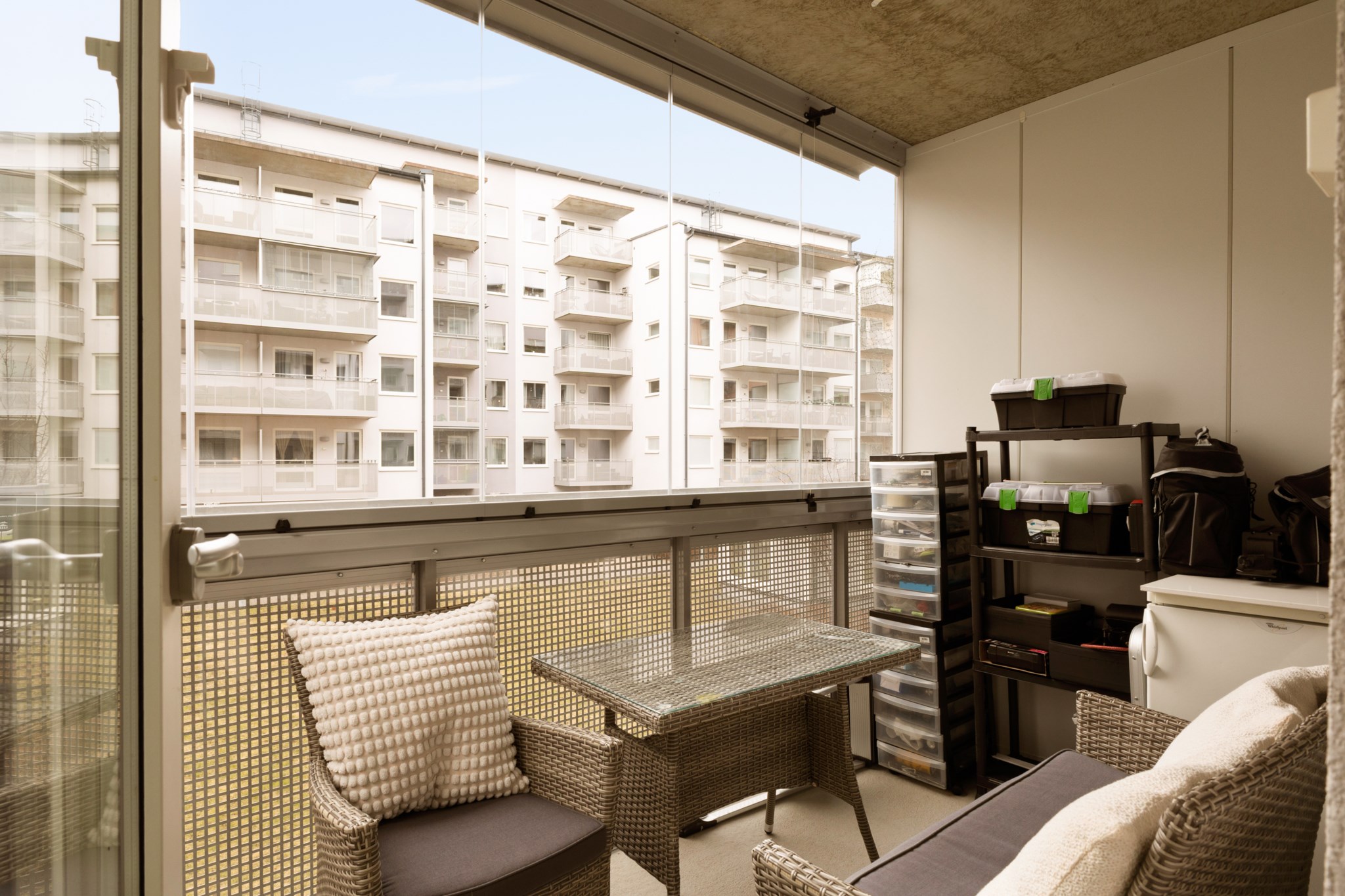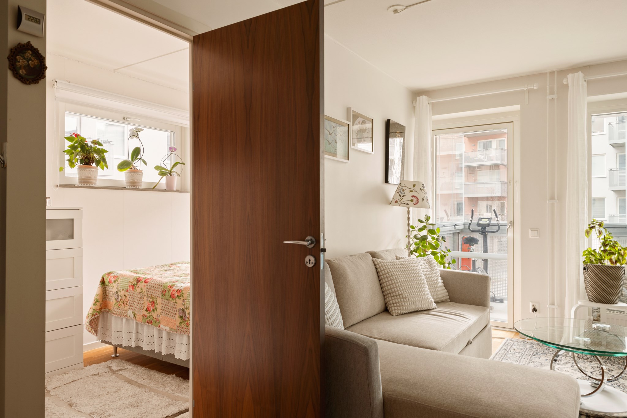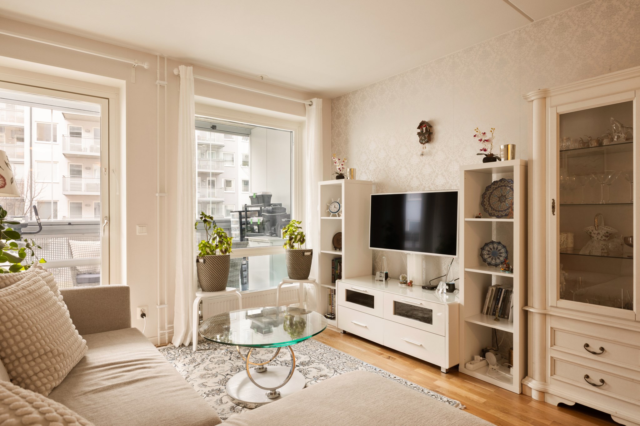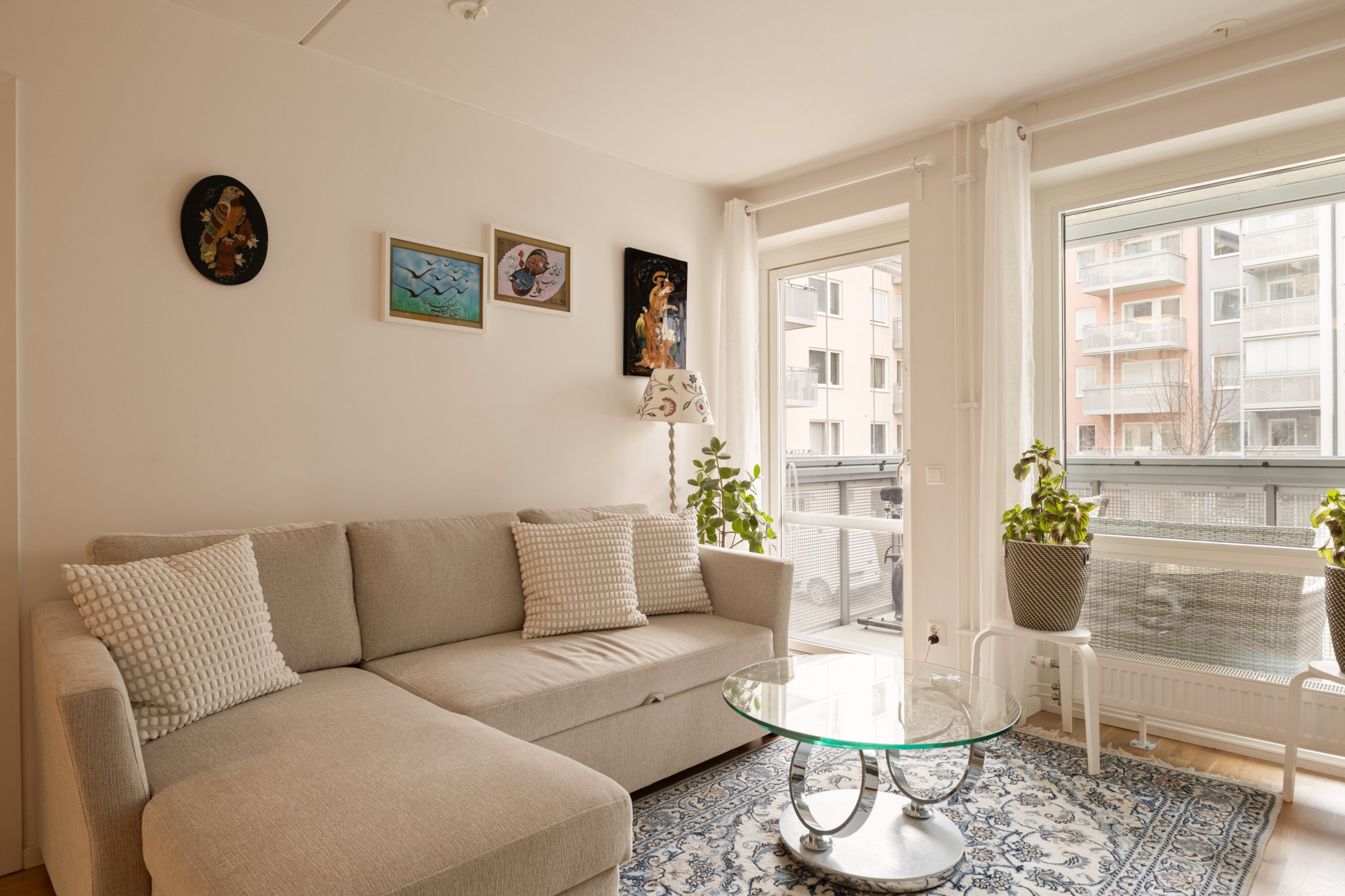 Vardagsrummet har direkt utgång till den rymliga balkongen som vetter mot den lugna innergården – en självklar plats för avkoppling under årets varmare månader.