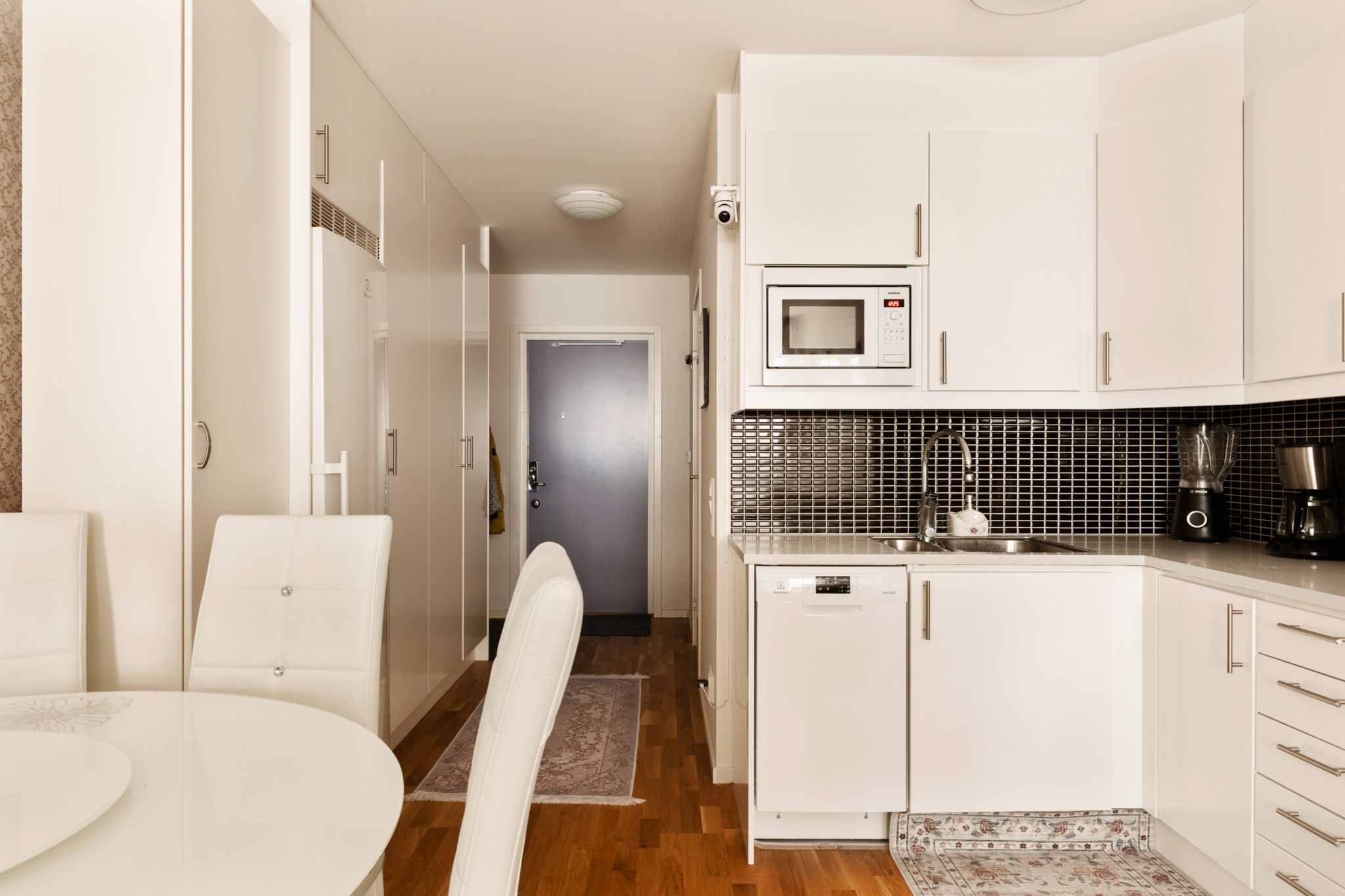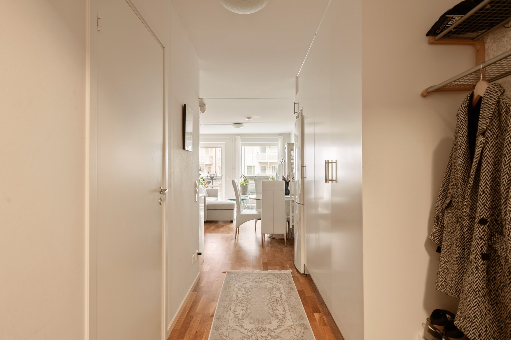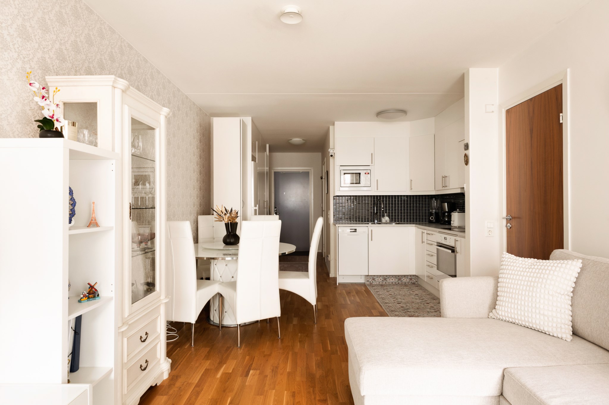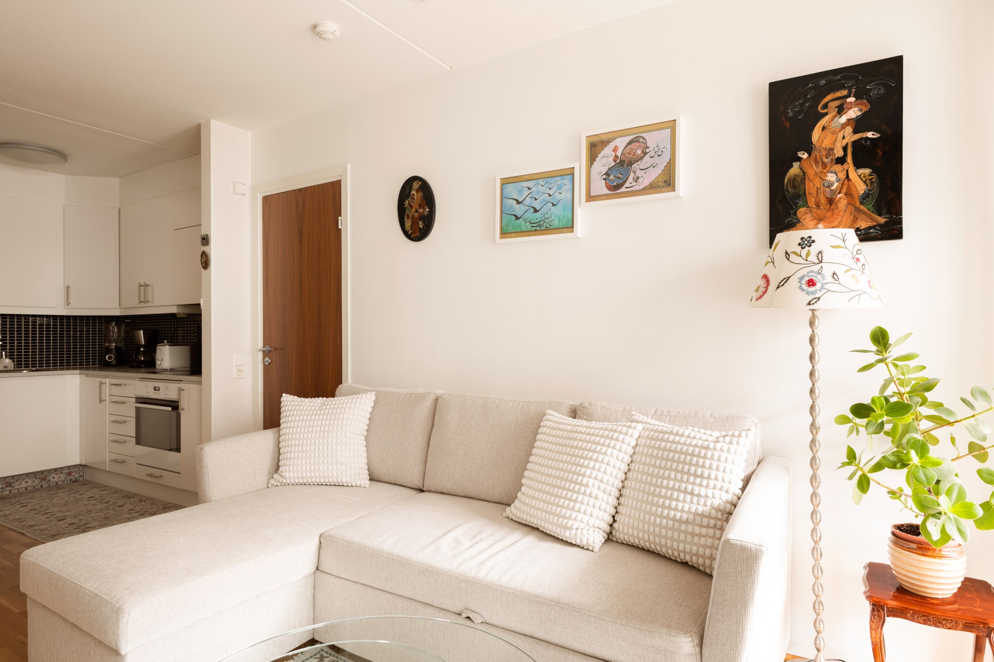 Vardagsrummet har direkt utgång till den rymliga balkongen som vetter mot den lugna innergården – en självklar plats för avkoppling under årets varmare månader.
