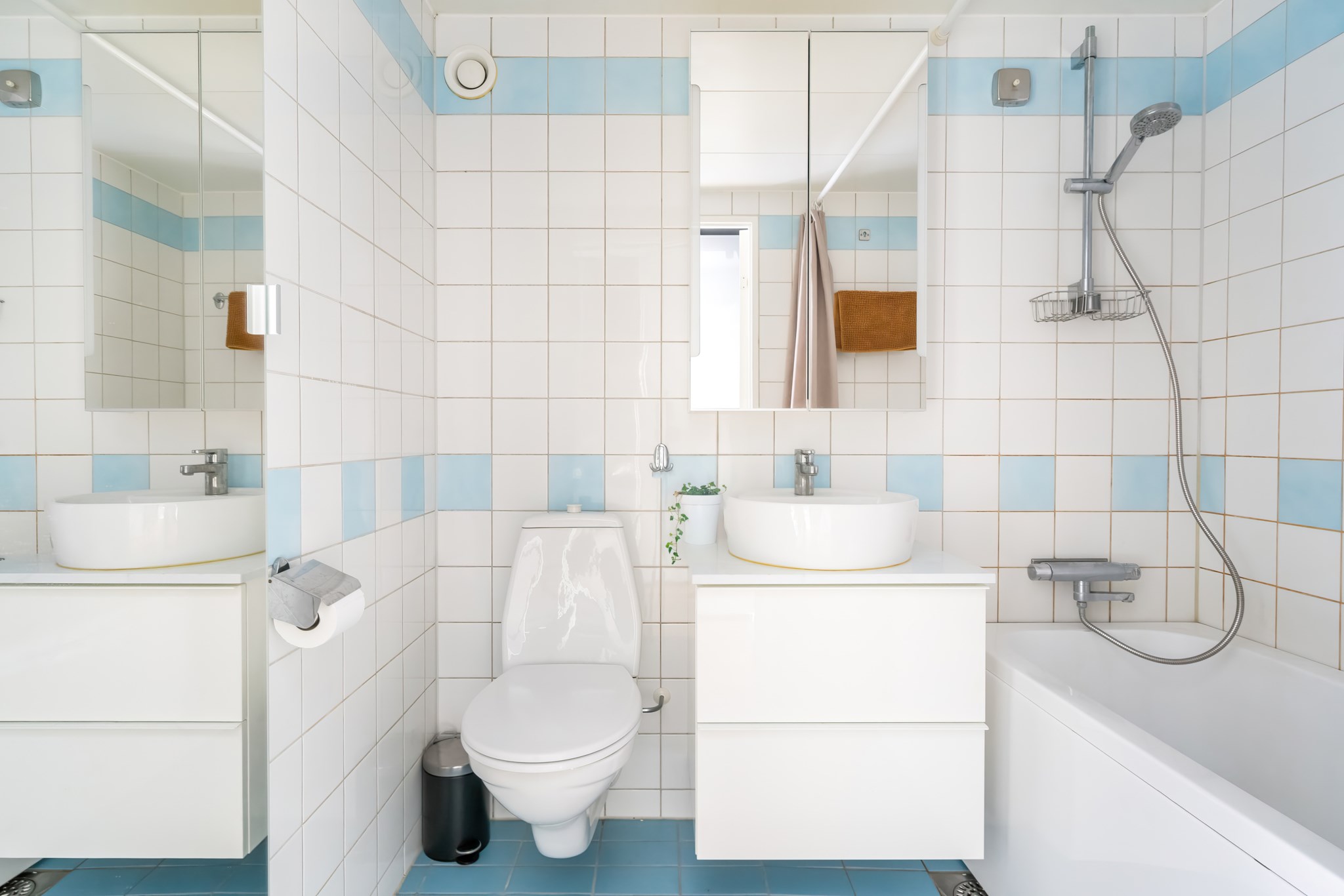 Köket är praktiskt utformat med goda arbetsytor och klassiska vita luckor i kombination med rostfria detaljer och helkaklad vägg. Här finns plats för matlagning i vardagen och allt man behöver i form av kyl/frys, spis, ugn och fläkt. Badrummet är helkaklat med vita och ljusblå toner, utrustat med wc, handfat i kommod, spegelskåp och badkar med dusch.