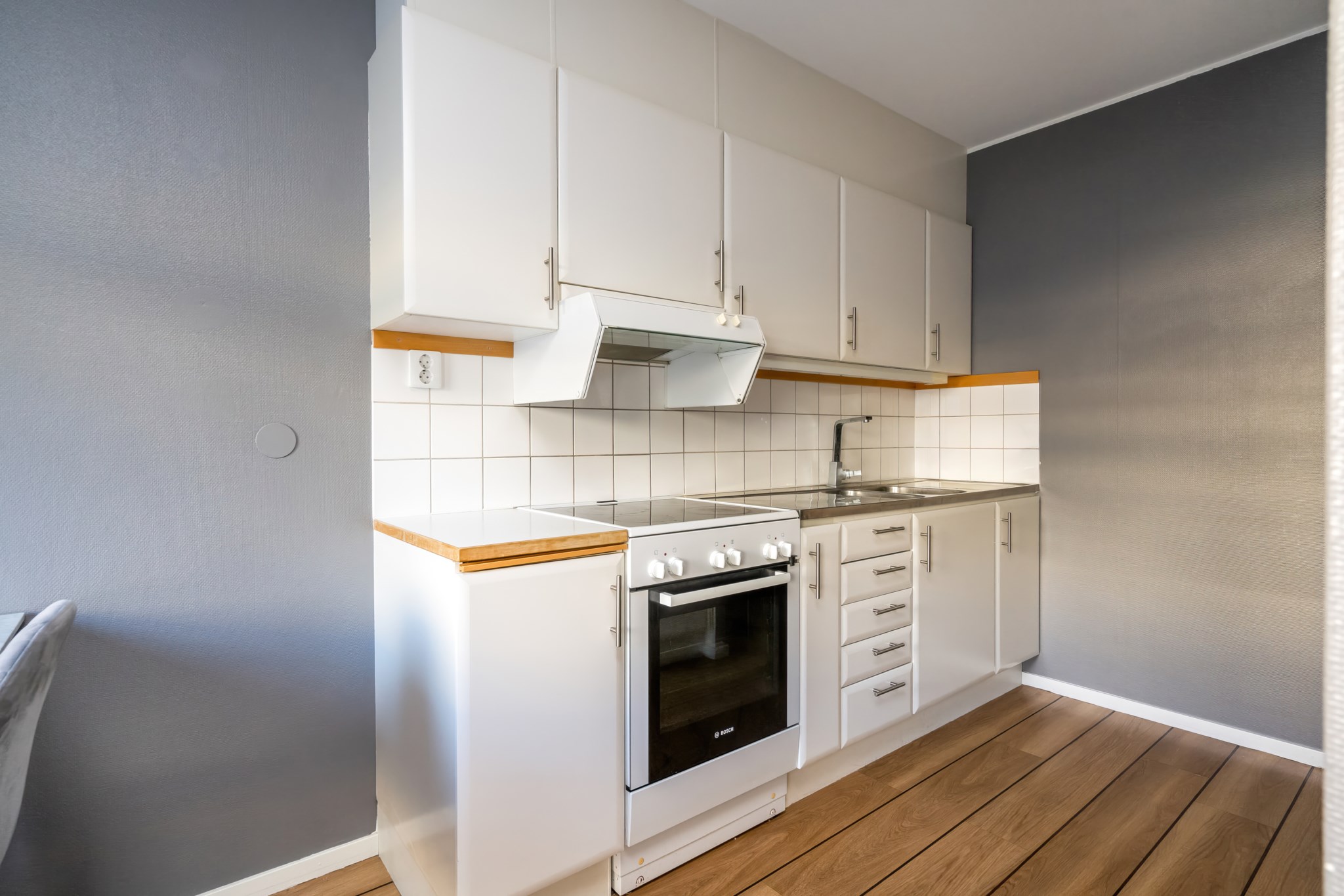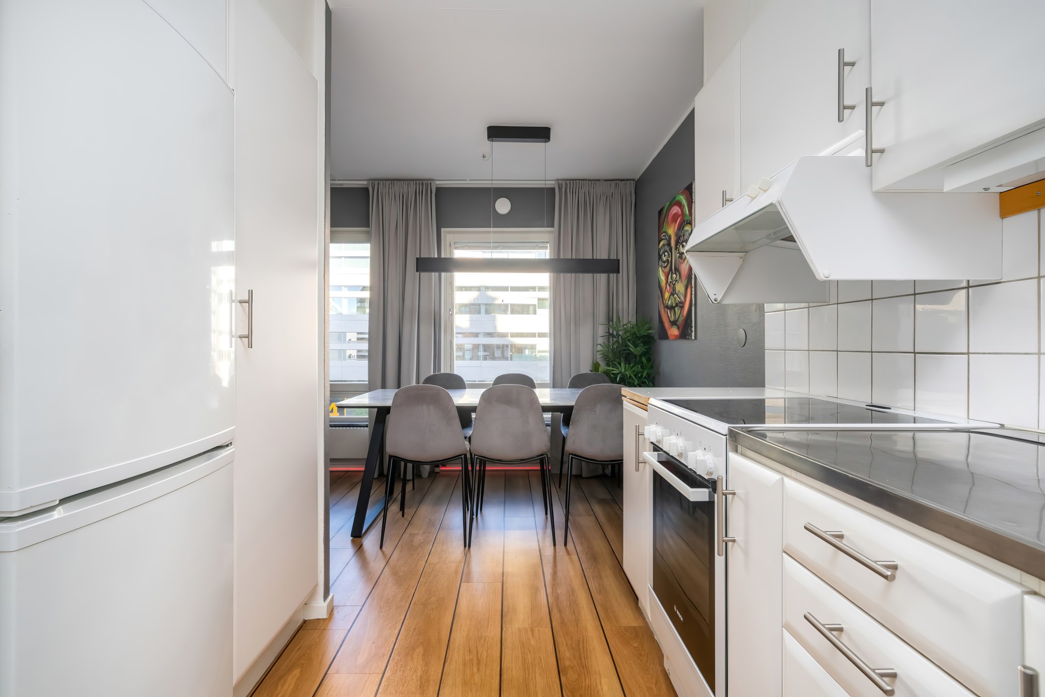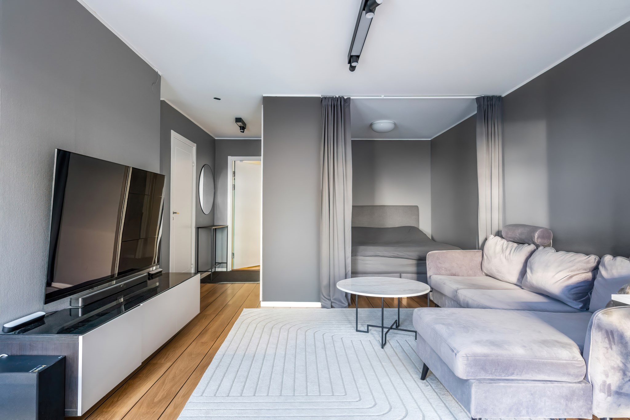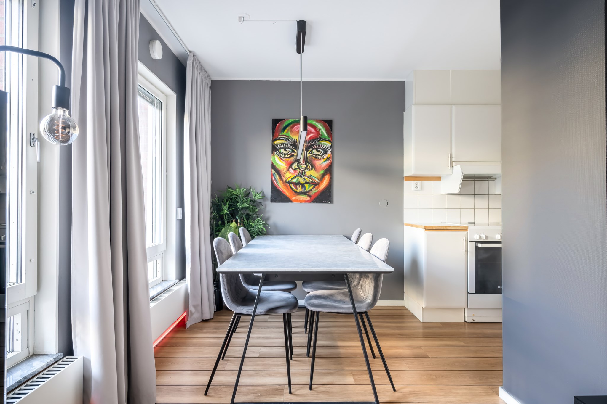 Lägenheten har en genomtänkt planlösning där varje kvadratmeter nyttjas effektivt. Det rymliga vardagsrummet rymmer både soffgrupp och matplats, med stora fönster som släpper in gott om ljus. Den smart avskilda sovalkoven ger en naturlig avdelning mot sällskapsdelen och skapar en tydlig rumsfunktion utan att kompromissa med ytan. Väggarna är målade i sobra, moderna toner och golven i träimitation ger ett varmt, enhetligt intryck.