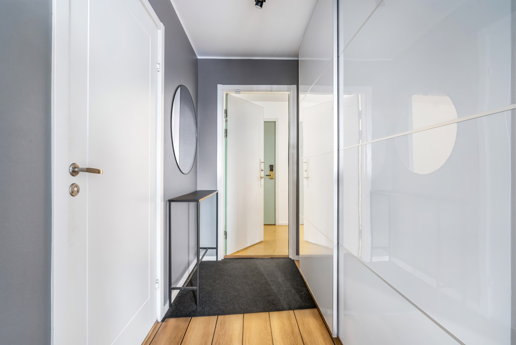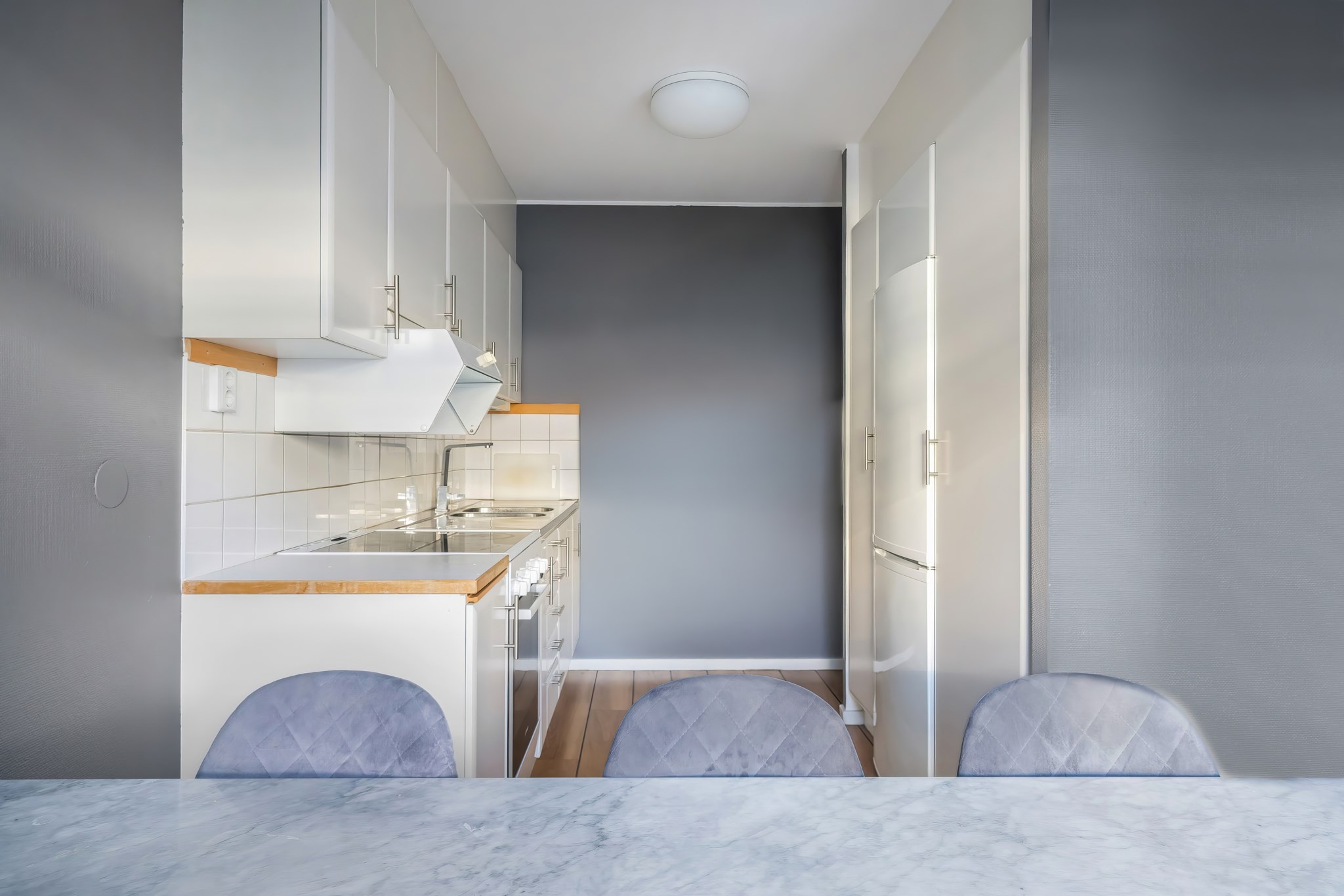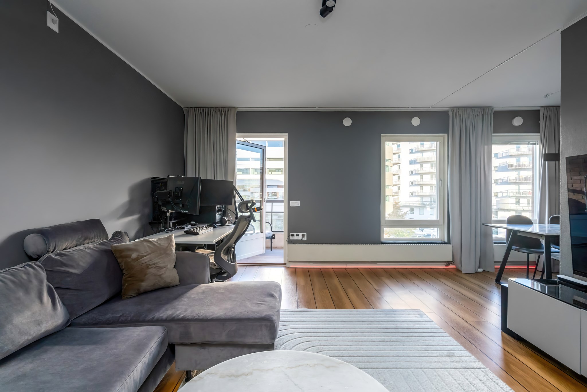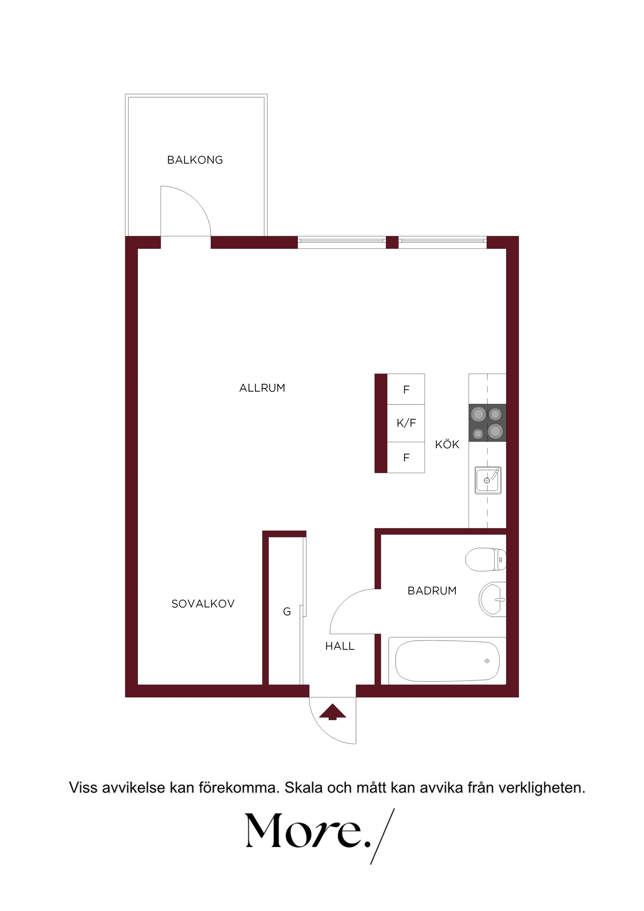 Lägenheten har en genomtänkt planlösning där varje kvadratmeter nyttjas effektivt. Det rymliga vardagsrummet rymmer både soffgrupp och matplats, med stora fönster som släpper in gott om ljus. Den smart avskilda sovalkoven ger en naturlig avdelning mot sällskapsdelen och skapar en tydlig rumsfunktion utan att kompromissa med ytan. Väggarna är målade i sobra, moderna toner och golven i träimitation ger ett varmt, enhetligt intryck.