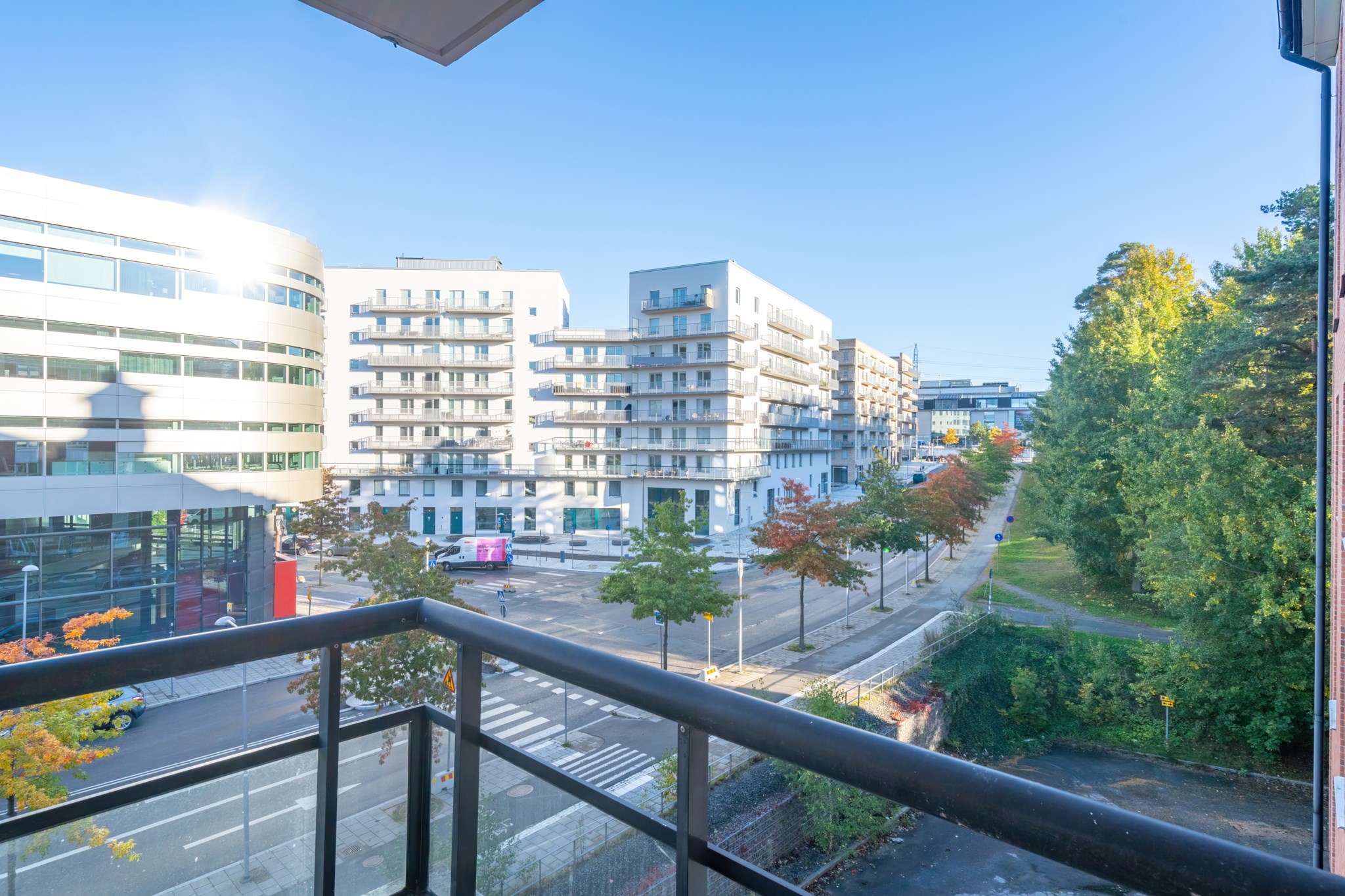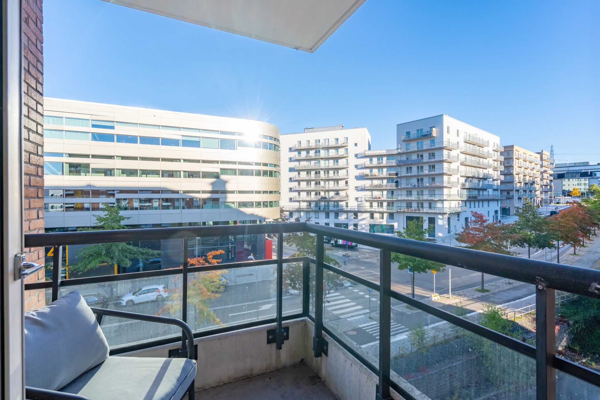 Från vardagsrummet nås balkongen – en perfekt plats för morgonkaffe eller kvällssol med utsikt över området. Härifrån ser du både de moderna kvarteren och grönskan längs gångstråken mot Kista Äng.