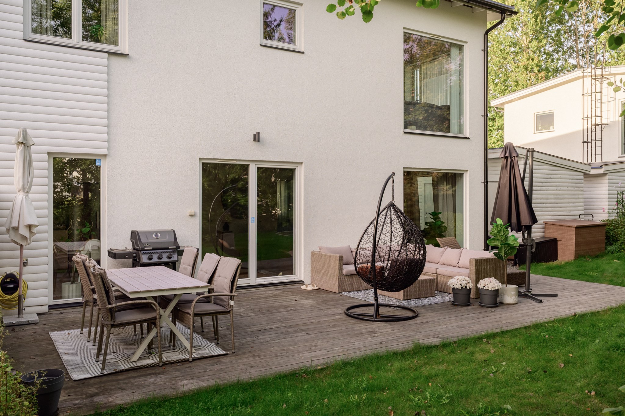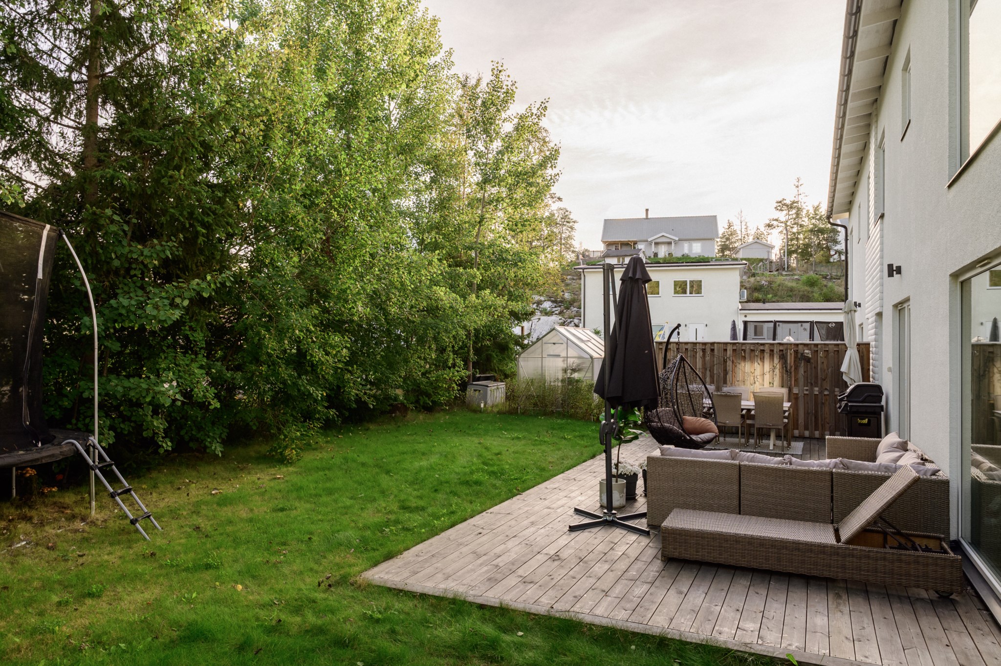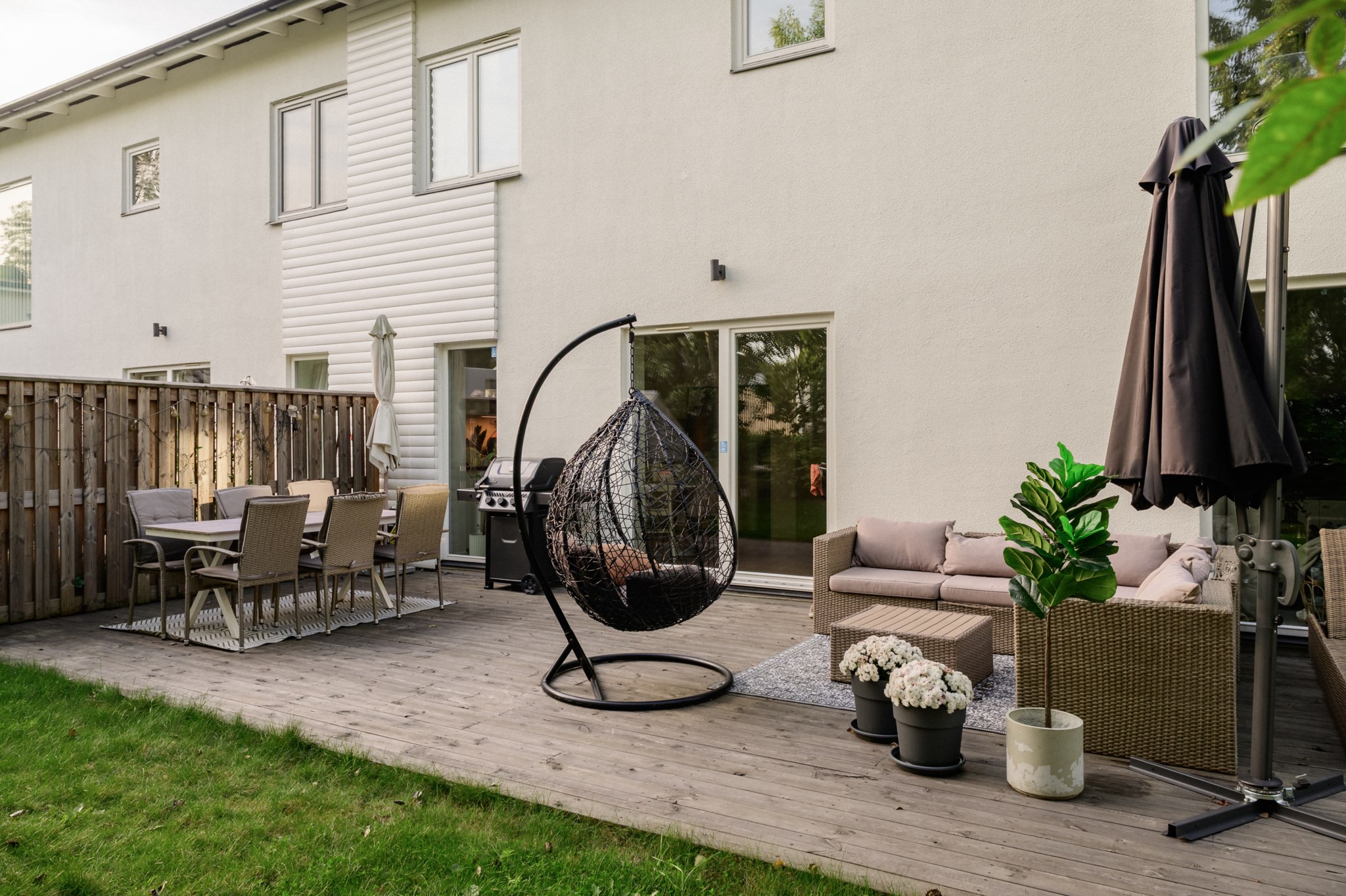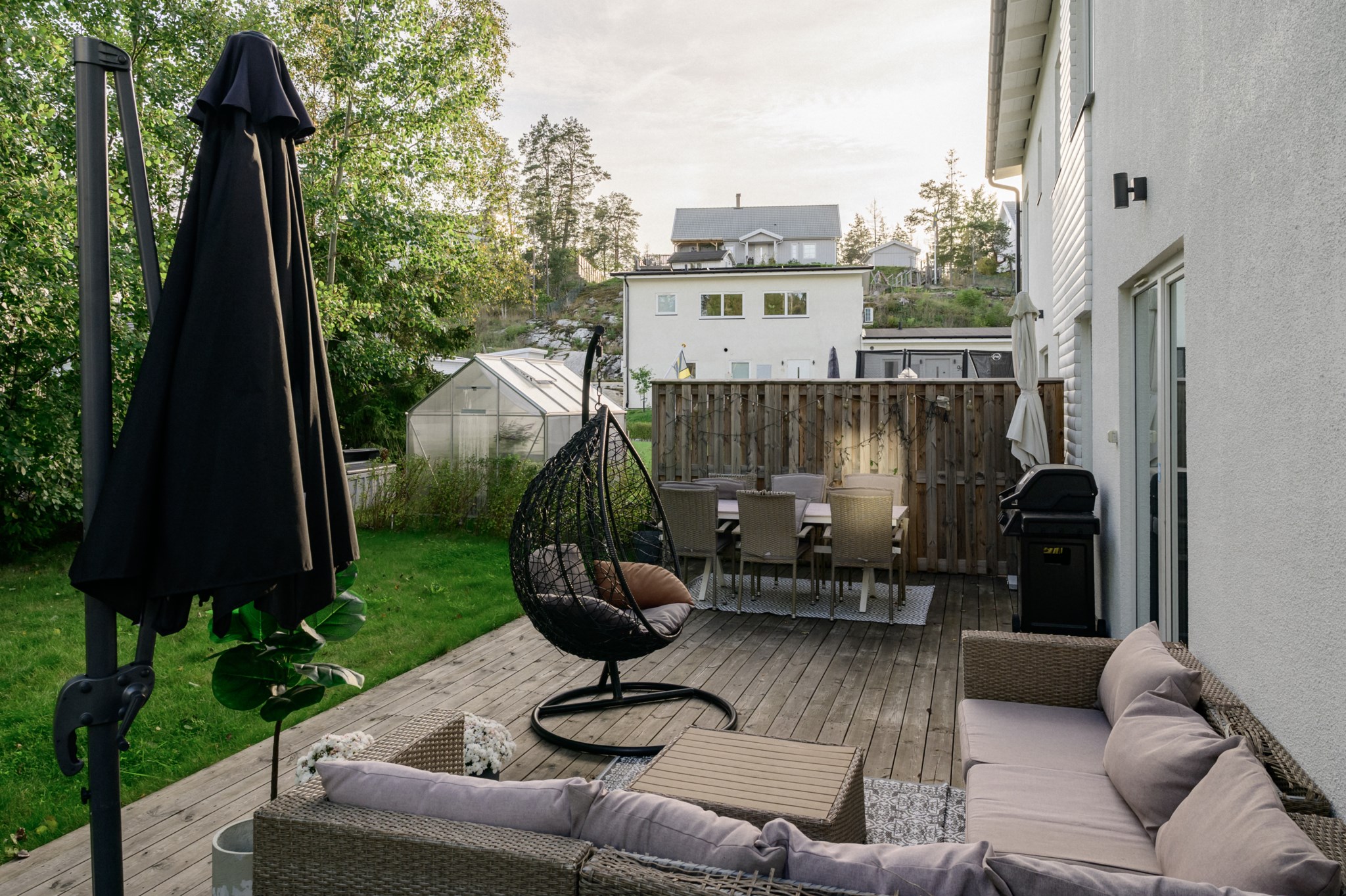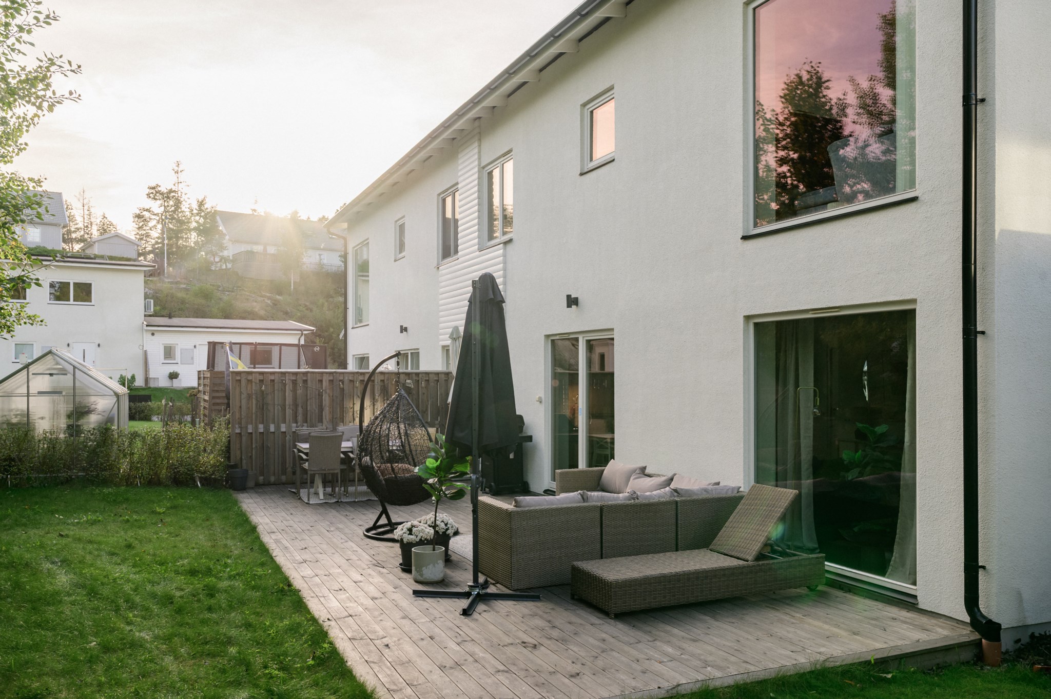 Vardagsrummet är rymligt med stora fönster i två väderstreck, vilket ger ett fantastiskt ljusflöde. Härifrån når du även uteplatsen, där du kan njuta av sommarkvällar eller en kopp kaffe i morgonsolen.