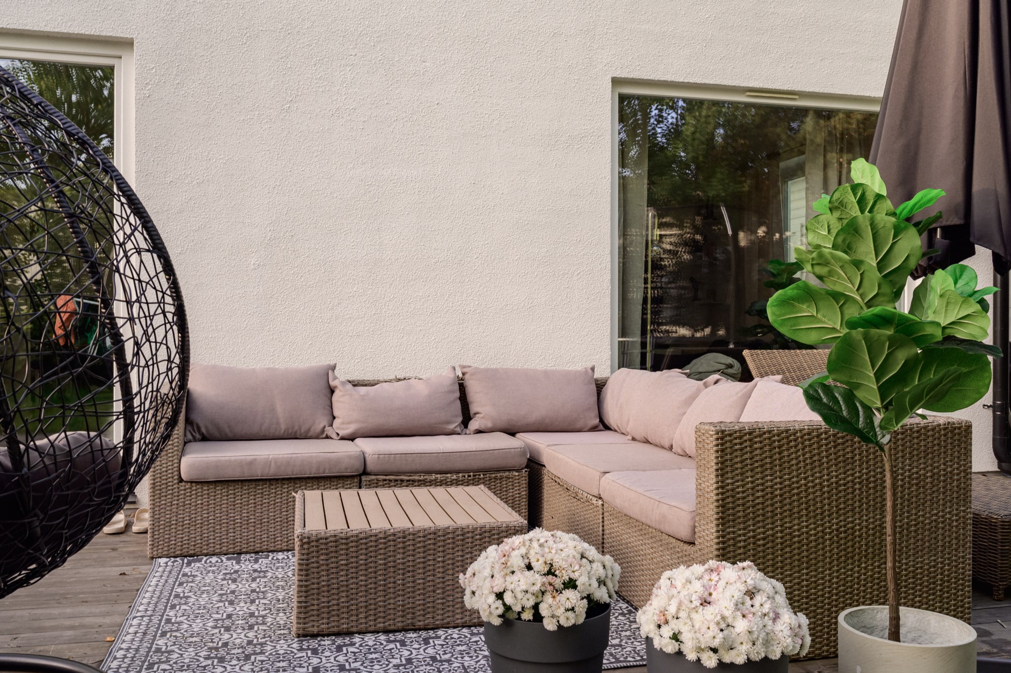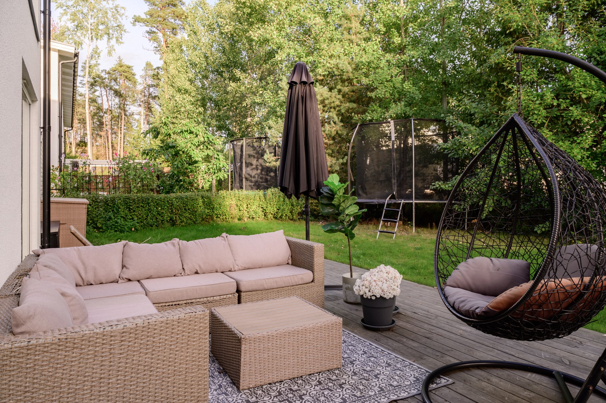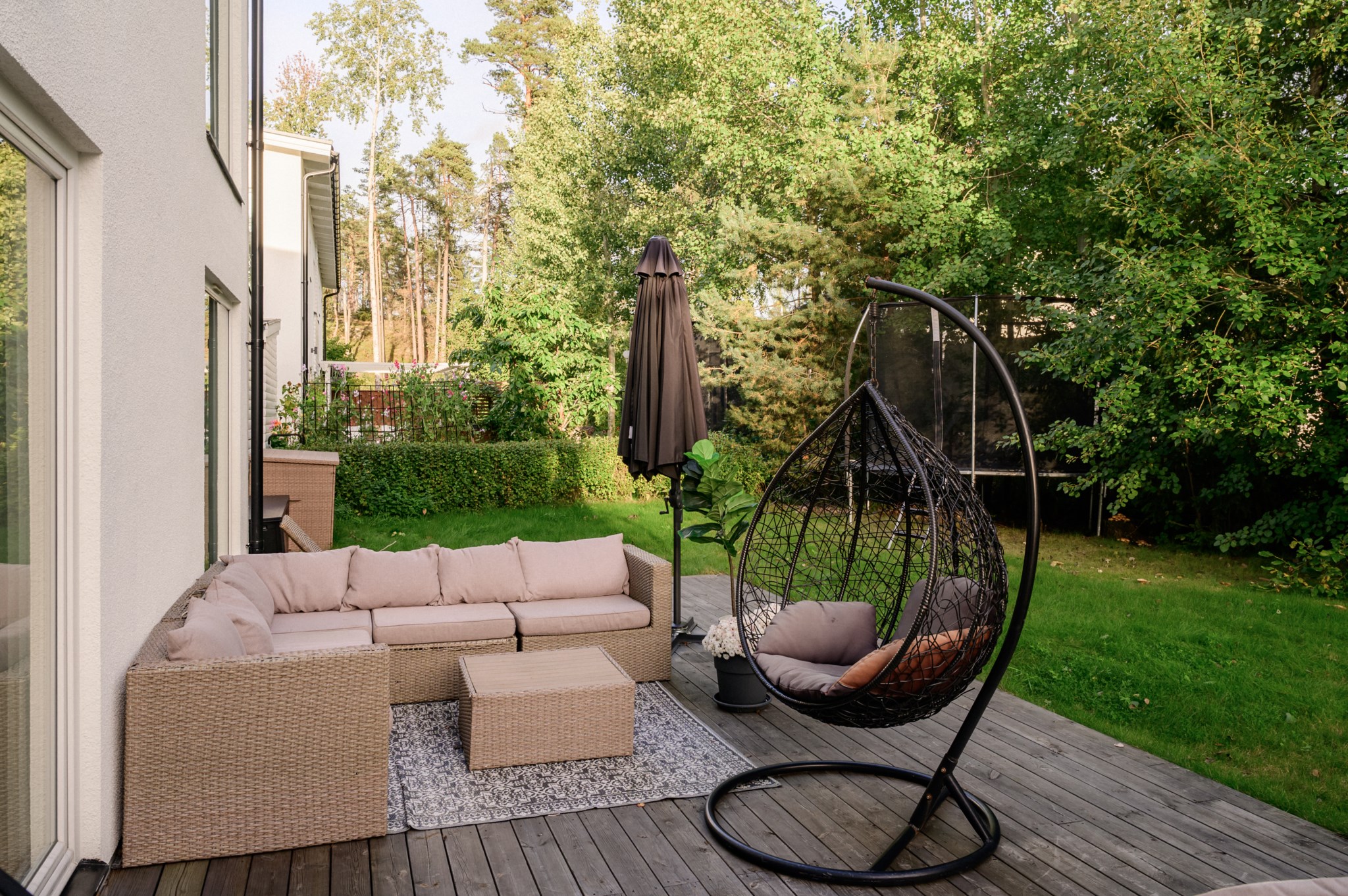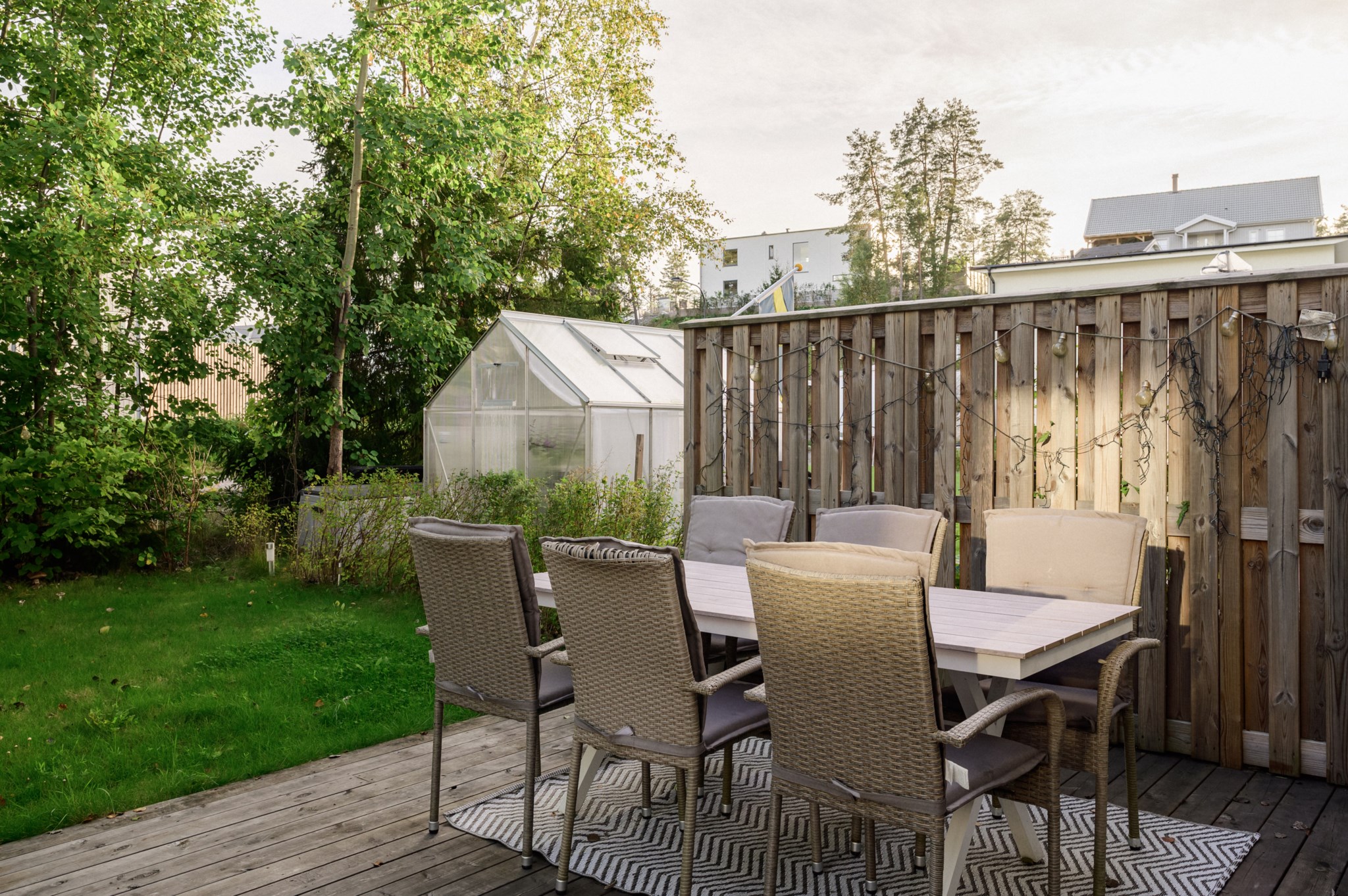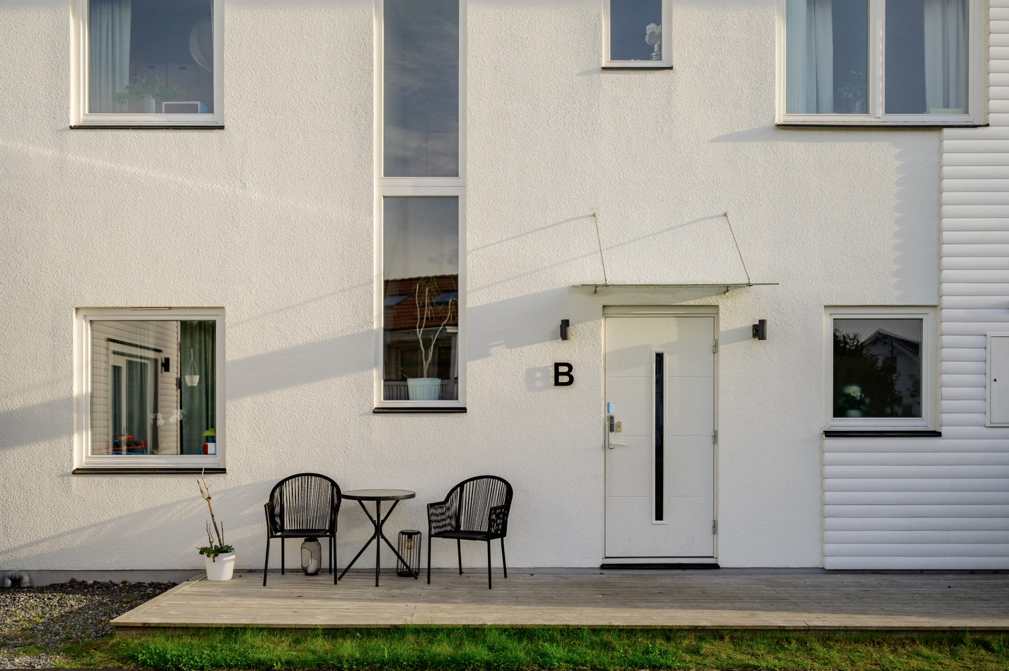 Vardagsrummet är rymligt med stora fönster i två väderstreck, vilket ger ett fantastiskt ljusflöde. Härifrån når du även uteplatsen, där du kan njuta av sommarkvällar eller en kopp kaffe i morgonsolen.