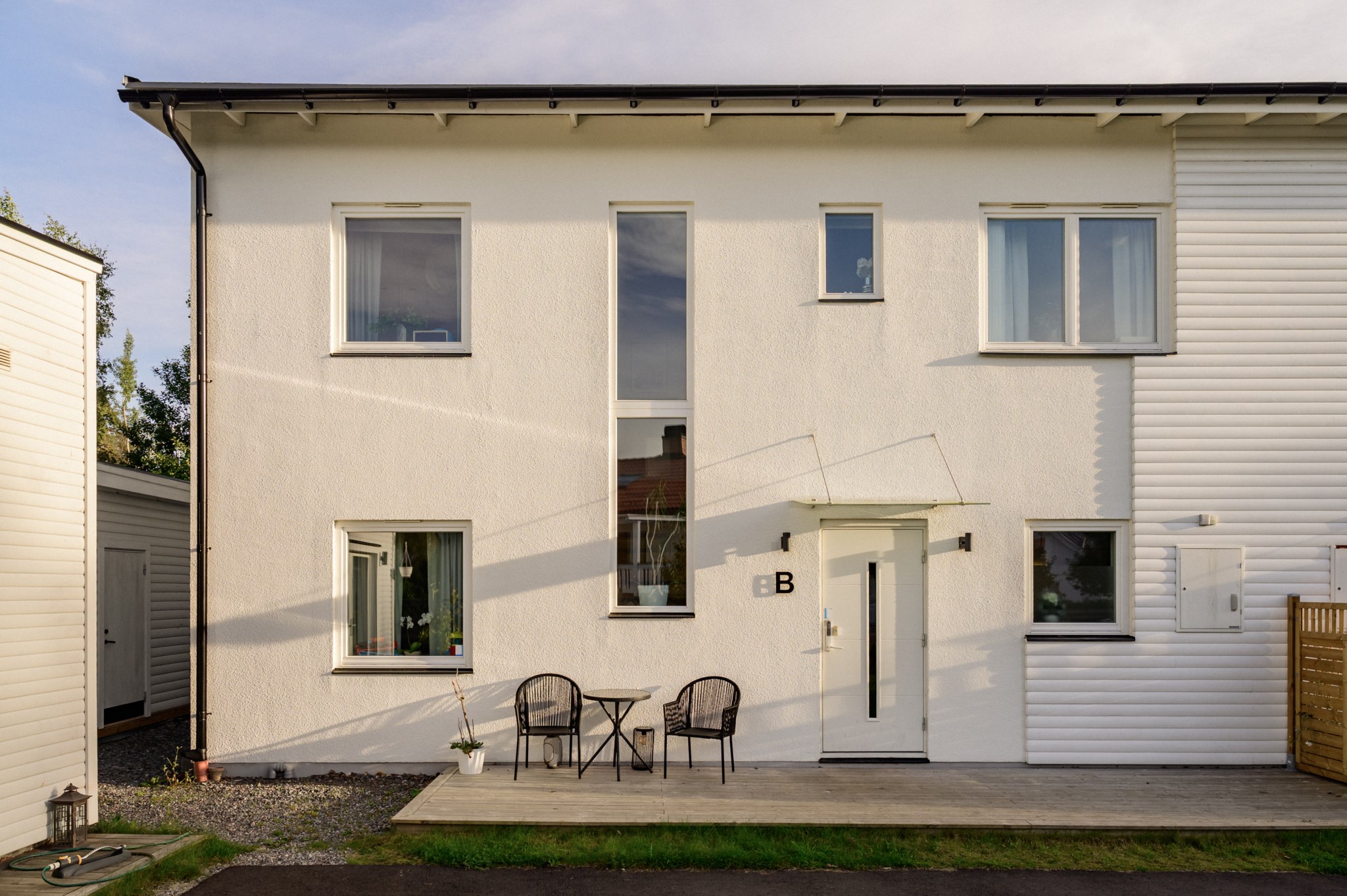 Redan i hallen möts du av ett härligt ljusinsläpp och stilrena ytskikt. Det smakfulla köket i vitt erbjuder gott om förvaring och arbetsyta, samtidigt som den öppna planlösningen mot matplats och vardagsrum skapar en social och luftig känsla.
