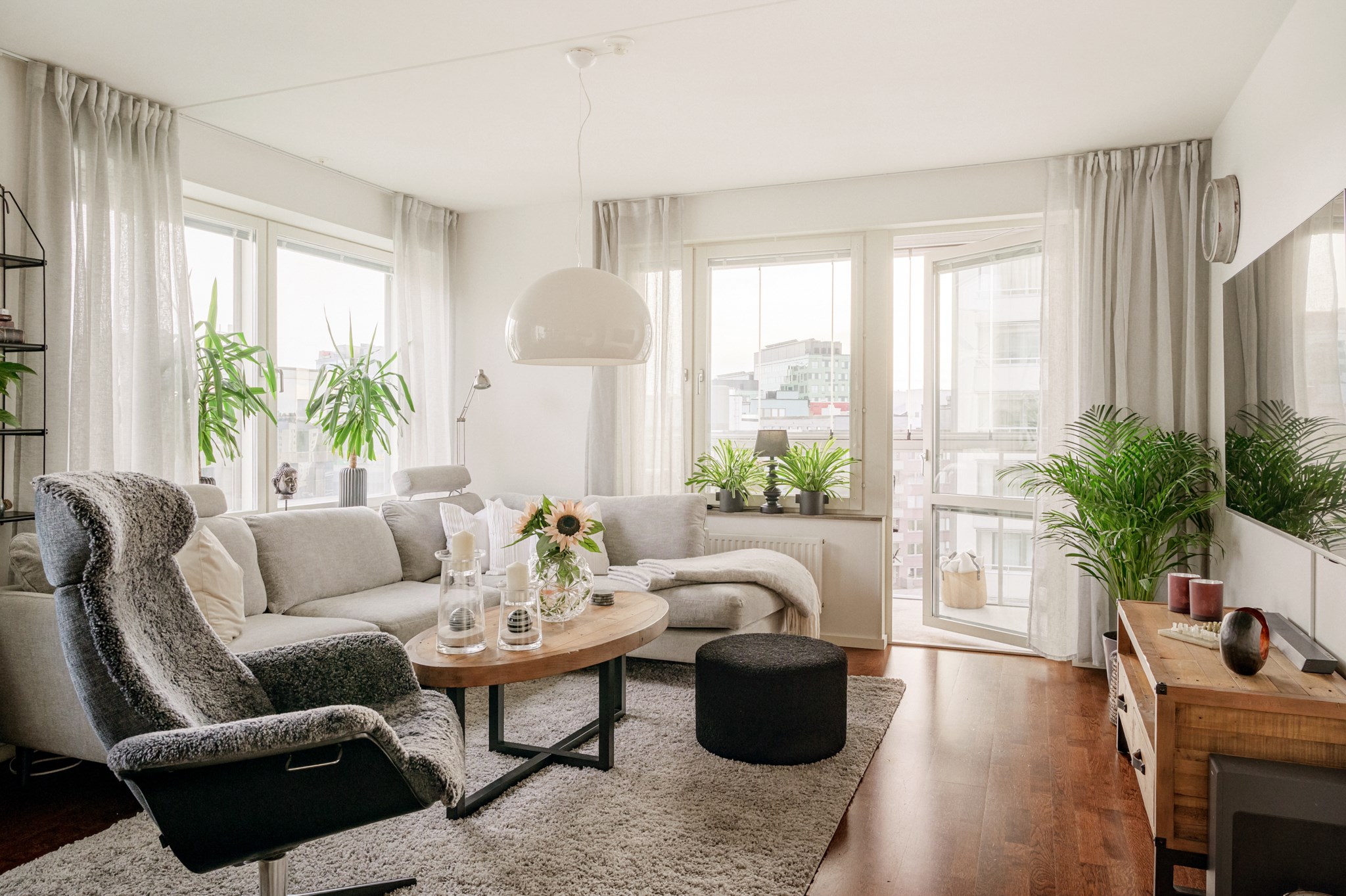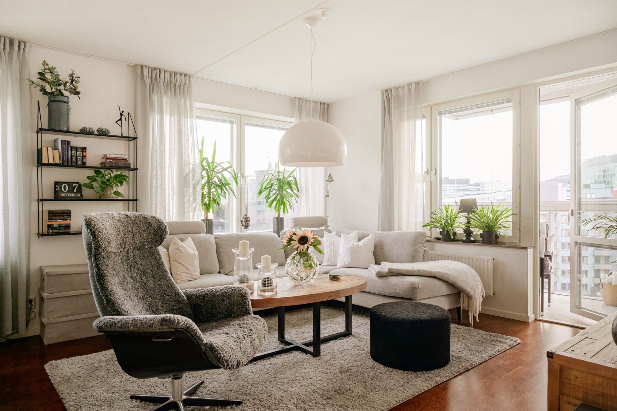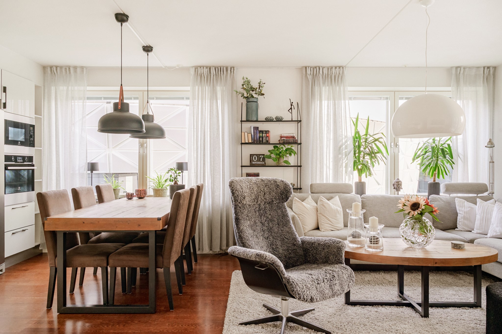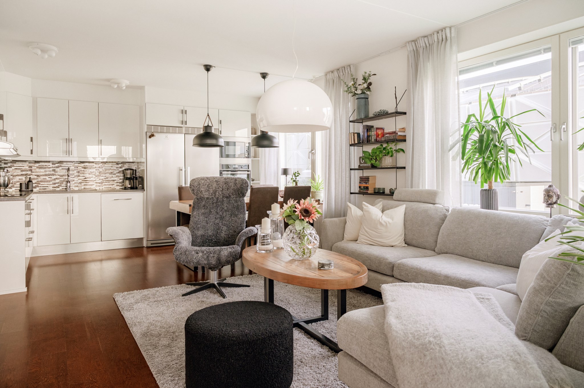 Köket är modernt och fullt utrustat med generösa arbetsytor, bra förvaring och tidlösa materialval som harmonierar med bostadens övriga stil. Intill finns en naturlig matplats invid fönsterpartier där ljuset flödar in från två väderstreck. Vardagsrummet erbjuder gott om plats för både soffgrupp och sociala ytor, och den öppna känslan förstärks av den höga placeringen i huset.