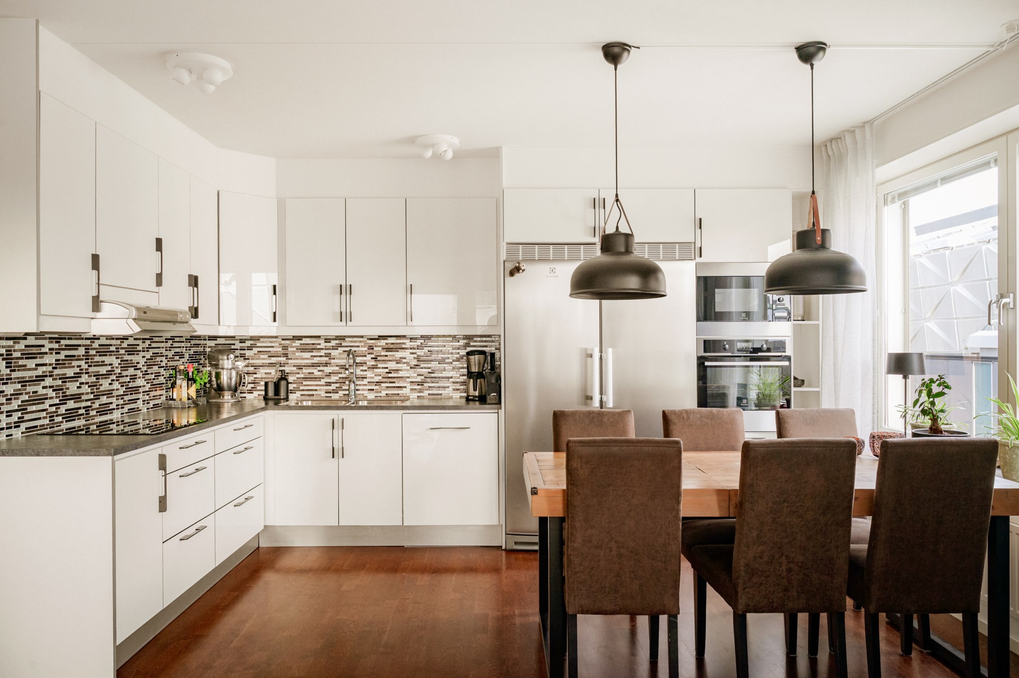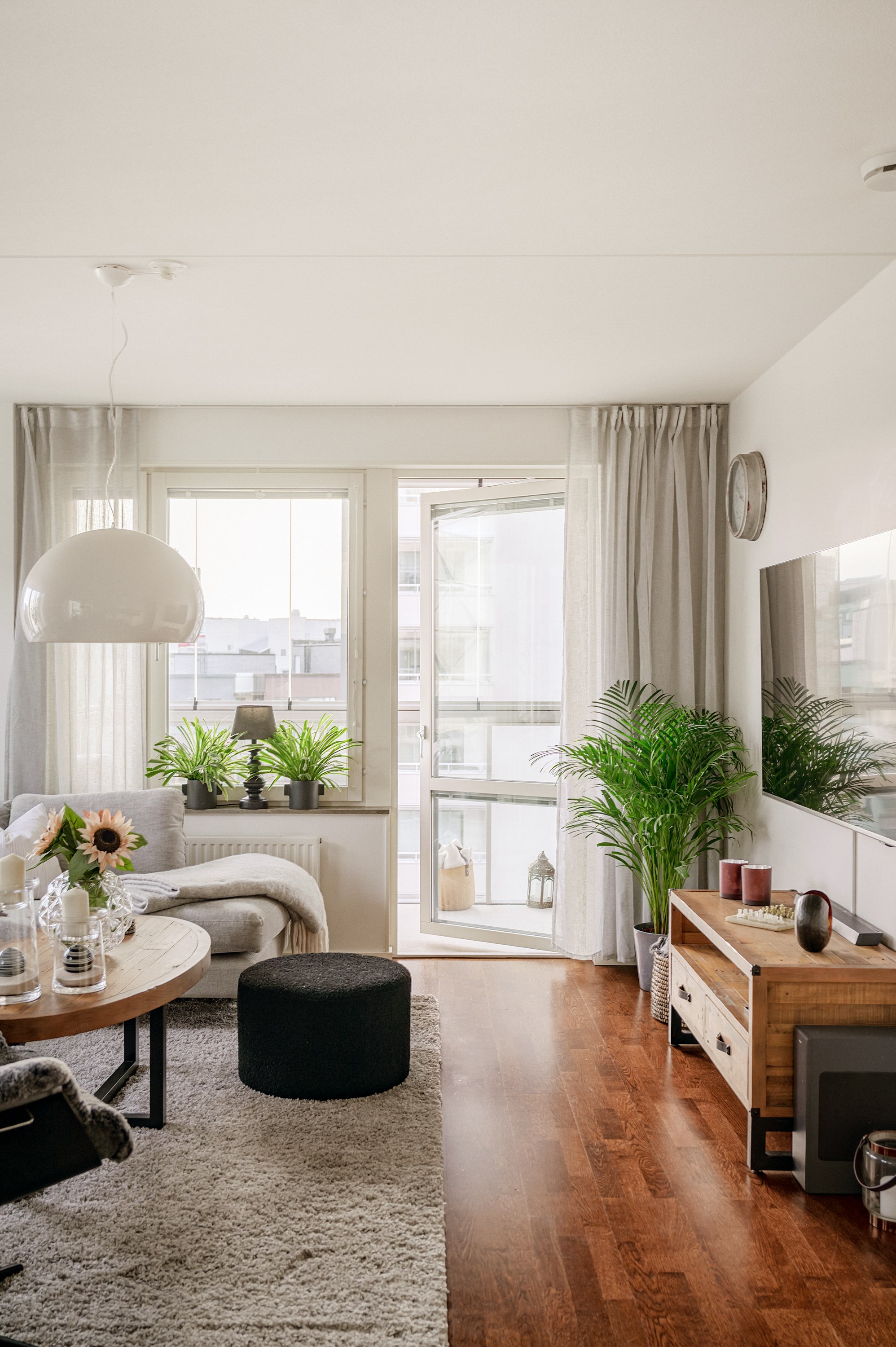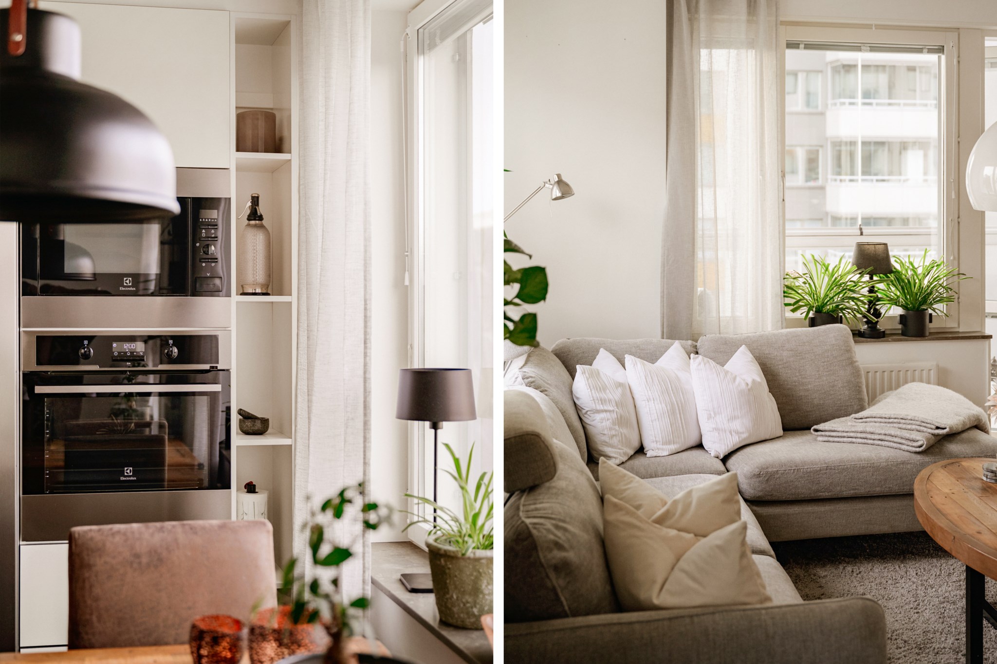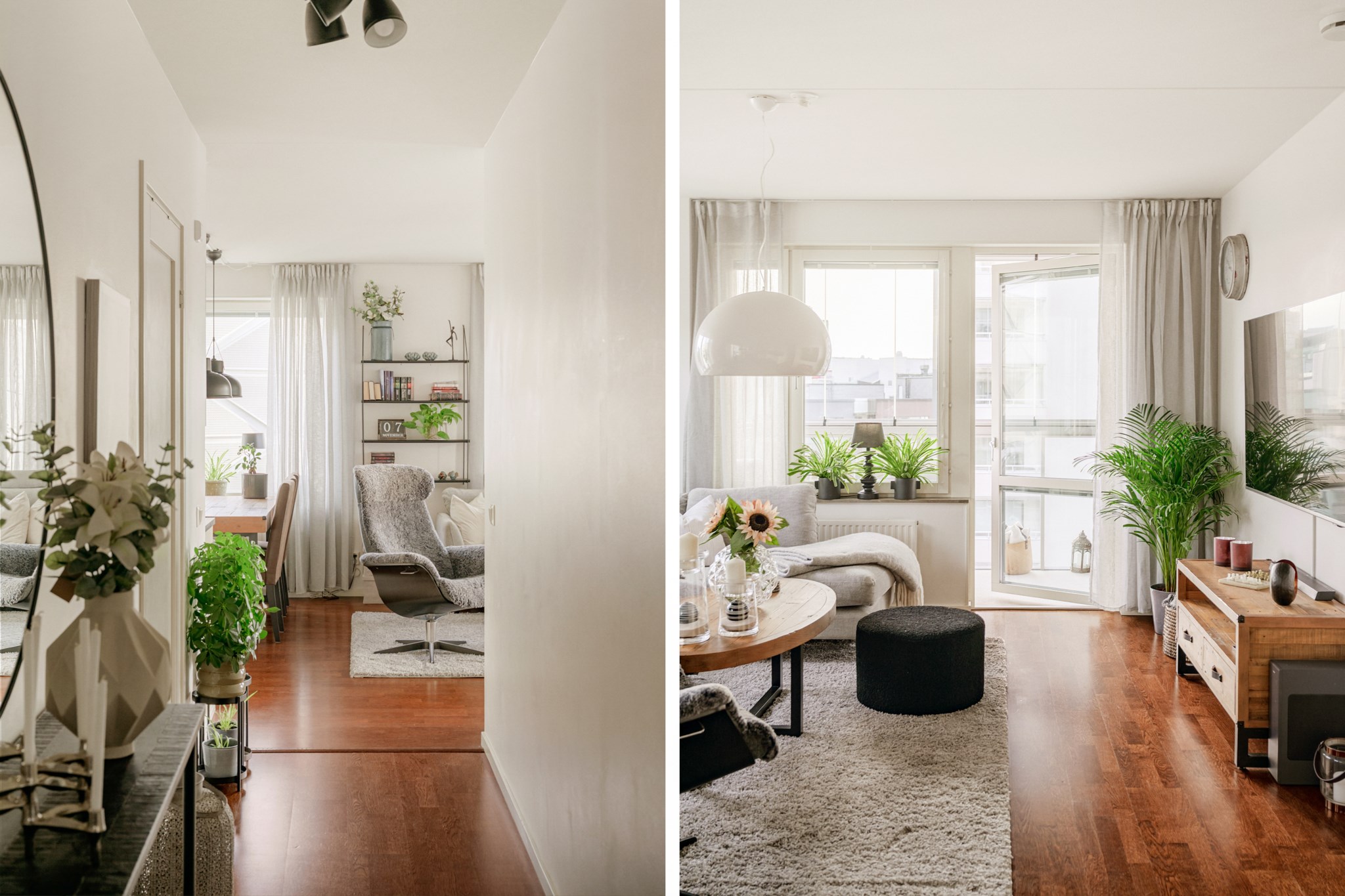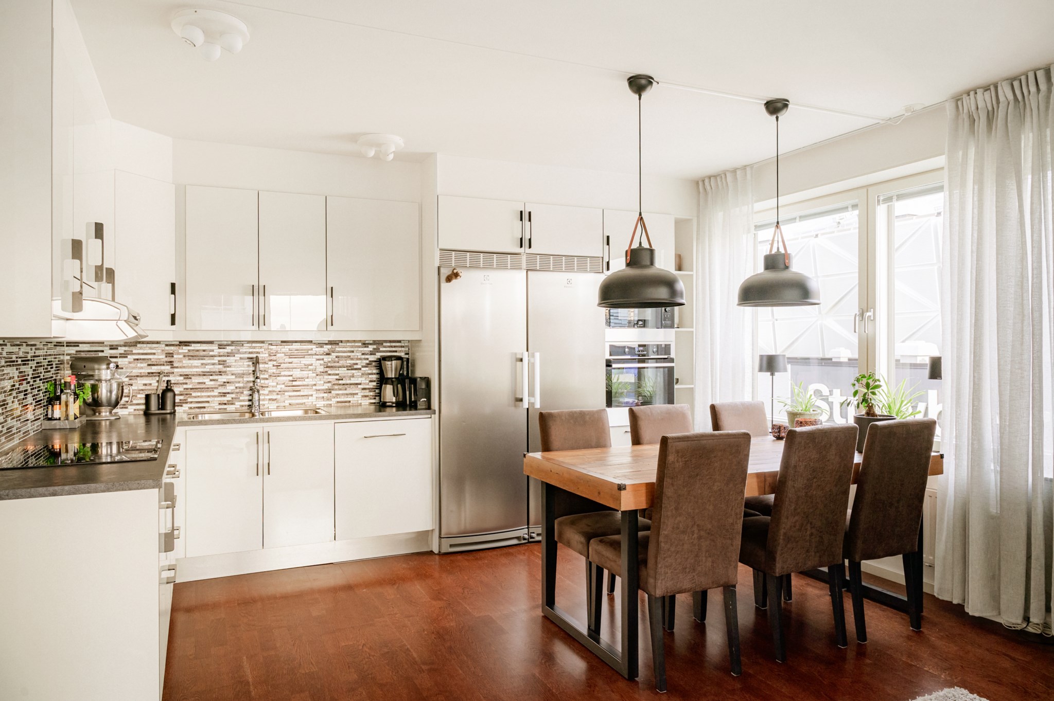 Köket är modernt och fullt utrustat med generösa arbetsytor, bra förvaring och tidlösa materialval som harmonierar med bostadens övriga stil. Intill finns en naturlig matplats invid fönsterpartier där ljuset flödar in från två väderstreck. Vardagsrummet erbjuder gott om plats för både soffgrupp och sociala ytor, och den öppna känslan förstärks av den höga placeringen i huset.