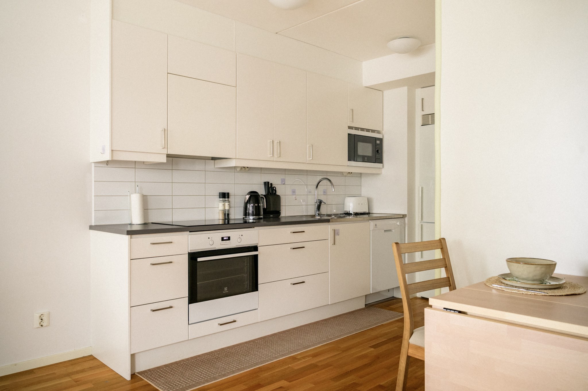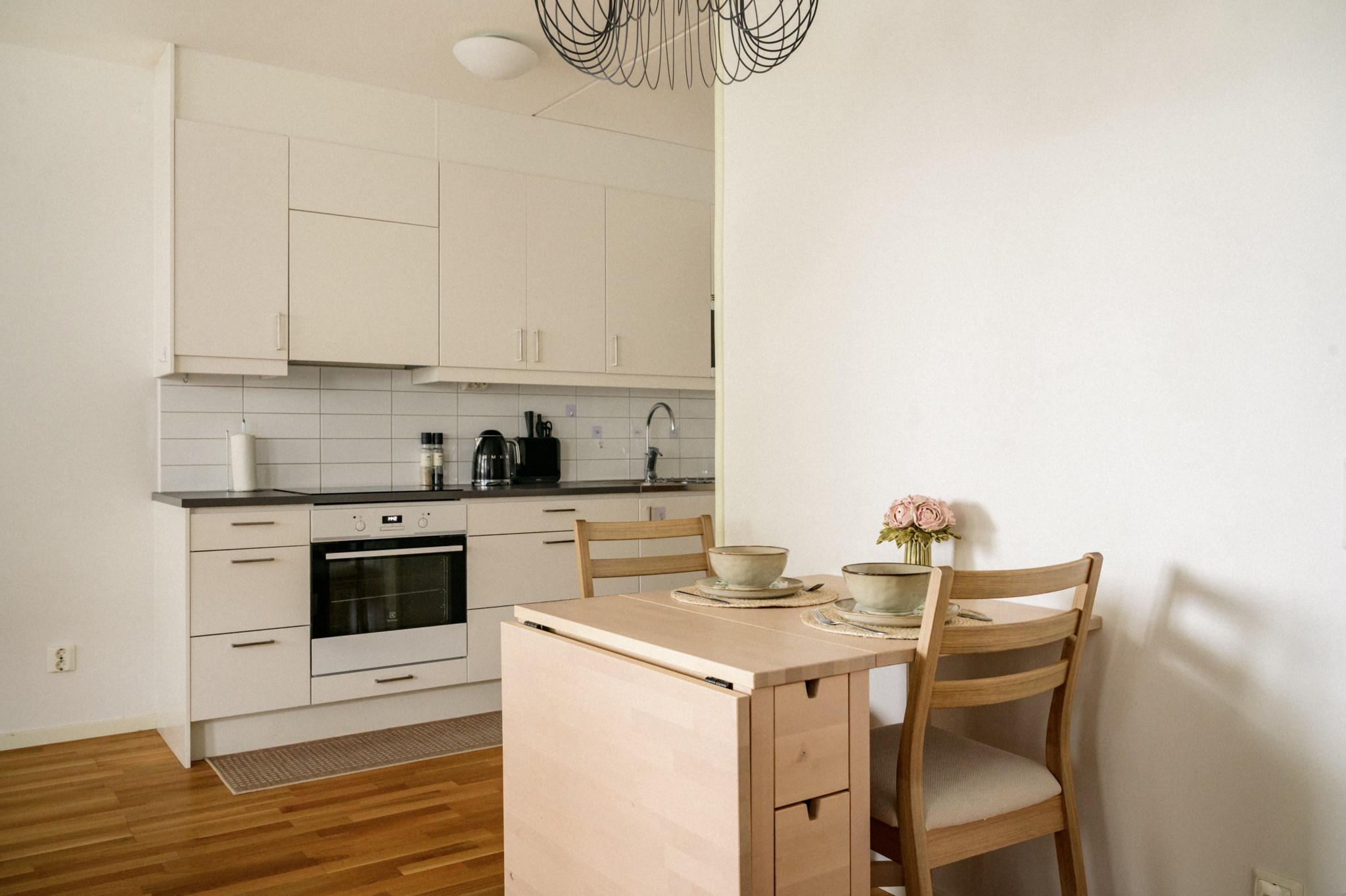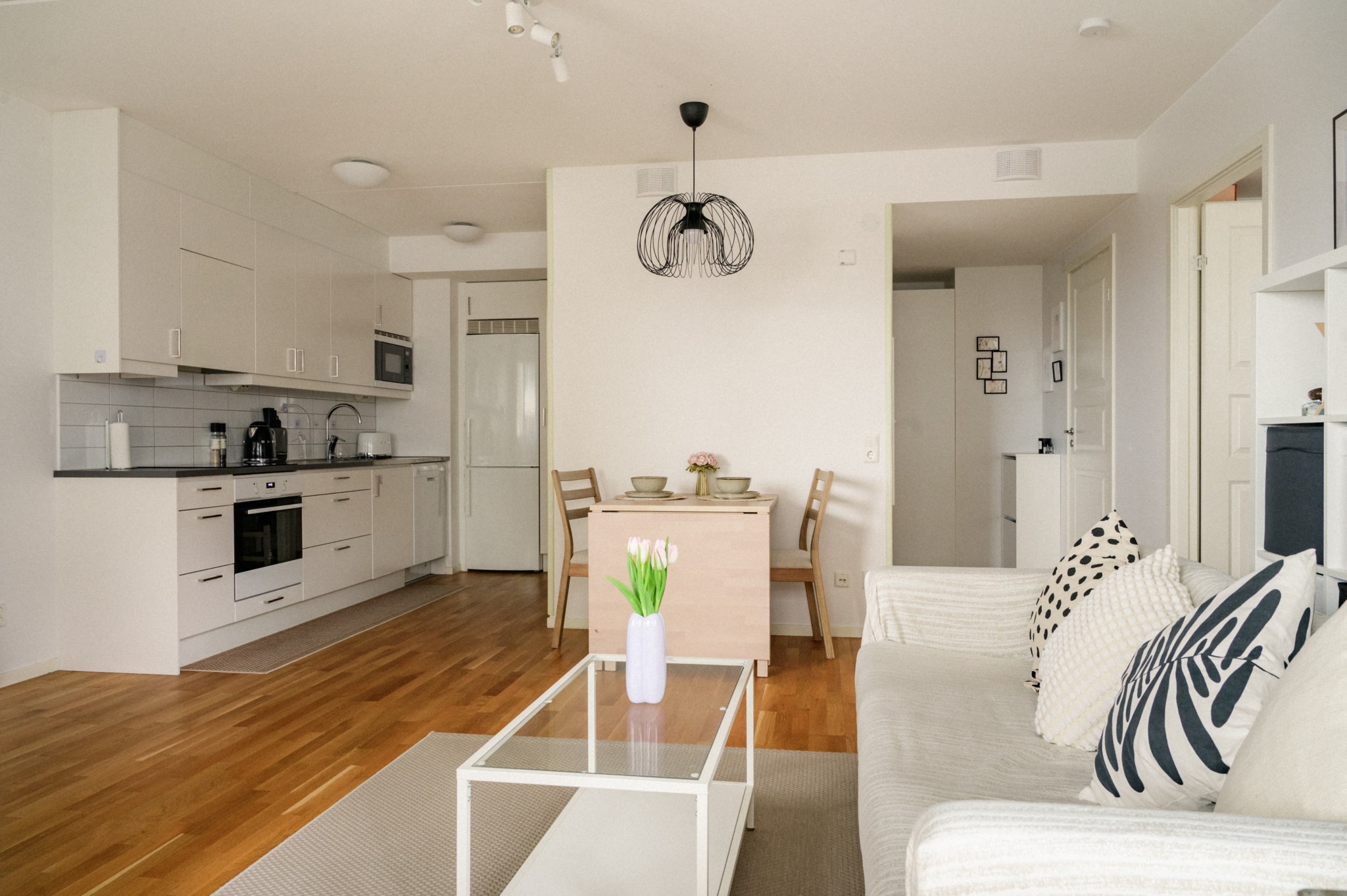 Planlösningen är genomtänkt med sociala ytor där kök och vardagsrum möts i en öppen och elegant helhet. Köket är modernt och fullt utrustat med goda arbetsytor och förvaring, perfekt för både vardagsmatlagning och middagar med vänner. Vardagsrummet rymmer enkelt både soffgrupp och matplats utan att kompromissa med luftig känsla. Sovrummet är rofyllt och väl tilltaget med plats för dubbelsäng, förvaring och arbetsyta, vilket gör bostaden idealisk även för dig som arbetar hemifrån. Badrummet håller en hög standard med stilrena ytskikt och bekvämligheter som förenklar vardagen.