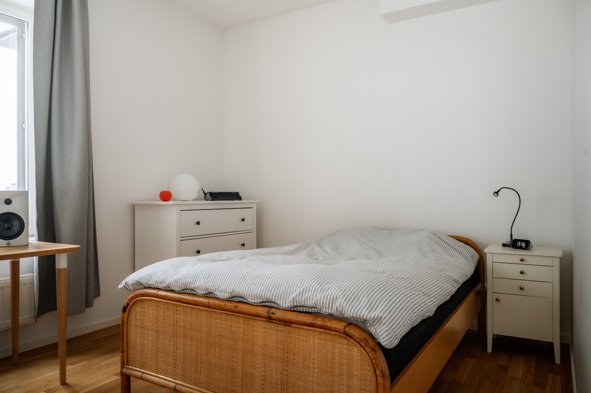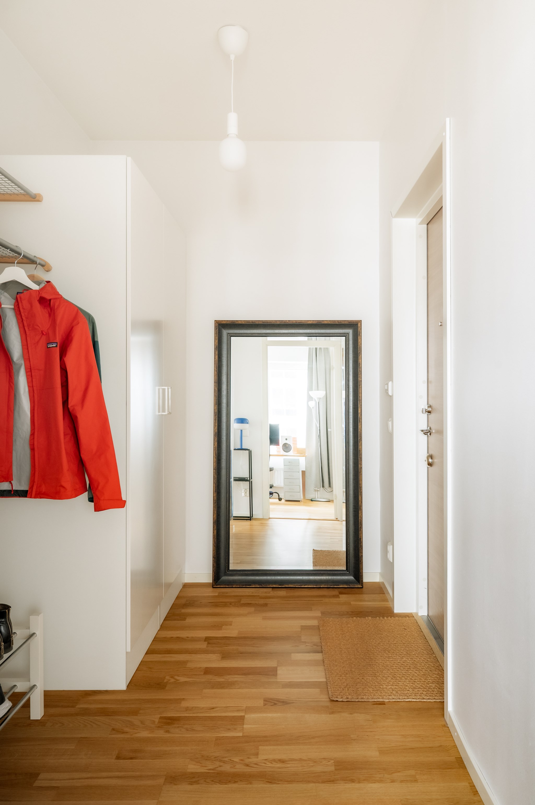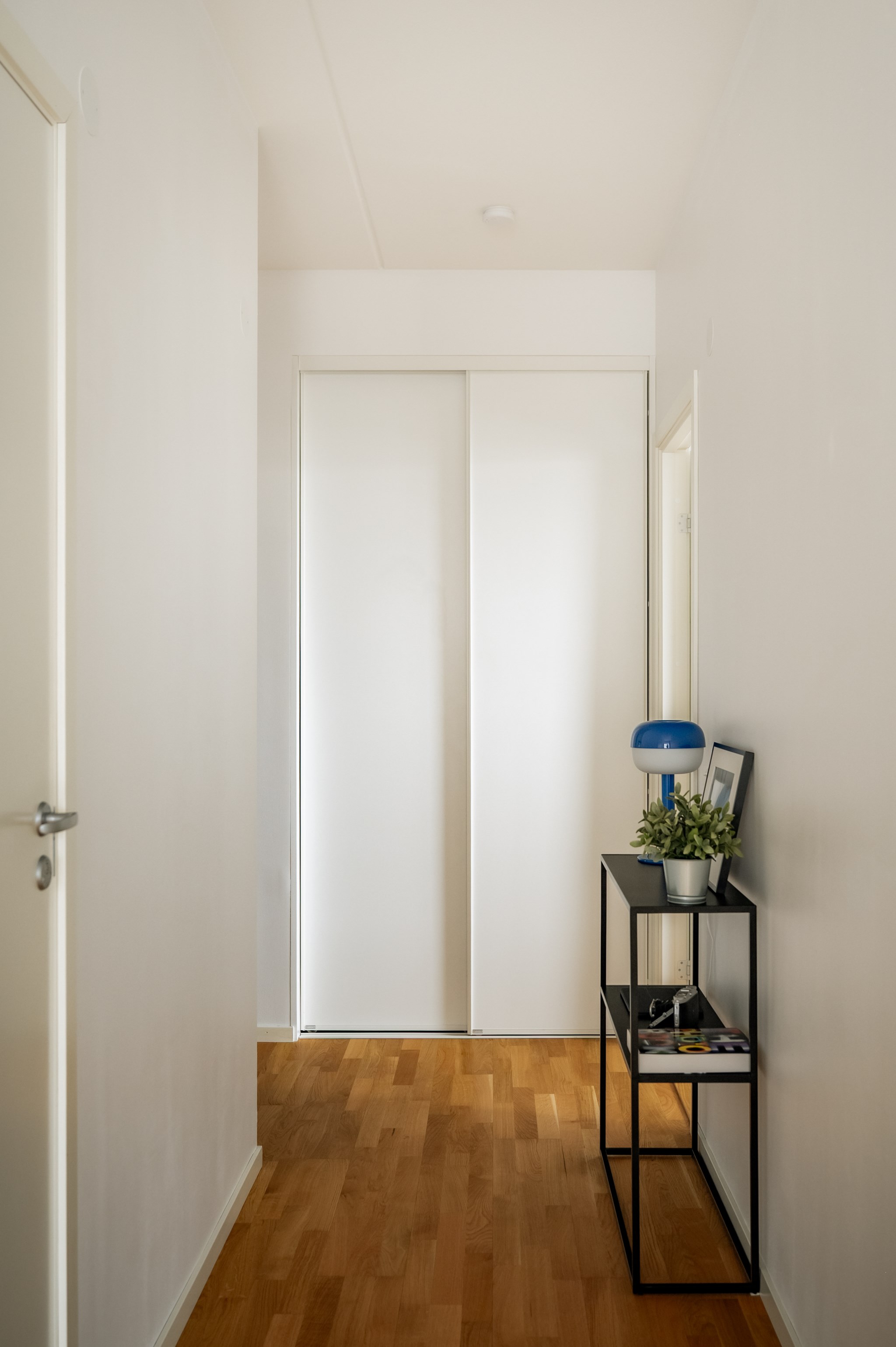 Sovrummet är rofyllt placerat och erbjuder gott om förvaring genom en garderobsvägg. Det helkaklade badrummet är modernt utrustat med tvättmaskin och torktumlare vilket ger en bekväm vardag. I hallen finns ytterligare förvaringsmöjligheter samt ett praktiskt förråd i lägenheten.