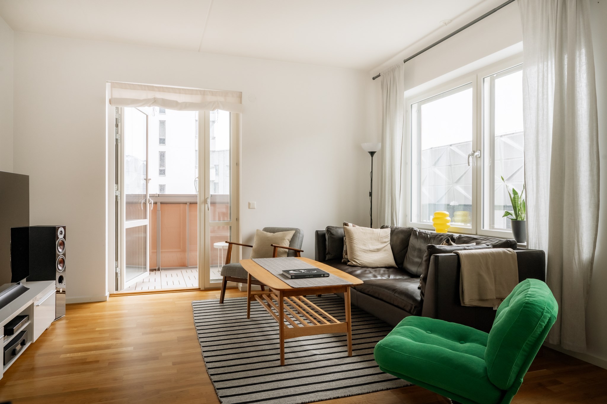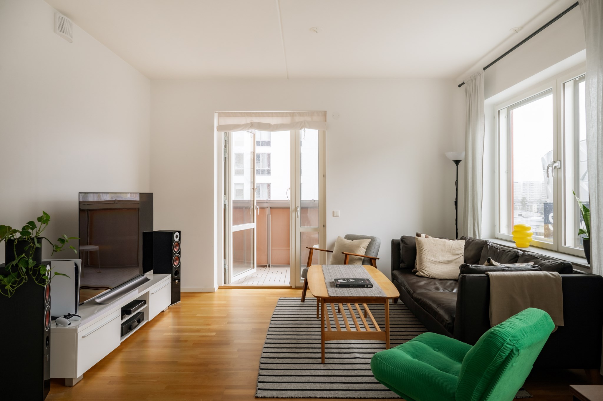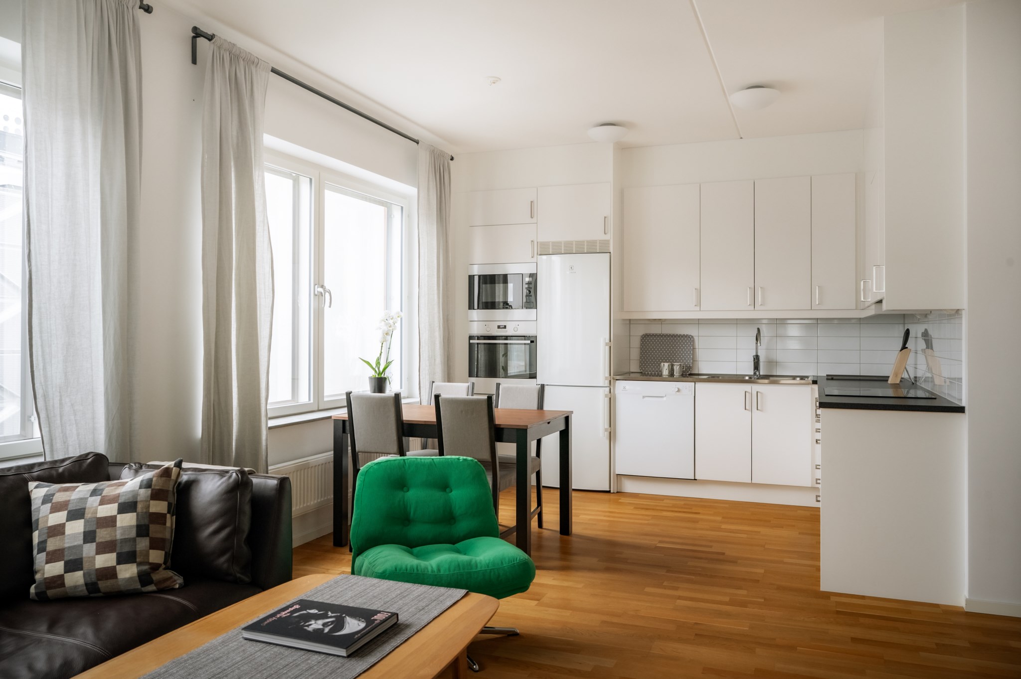 Bostadens sociala ytor präglas av den öppna planlösningen mellan kök och vardagsrum där det finns gott om plats för både soffgrupp och matplats. Köket är stilrent och funktionellt med goda arbetsytor och förvaring. Från vardagsrummet nås den inglasade balkongen som fungerar som ett extra sällskapsrum under stora delar av året.