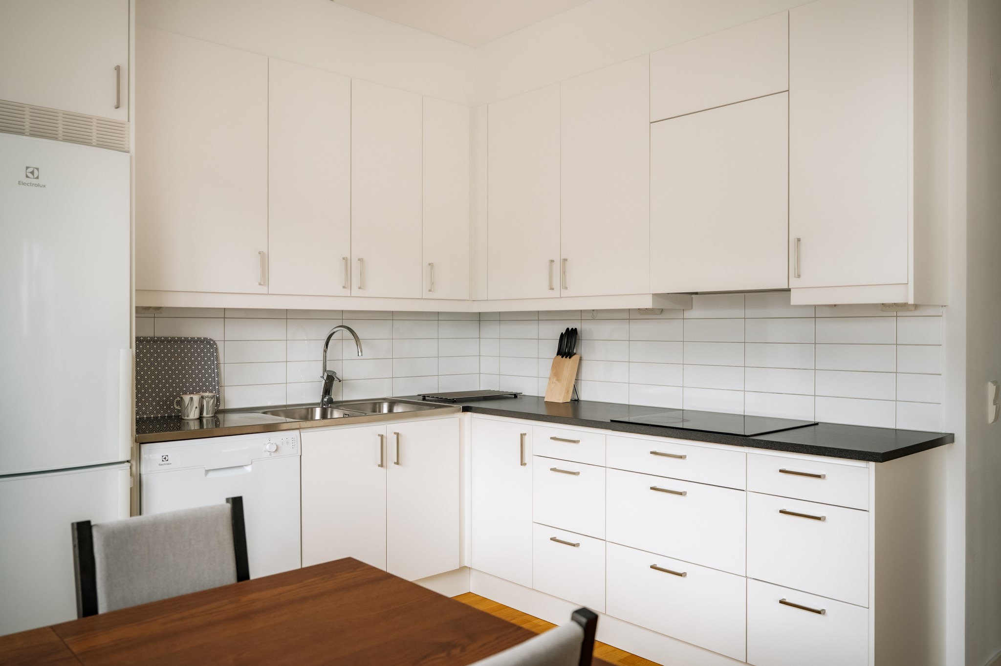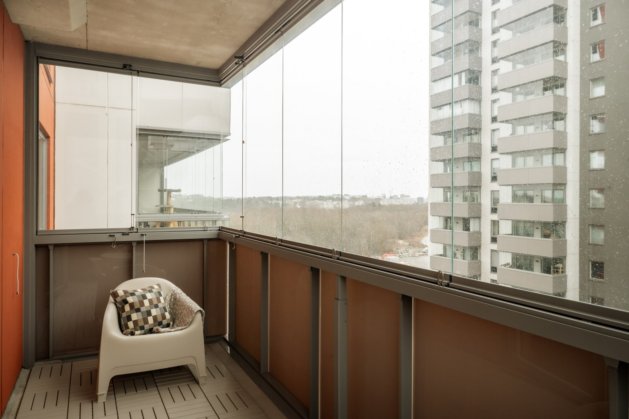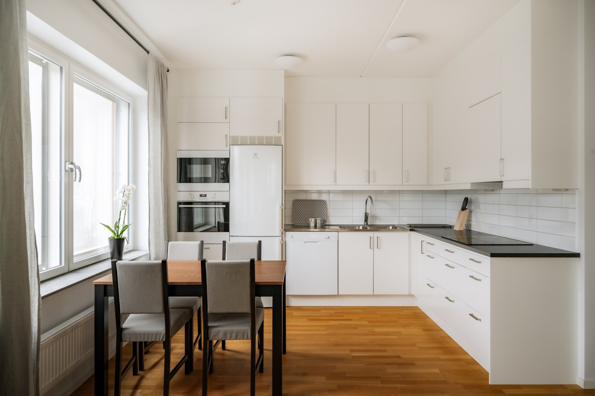 Bostadens sociala ytor präglas av den öppna planlösningen mellan kök och vardagsrum där det finns gott om plats för både soffgrupp och matplats. Köket är stilrent och funktionellt med goda arbetsytor och förvaring. Från vardagsrummet nås den inglasade balkongen som fungerar som ett extra sällskapsrum under stora delar av året.