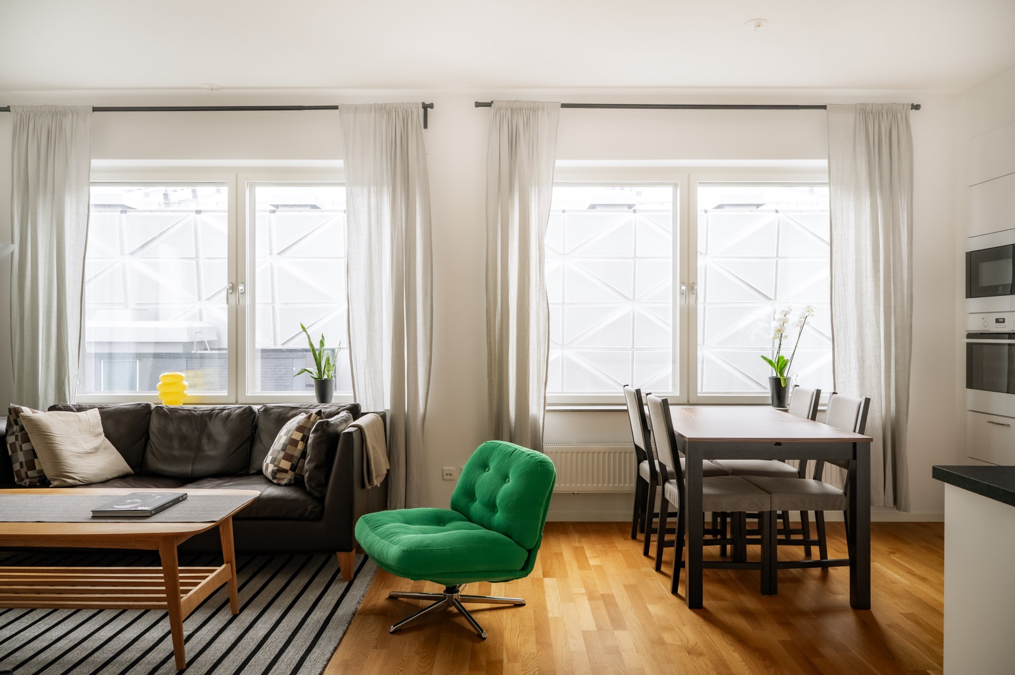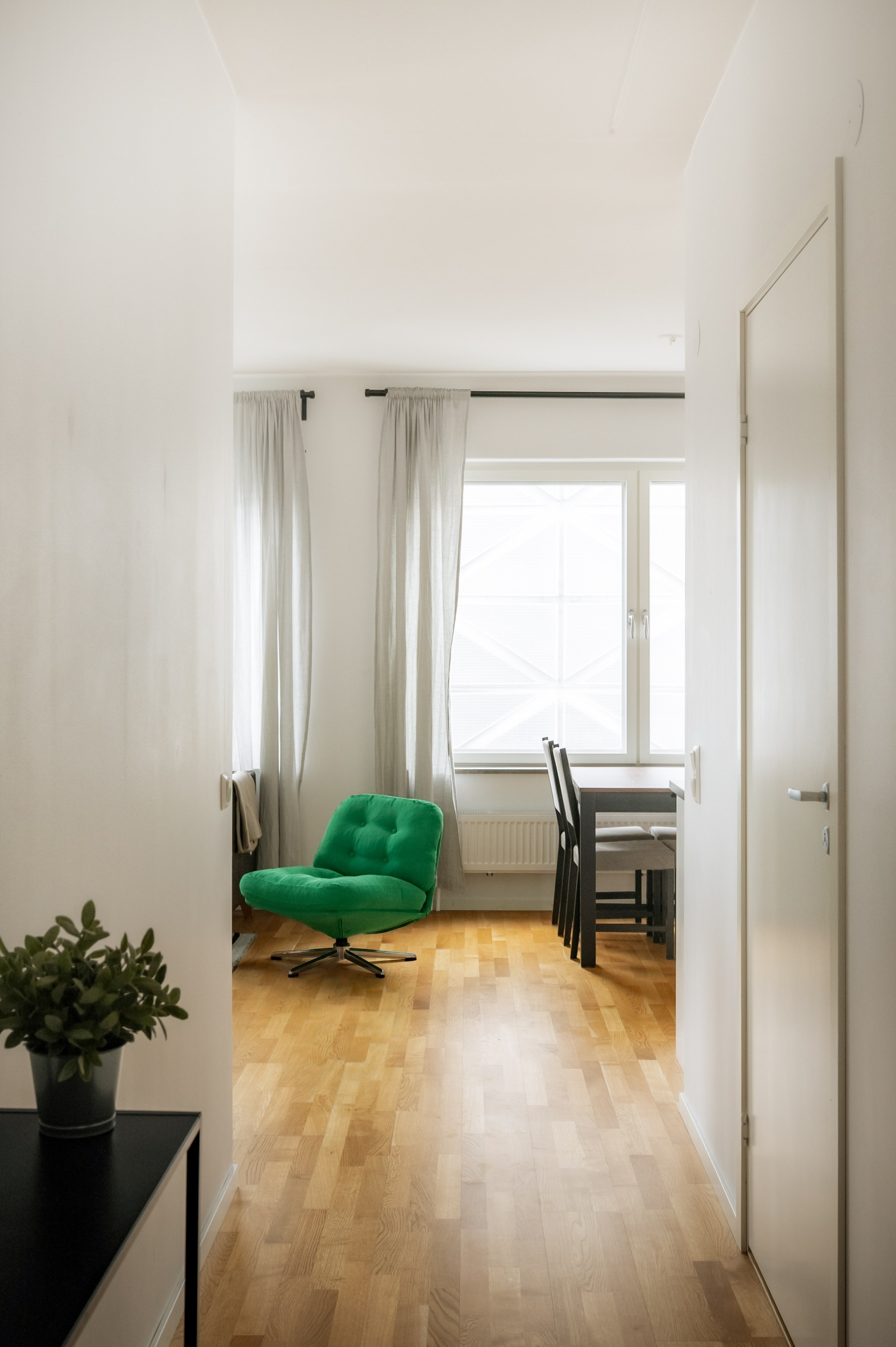 Det som gör just denna bostad särskilt attraktiv är att den ligger på ett av husets högre våningsplan där takhöjden är högre än i övriga lägenheter, vilket skapar en luftig och exklusiv känsla. Kombinationen av det höga läget, stora fönsterpartier och den öppna planlösningen ger bostaden en rymd och ett ljusinsläpp som förstärker känslan av ett modernt och genomtänkt hem.