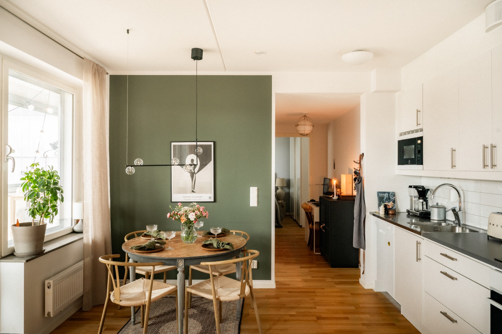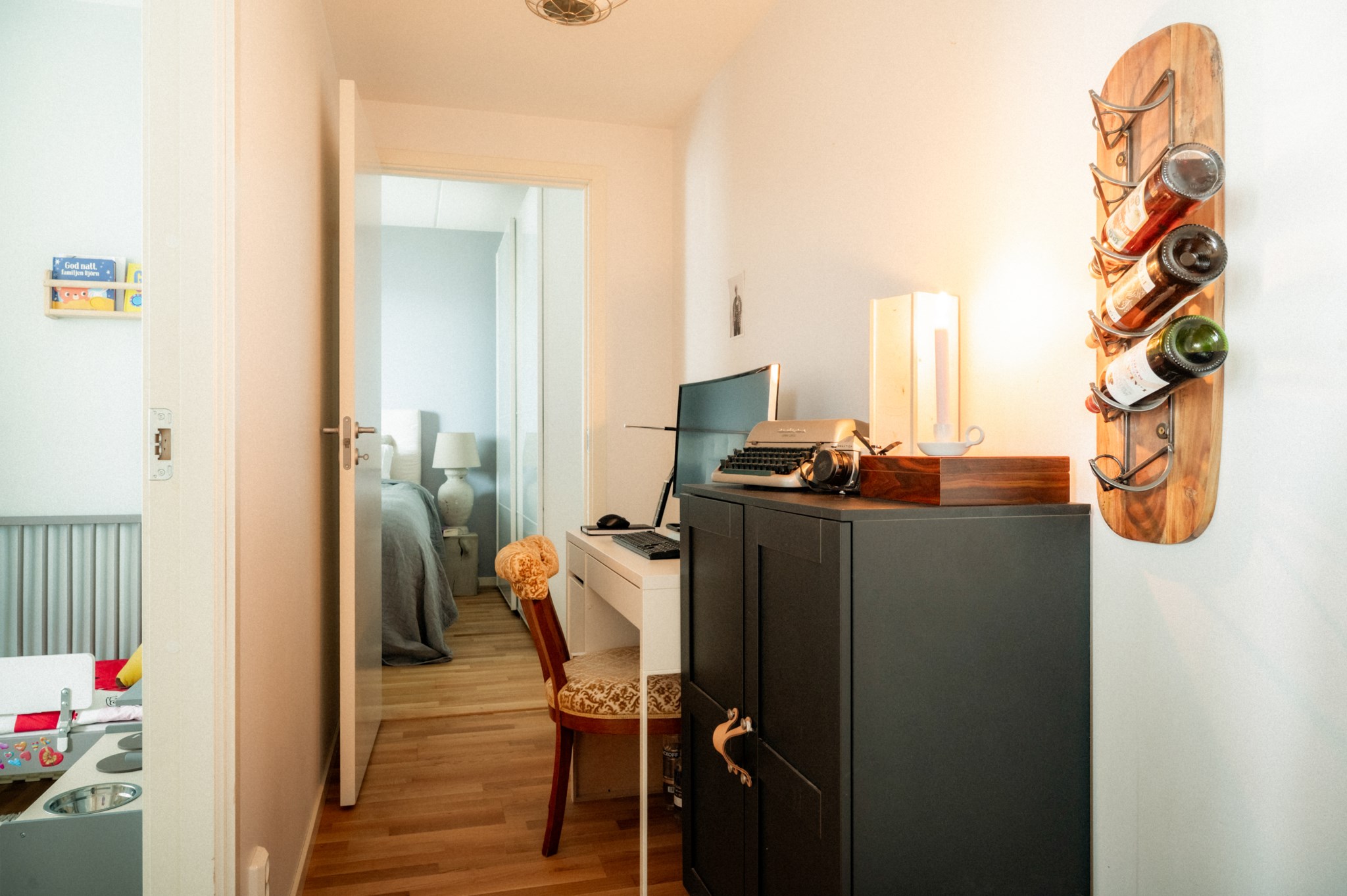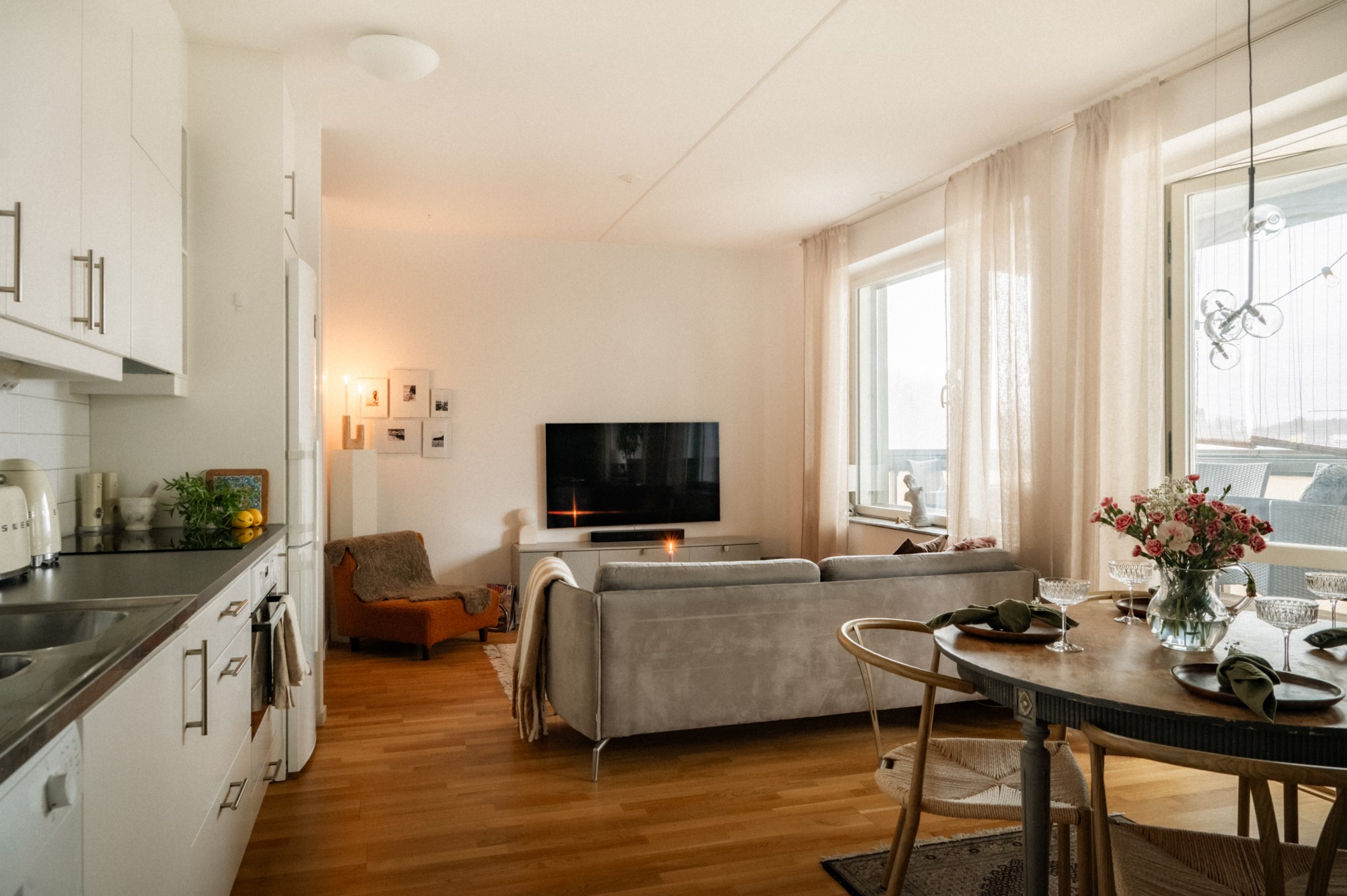 Interiört möts du av en ljus och inbjudande miljö där kök och vardagsrum samspelar i en öppen och social planlösning. De stora fönsterpartierna bidrar till ett fint ljusinsläpp och skapar en naturlig rymd i bostaden. Materialvalen är moderna och stilrena vilket gör hemmet lätt att trivas i och enkelt att anpassa efter egen smak. Bostaden disponeras med två sovrum som erbjuder flexibilitet för såväl barnrum som arbetsrum eller gästrum, vilket gör den attraktiv för både paret och den lilla familjen. Det helkaklade badrummet är funktionellt och utrustat med dusch, tvättmaskin och torktumlare samt goda förvaringsmöjligheter vilket underlättar vardagen.