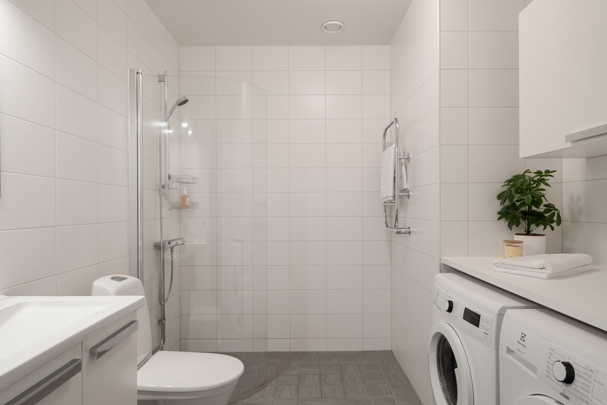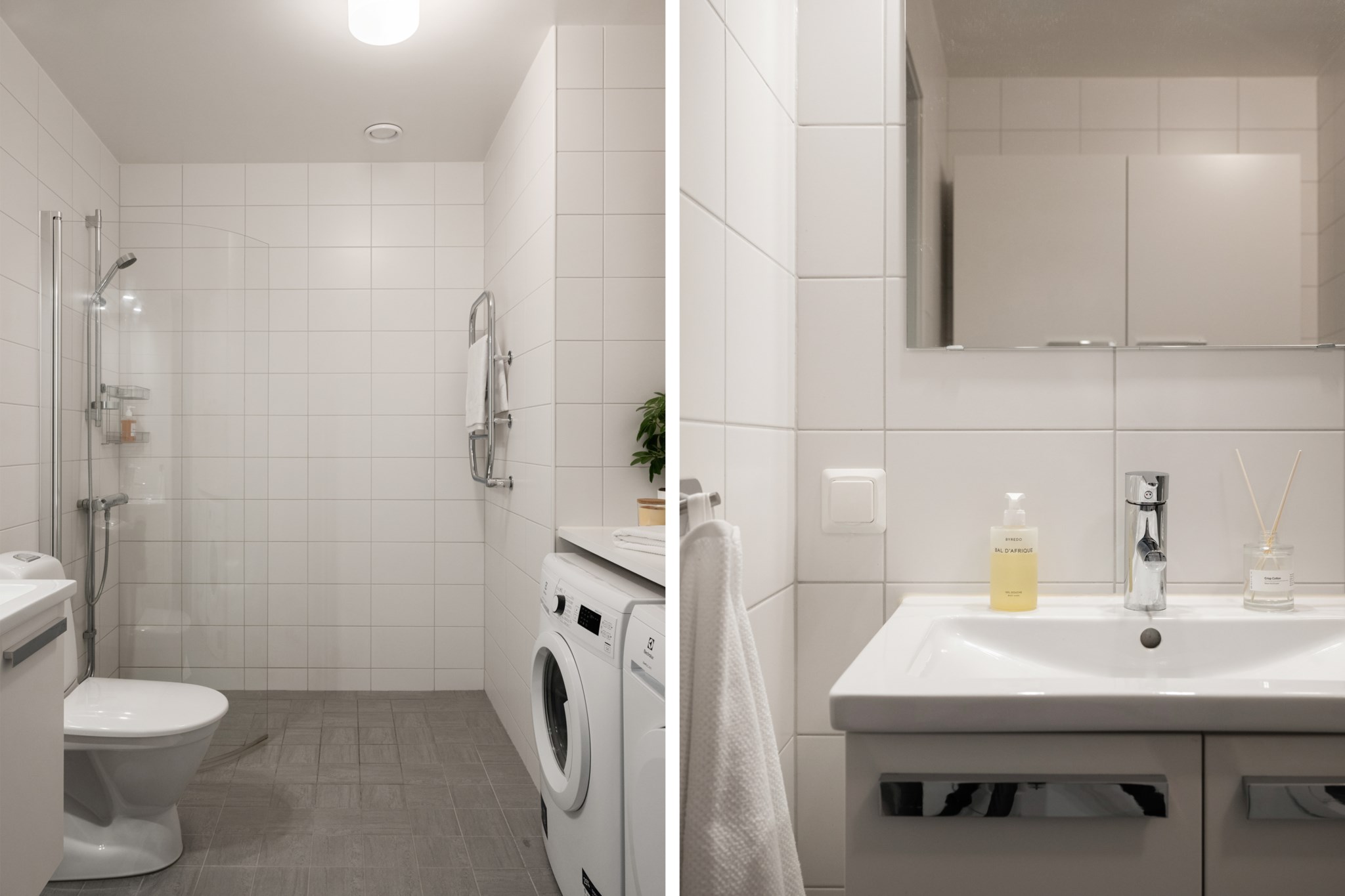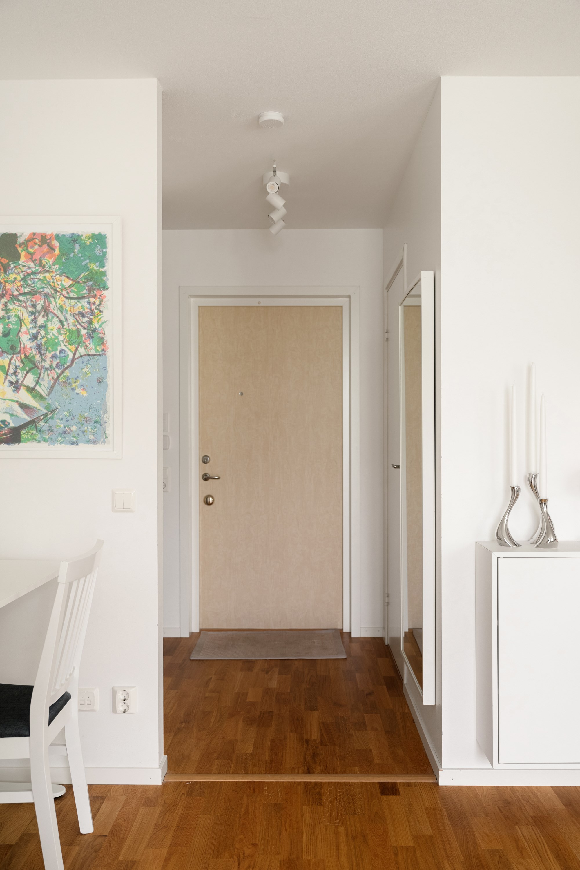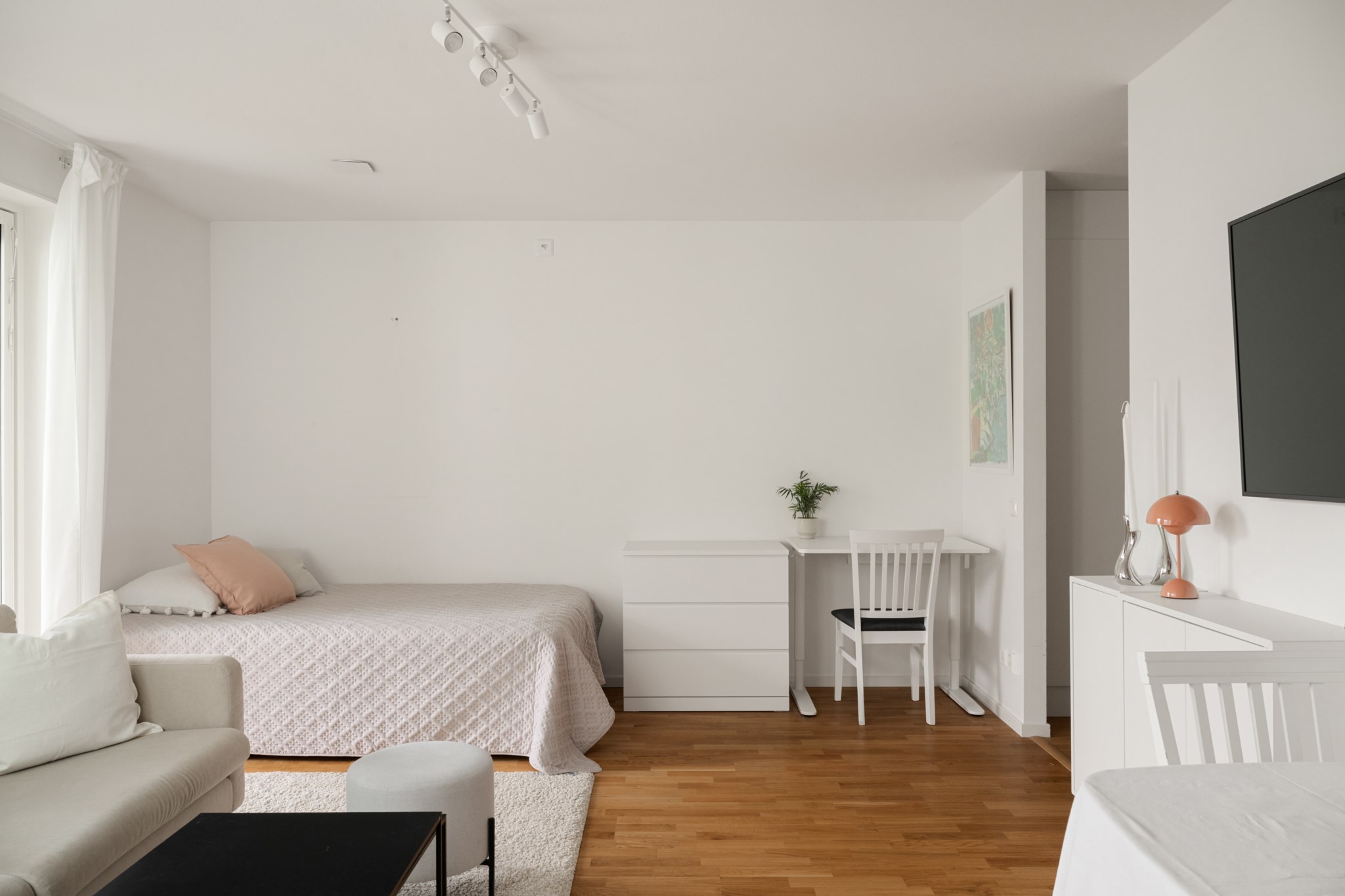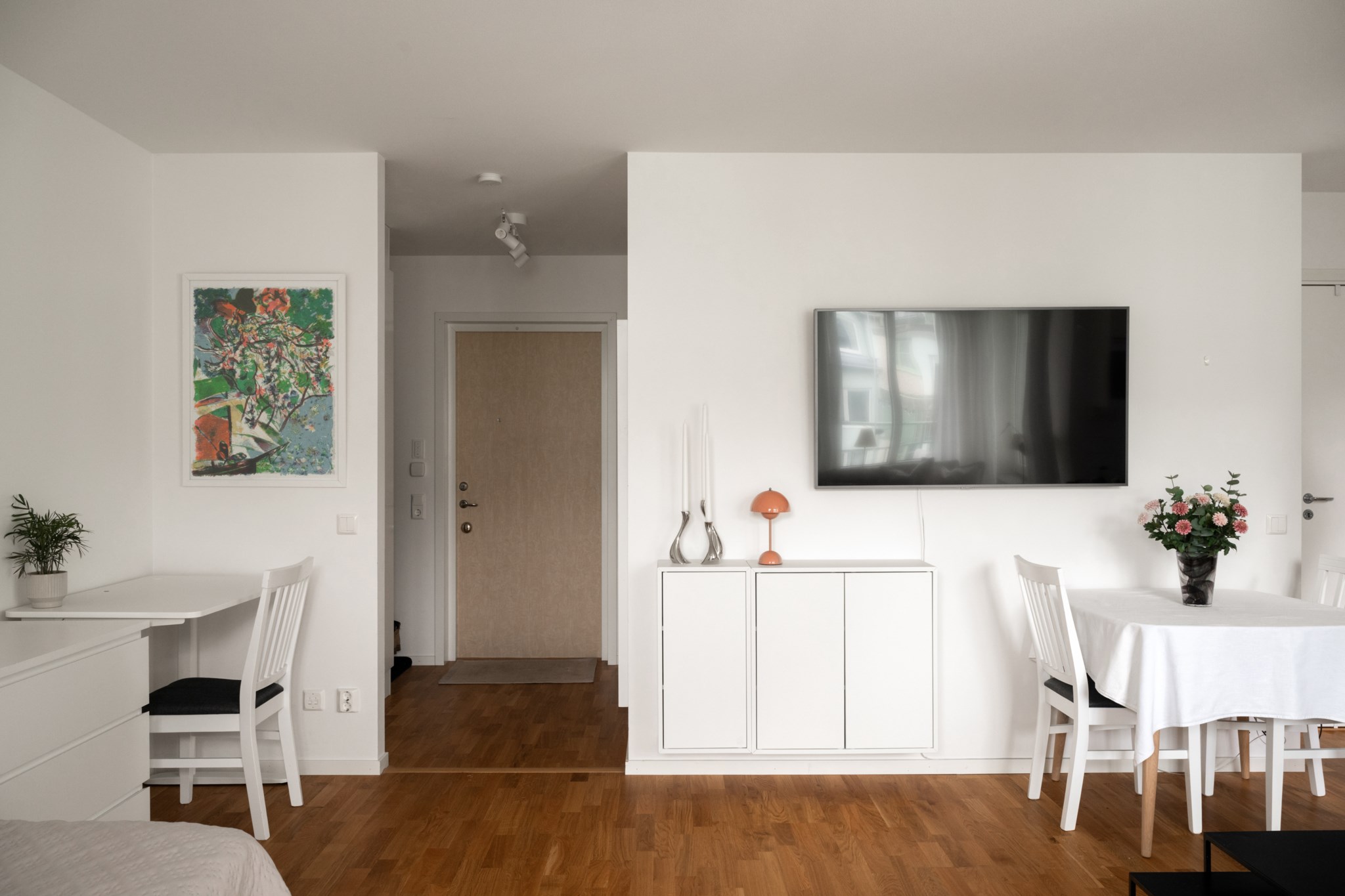 Bostaden präglas av genomgående gott skick med fint parkettgolv, målade väggar samt ett stilrent och fullutrustat kök i delvis öppen planlösning mot det luftiga allrummet. Här finns plats för matbord, soffgrupp och sovdel. Stora fönsterpartier ger ett generöst ljusinsläpp. Vidare erbjuds ett badrum med separat tvättmaskin och torktumlare, goda förvaringsmöjligheter och väl tilltagna ytor.