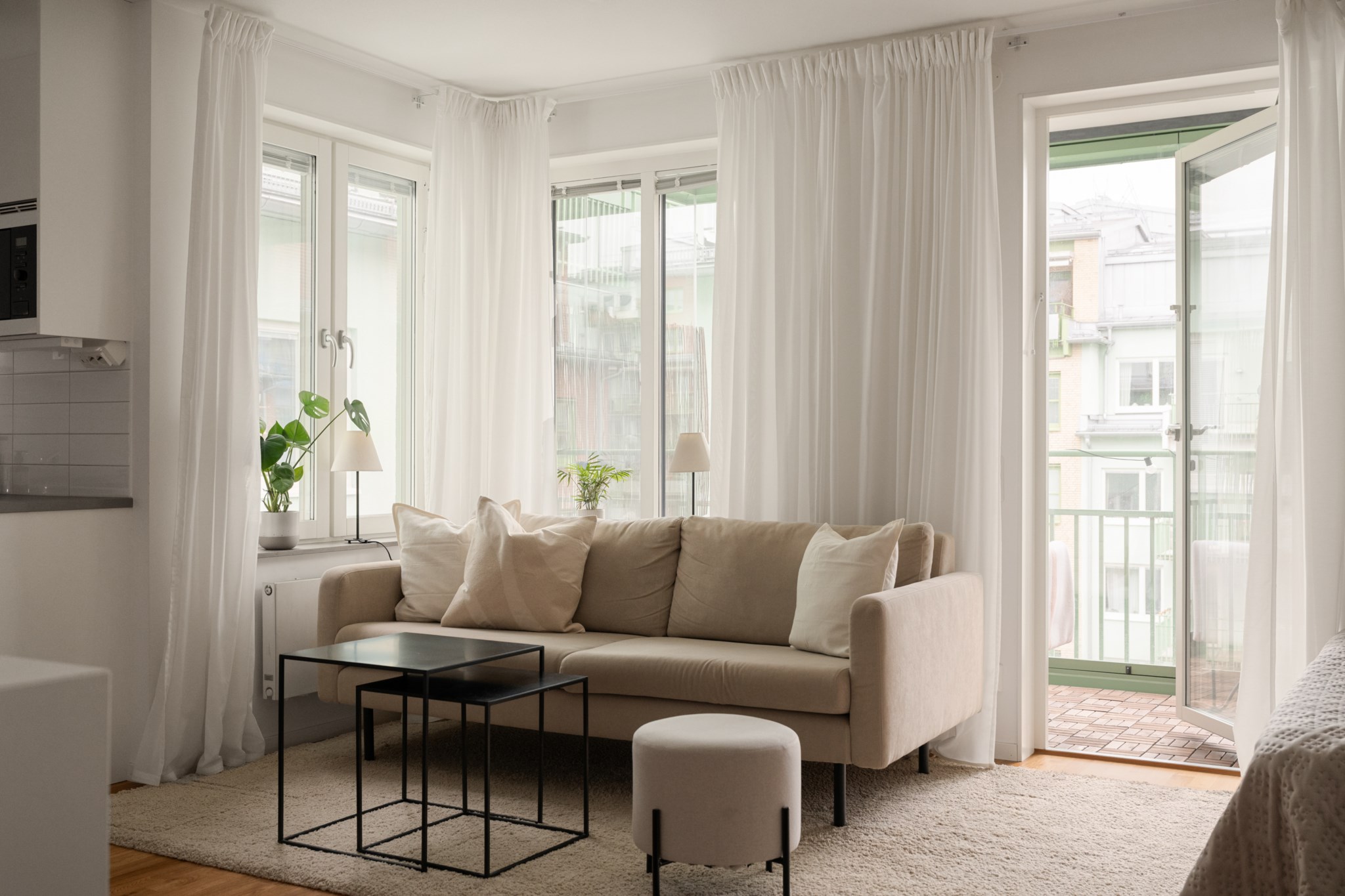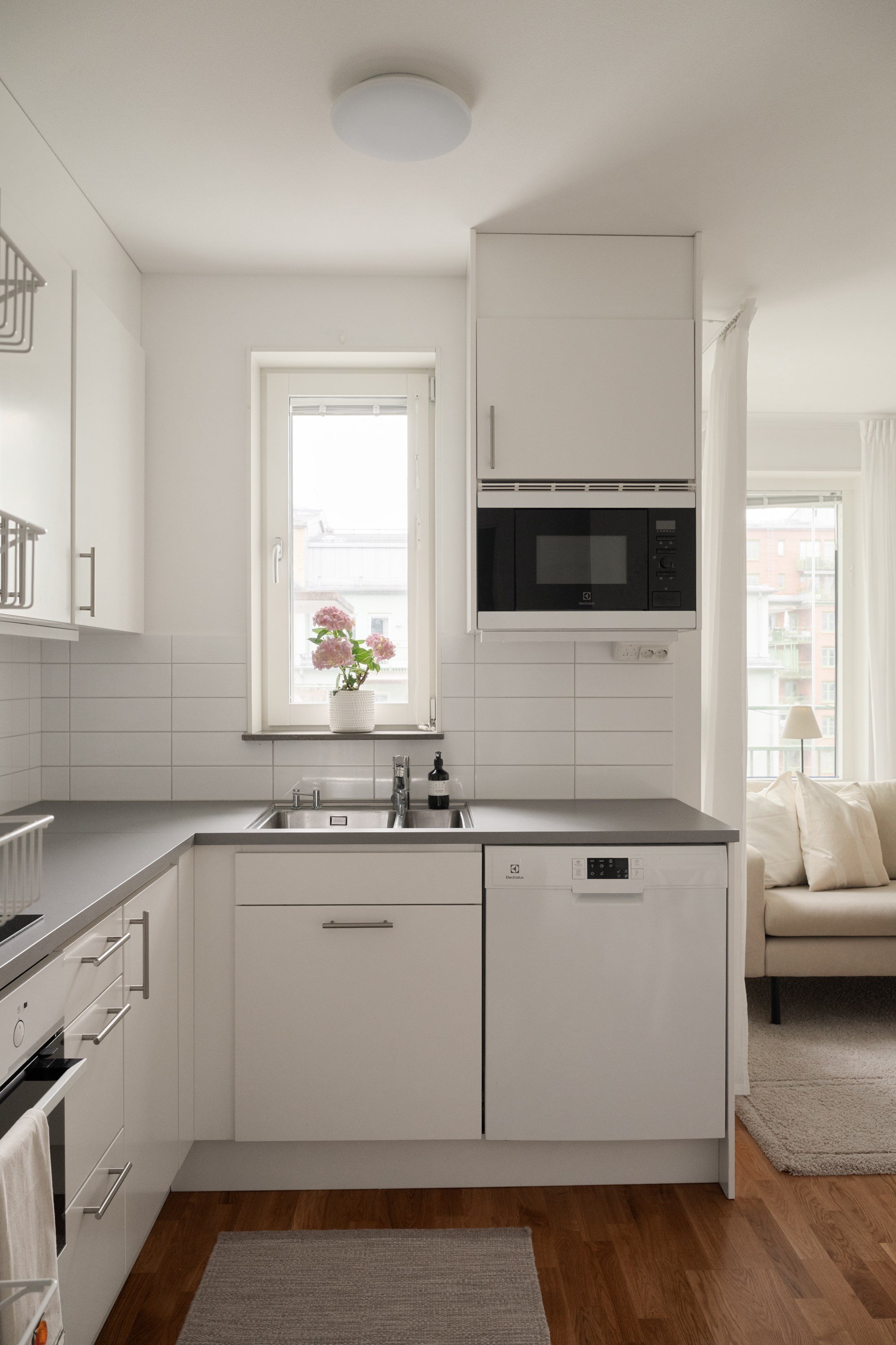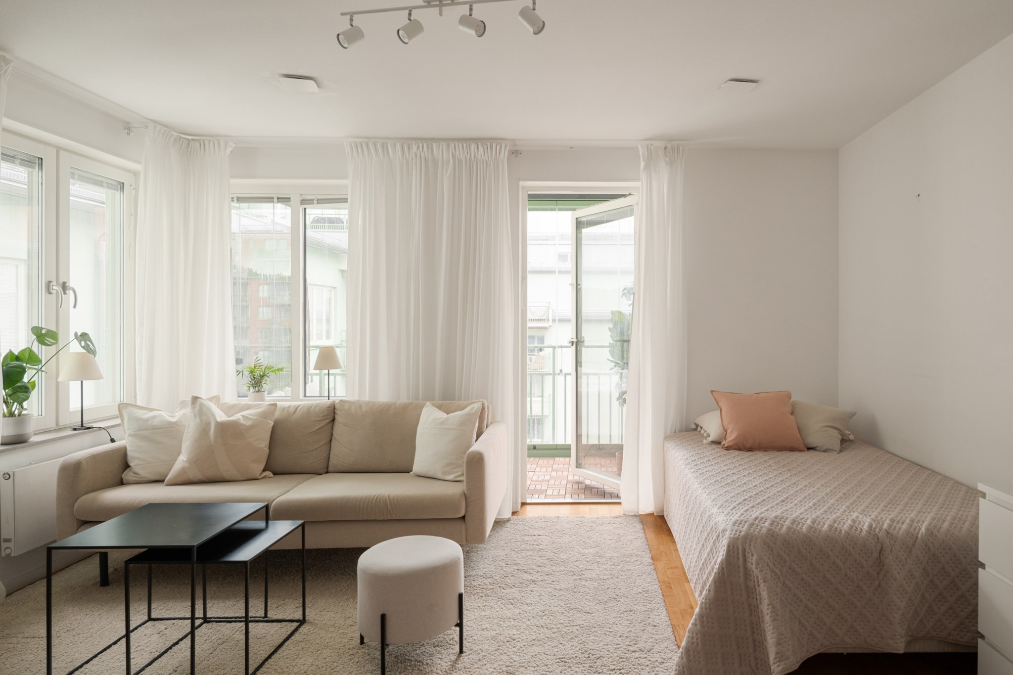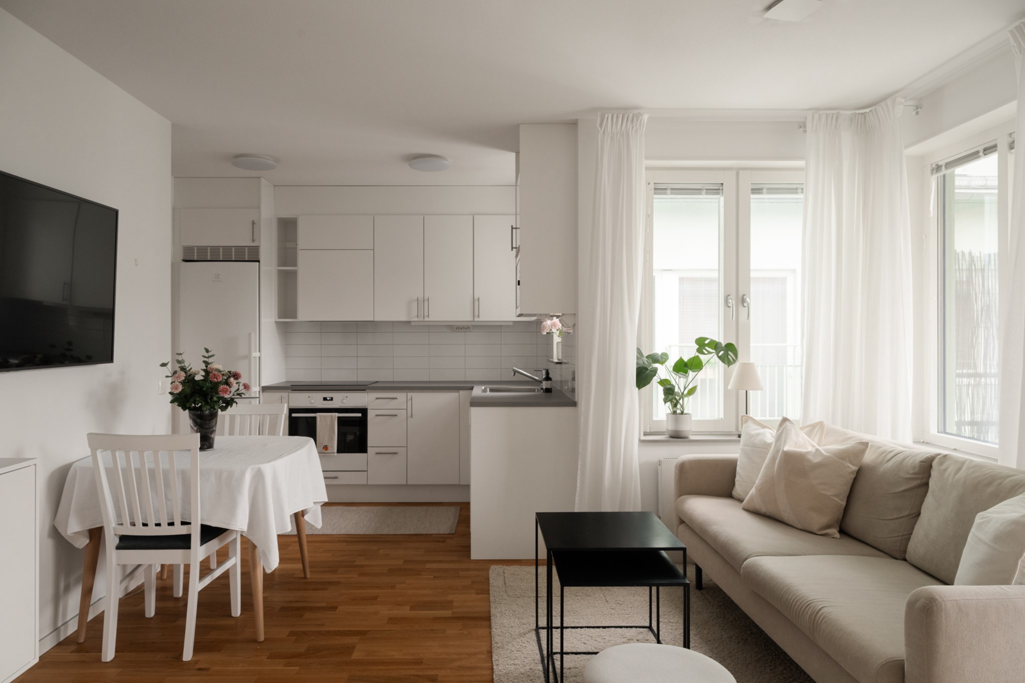 Bostaden präglas av genomgående gott skick med fint parkettgolv, målade väggar samt ett stilrent och fullutrustat kök i delvis öppen planlösning mot det luftiga allrummet. Här finns plats för matbord, soffgrupp och sovdel. Stora fönsterpartier ger ett generöst ljusinsläpp. Vidare erbjuds ett badrum med separat tvättmaskin och torktumlare, goda förvaringsmöjligheter och väl tilltagna ytor.