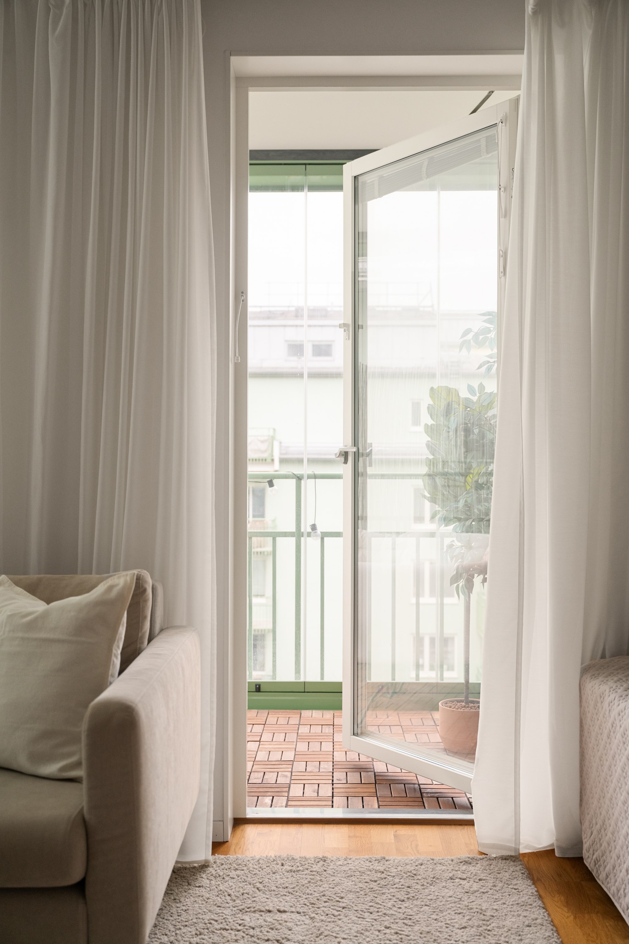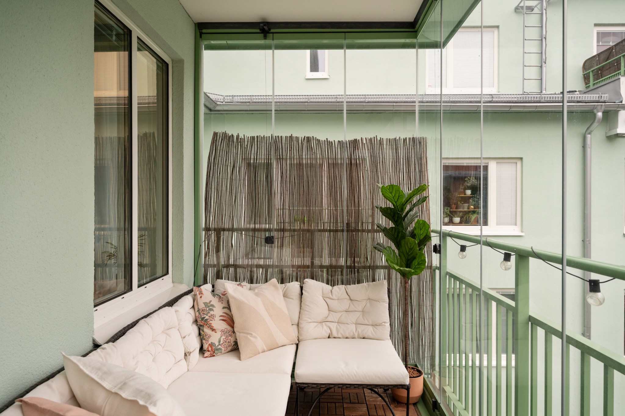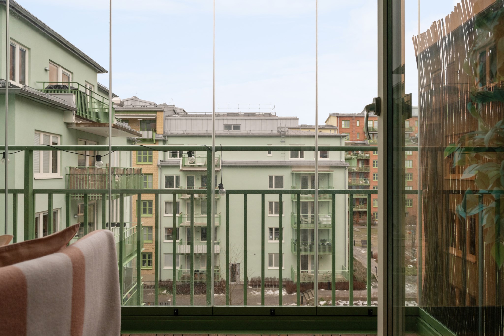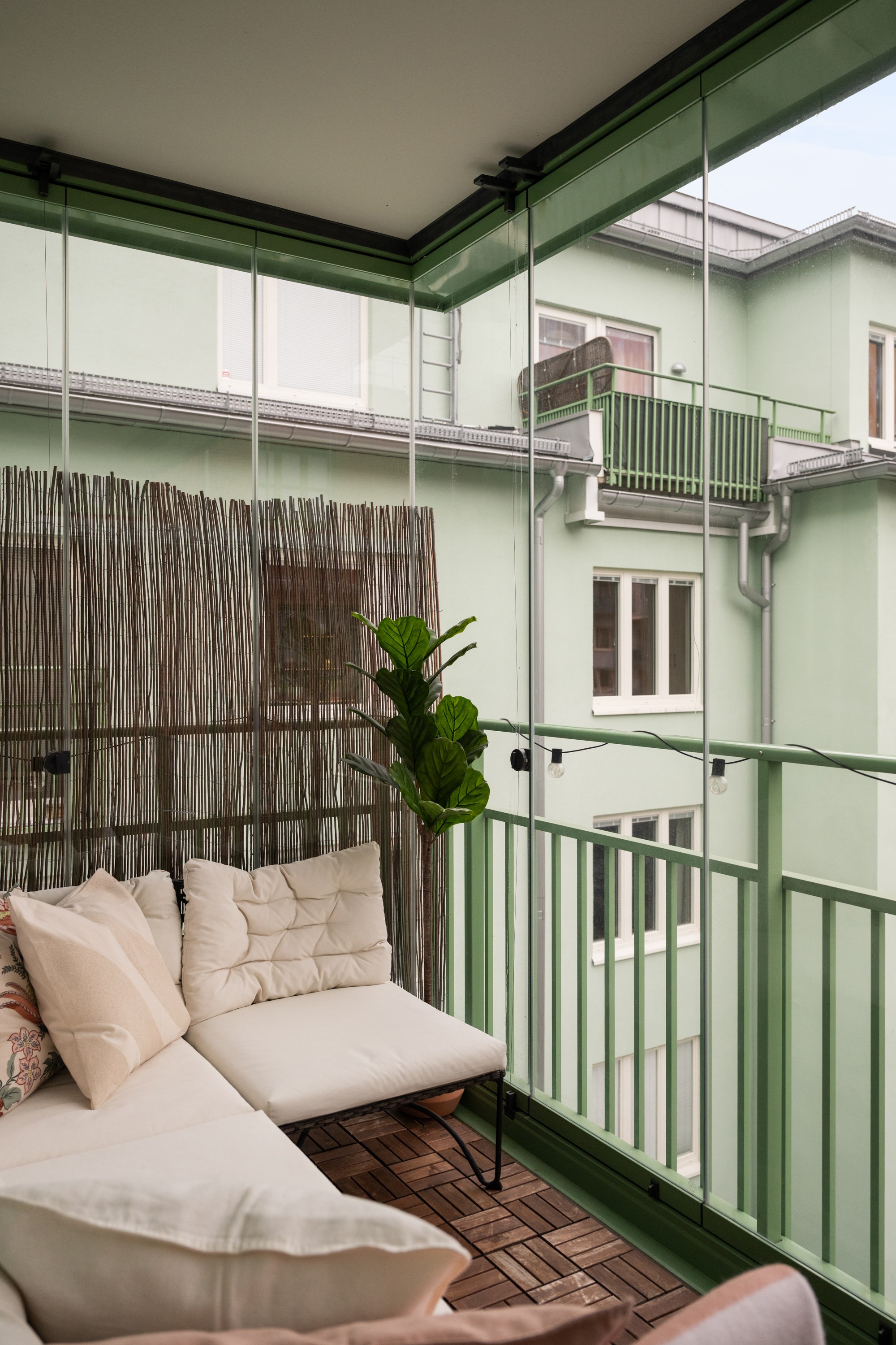 Den inglasade balkongen skapar en naturlig förlängning av bostaden och fungerar som ett extra rum större delen av året – perfekt för både avkoppling och sociala tillställningar.