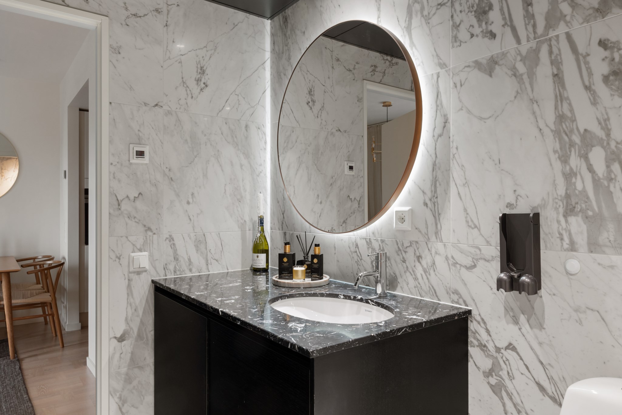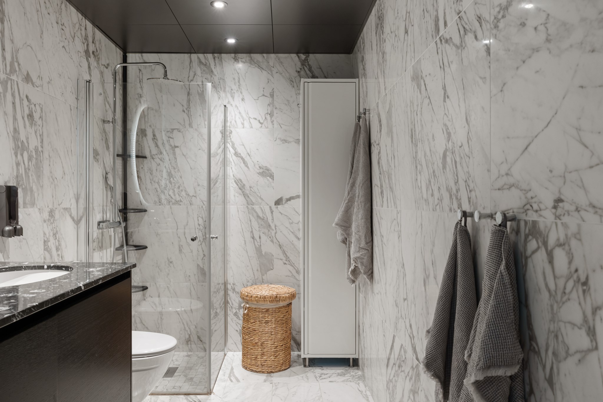 Sovrummet är rofyllt och rymmer en dubbelsäng samt praktisk förvaring. Badrummet är helkaklat i marmormotiv med golvvärme, duschvägg i glas och exklusiva detaljer som för tankarna till ett boutiquehotell. Helheten präglas av harmoni och genomtänkt design i varje detalj.