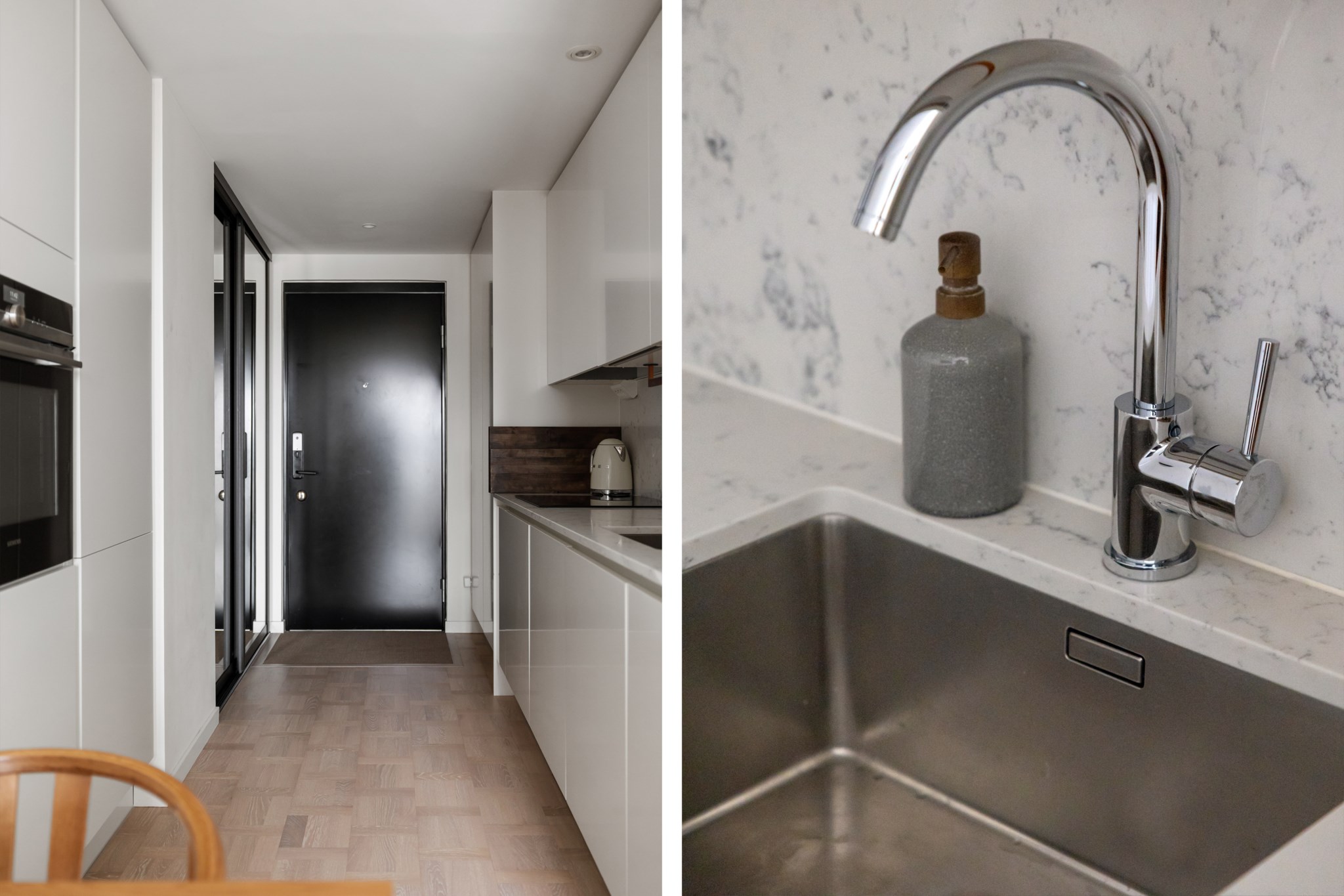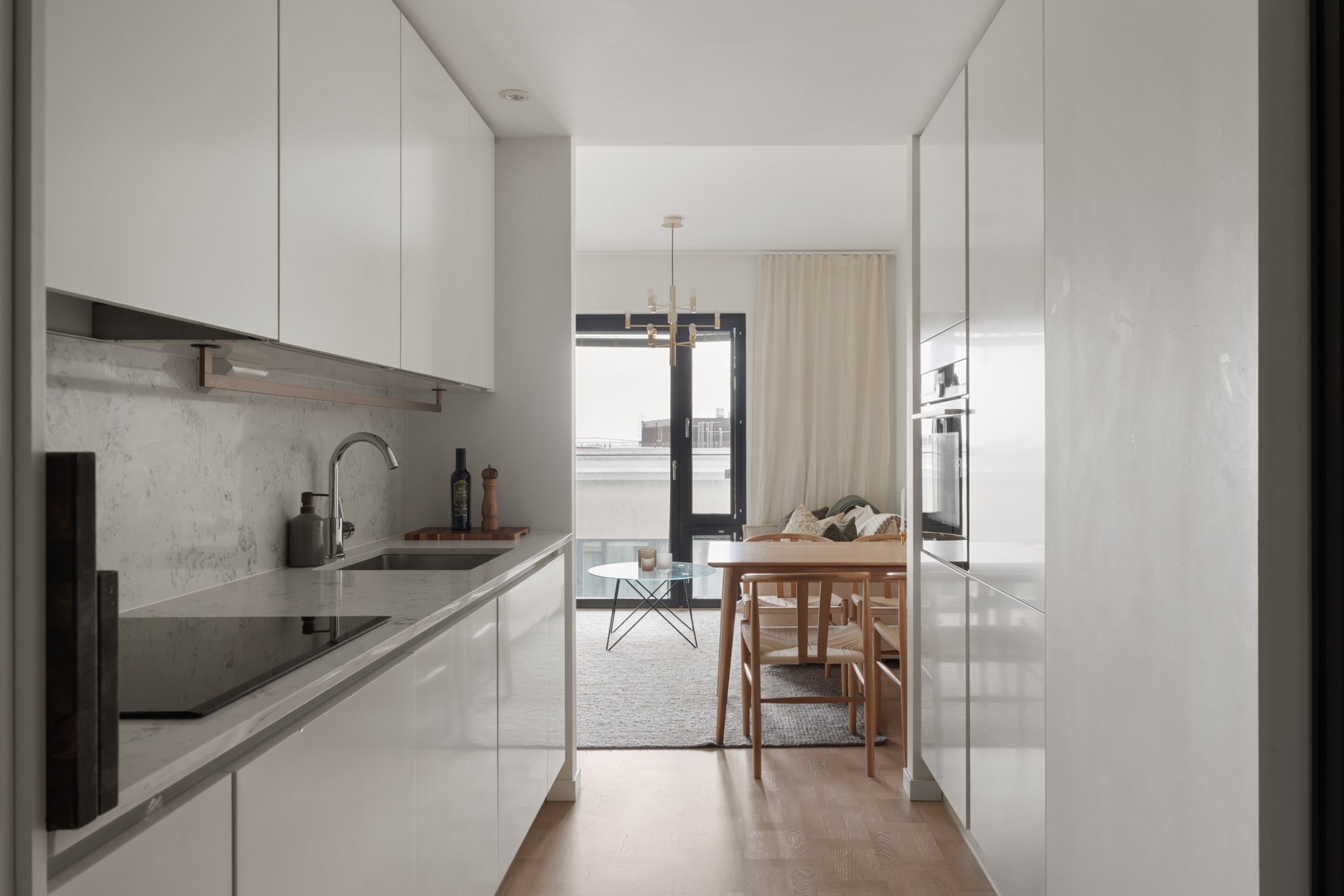 Planlösningen är genomtänkt och effektiv med en öppen yta mellan kök och vardagsrum som ger ett härligt ljus och rymd. Köket har en stilren utformning med släta luckor, arbetsbänk i stenkomposit och integrerade vitvaror. Det är en naturlig plats för både matlagning och socialt umgänge.
