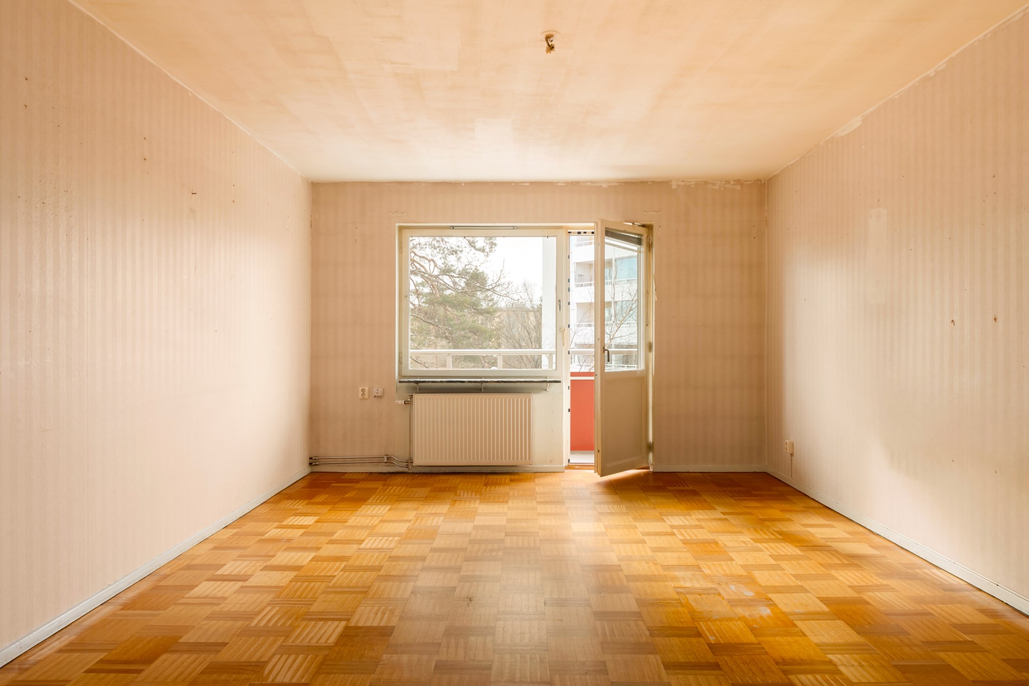 Vardagsrummet är luftigt och lättmöblerat med utgång till bostadens balkong. Här kan du njuta av eftermiddags- och kvällssol i en lugn och grönskande miljö.