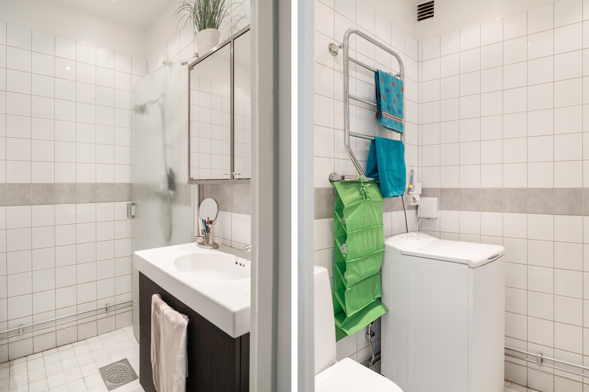 Det stambytta badrummet är stilrent och praktiskt, utrustat med tvättmaskin, dusch med vikbara glasdörrar samt handfat med kommod och spegelskåp. Förvaringsmöjligheterna är goda tack vare flera garderober. Den inbjudande hallen med hatthylla ger ett välkomnande första intryck av denna mycket trivsamma bostad som verkligen bör upplevas på plats.