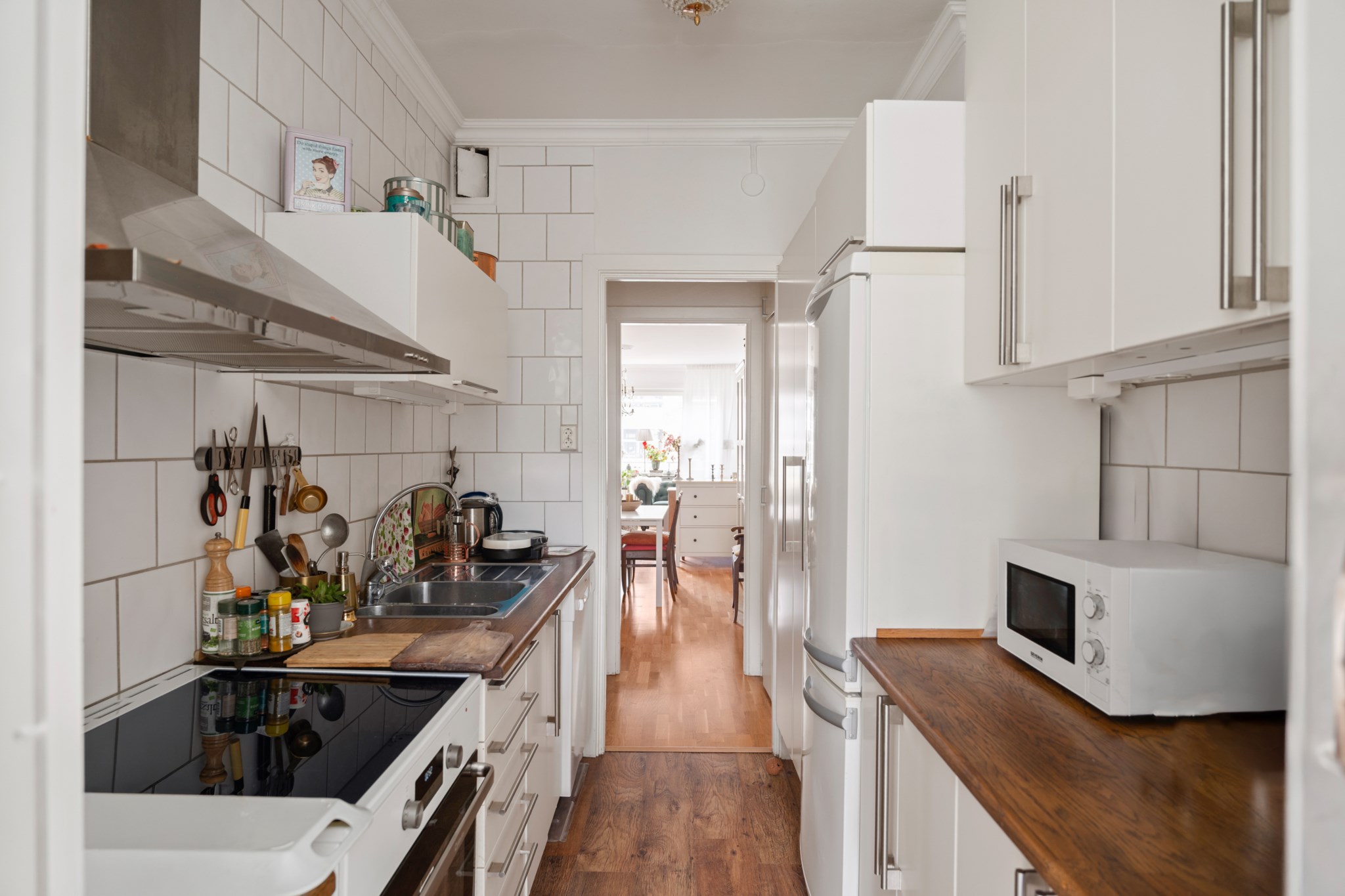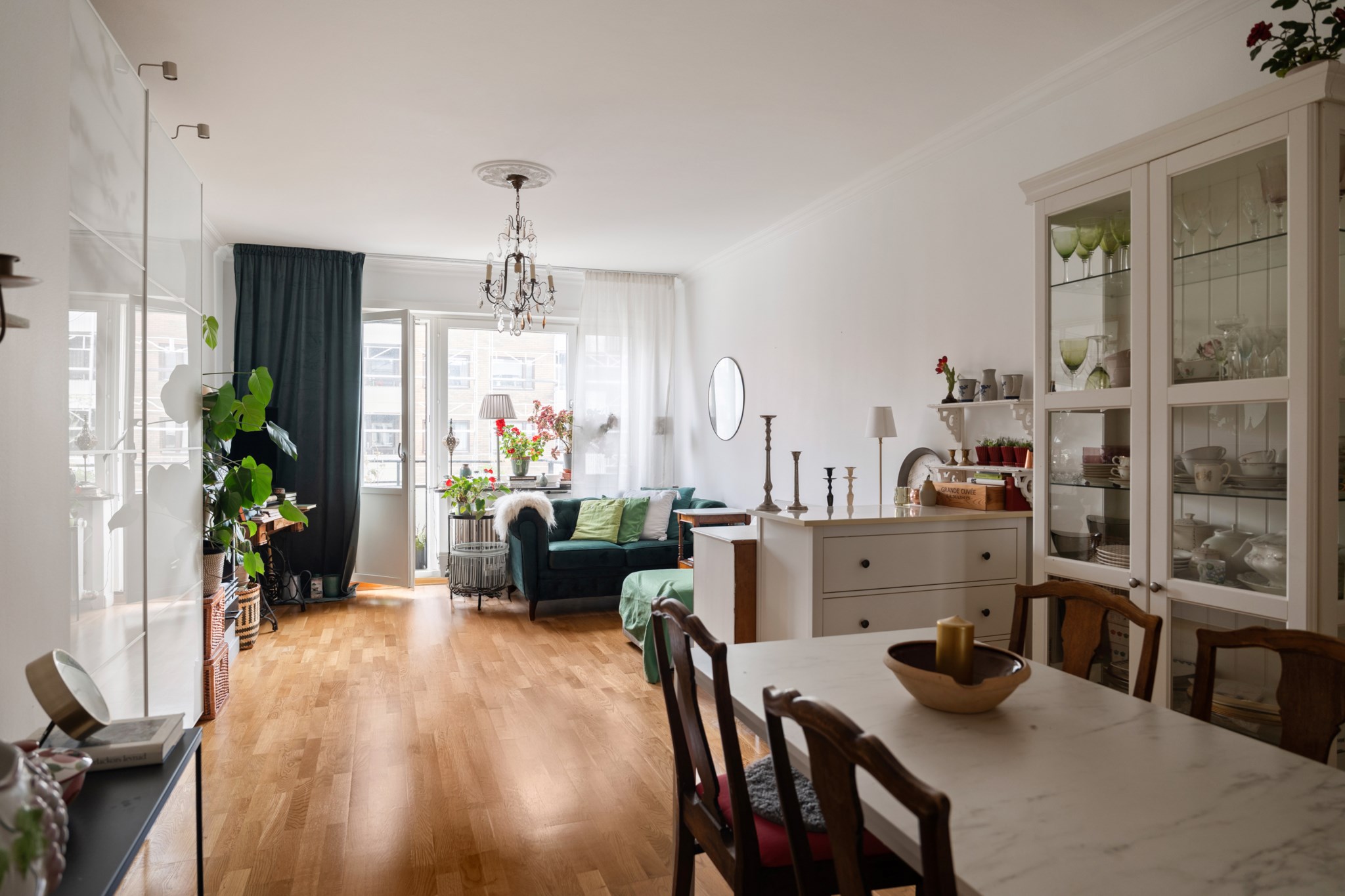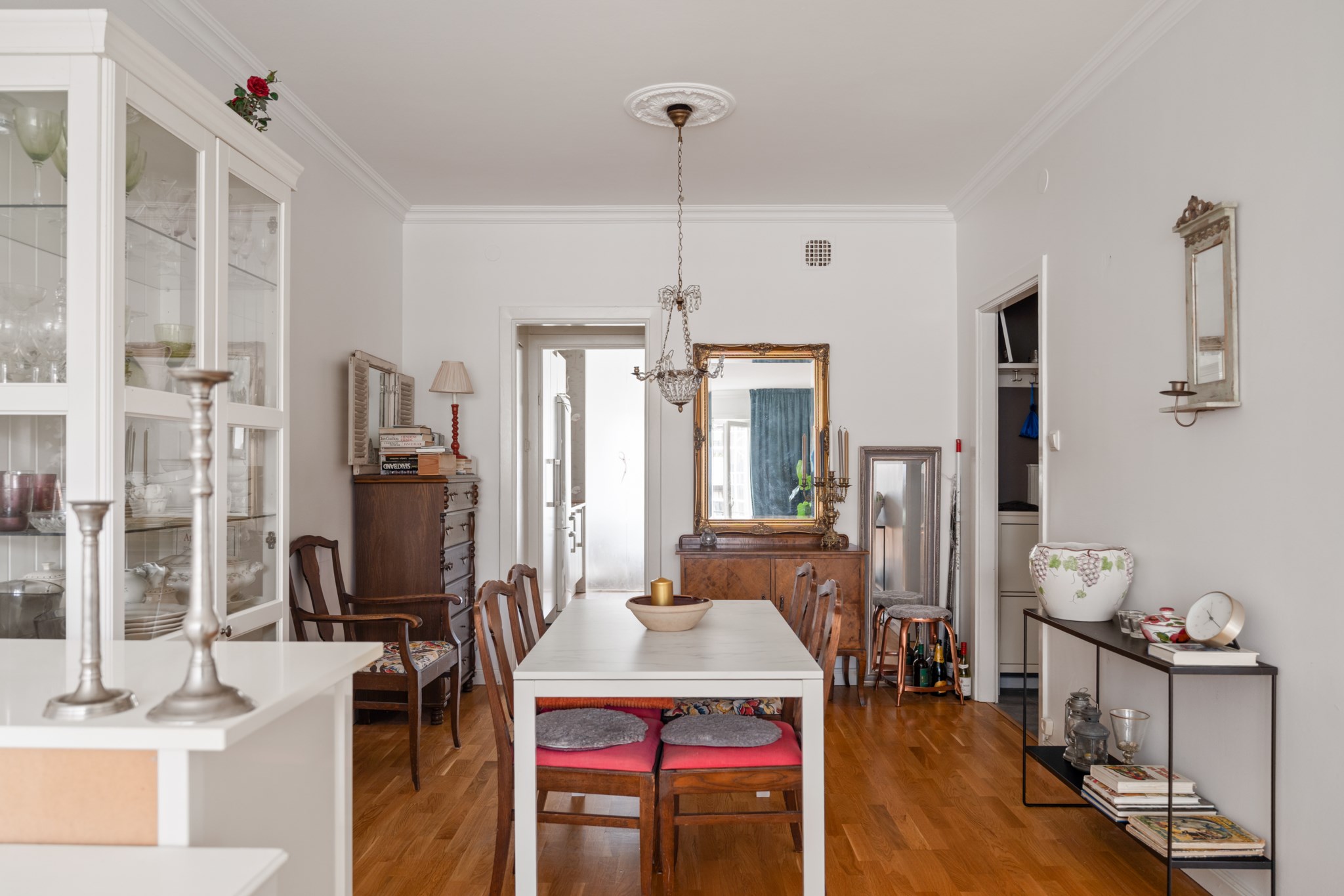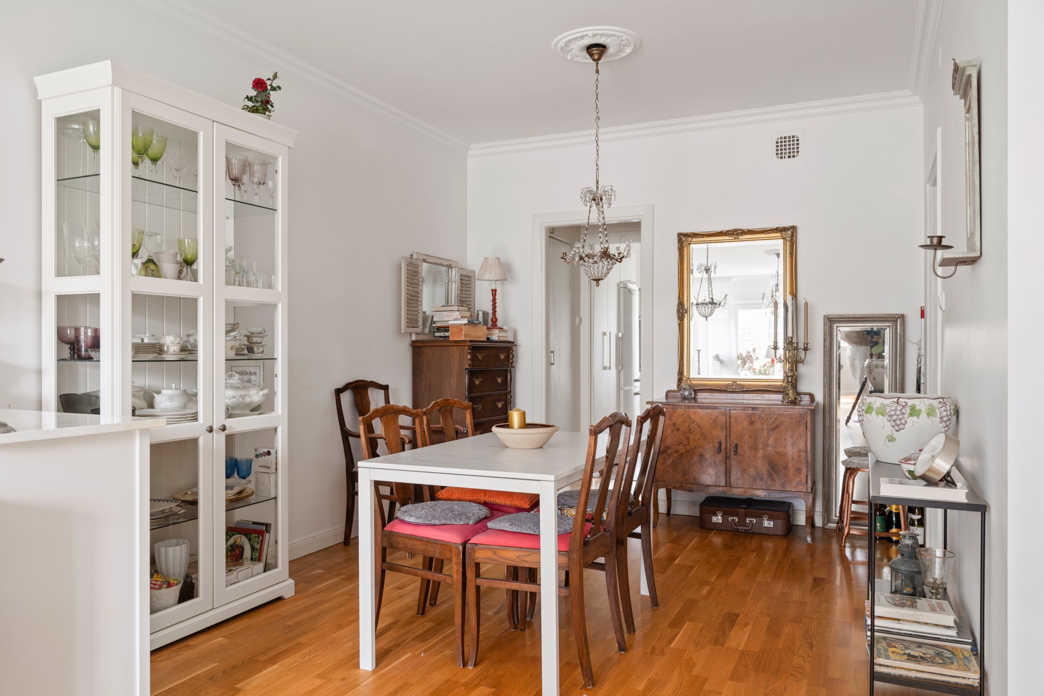 Bostaden präglas av ett fantastiskt ljusinsläpp från stora fönsterpartier i två väderstreck, som tillsammans med den generösa takhöjden, vackra taklister och stukatur förstärker känslan av rymd och elegans.