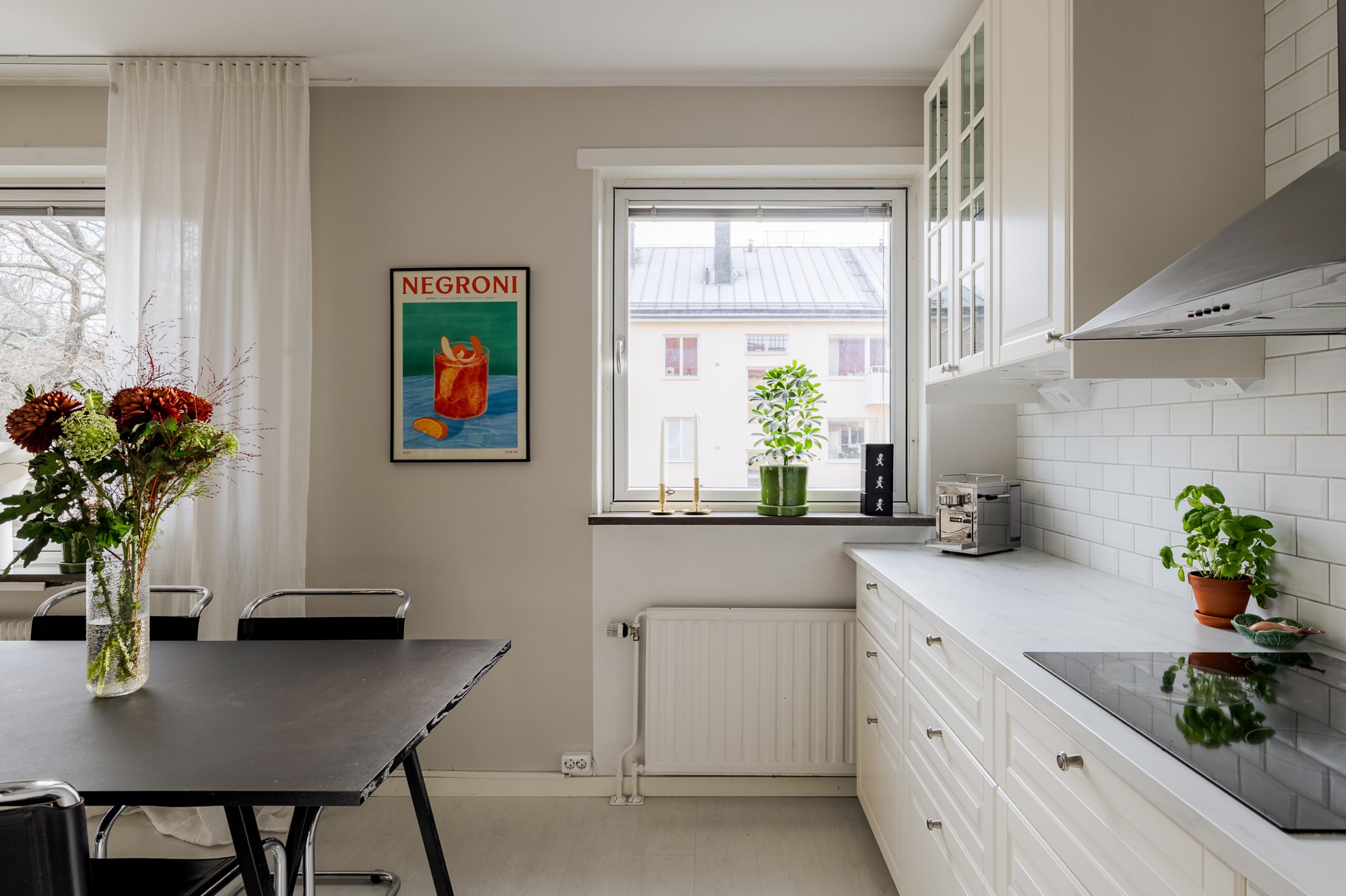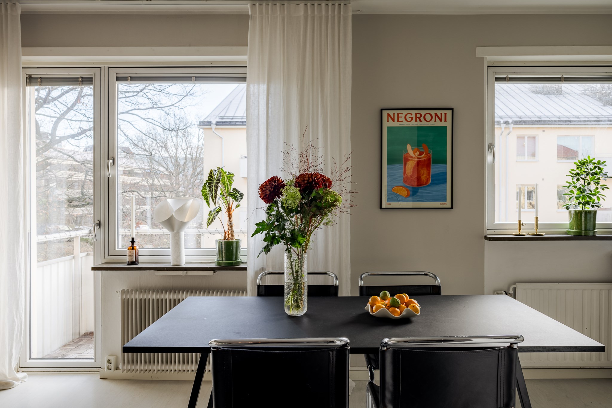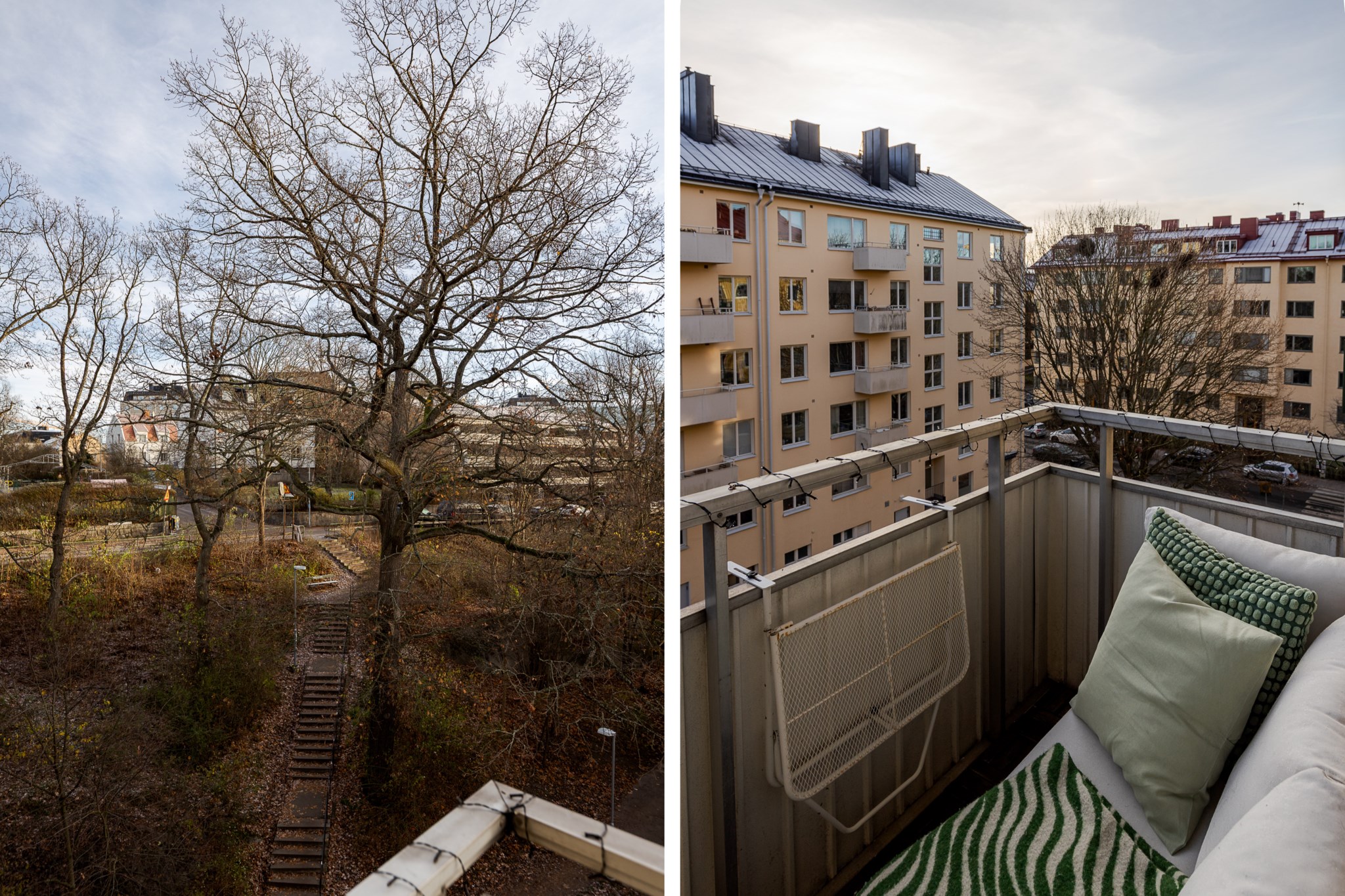 Köket ligger i en öppen och social mötespunkt mot vardagsrummet, och tillsammans skapar de en atmosfär som både bjuder in och släpper fram. Köket är smakfullt utformat med integrerade vitvaror, generösa arbetsytor och en design som gör att det alltid känns välkomnande – oavsett om du slänger ihop en snabb vardagsmiddag eller förbereder en helkväll med gäster. Det stora fönsterpartiet i vardagsrummet ger ett ljusinsläpp som gör rummet levande från morgon till kväll, och från soffan har du bara ett par steg ut till balkongen. Här ute möts du av grönska och stillhet, en plats där morgonen kan börja i lugn och där kvällarna får en mjuk övergång innan natten tar vid. Det är en balkong som blir en del av bostaden, inte bara ett komplement.
