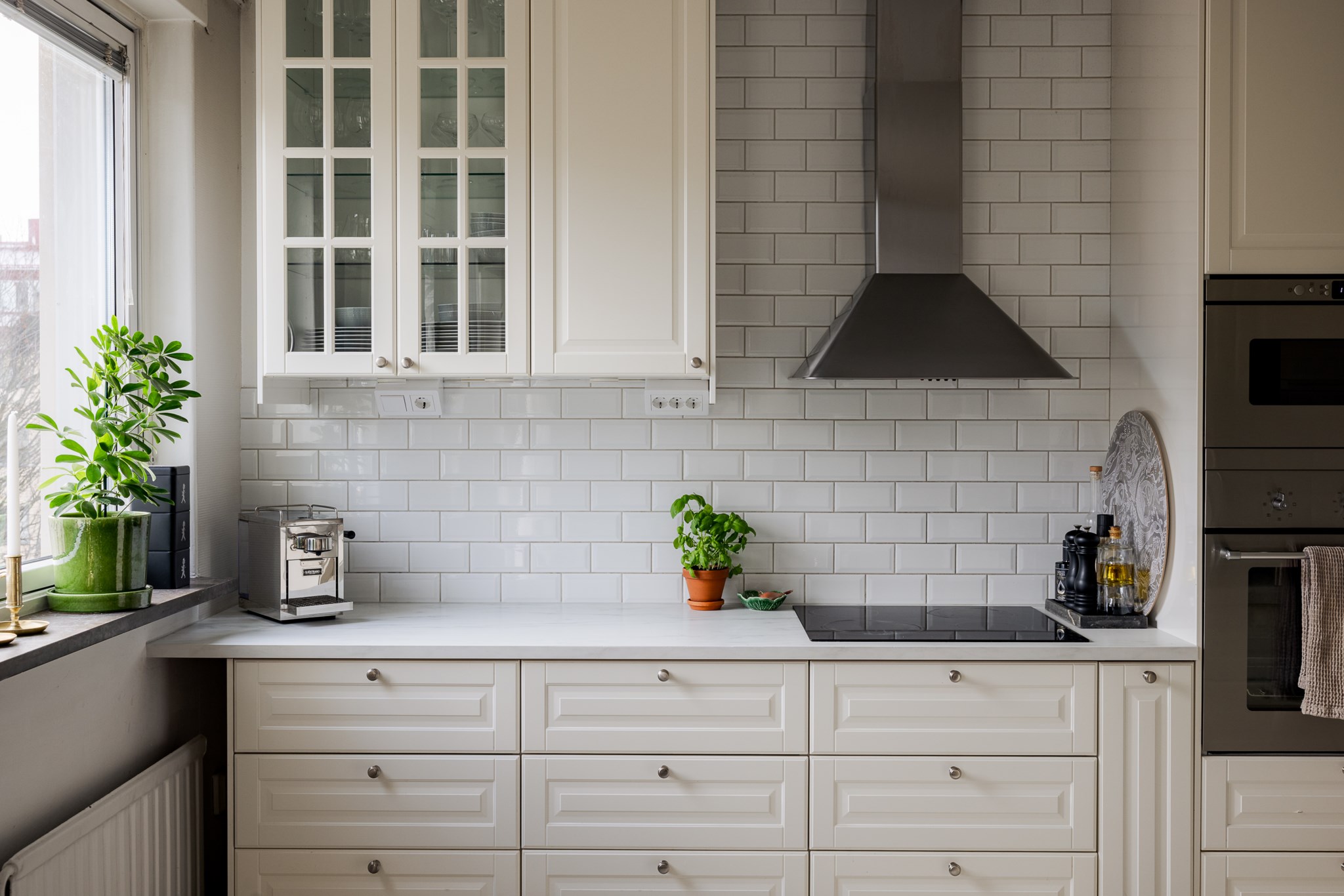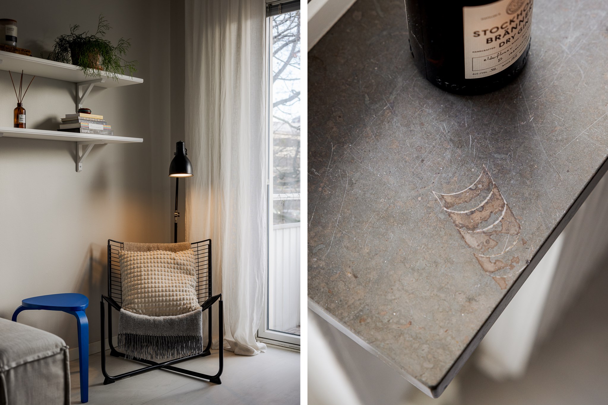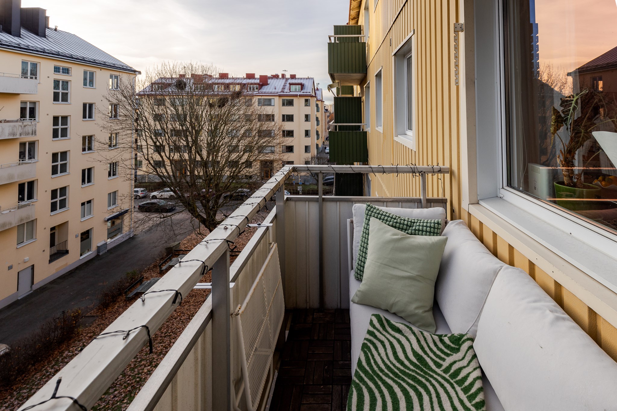 Köket ligger i en öppen och social mötespunkt mot vardagsrummet, och tillsammans skapar de en atmosfär som både bjuder in och släpper fram. Köket är smakfullt utformat med integrerade vitvaror, generösa arbetsytor och en design som gör att det alltid känns välkomnande – oavsett om du slänger ihop en snabb vardagsmiddag eller förbereder en helkväll med gäster. Det stora fönsterpartiet i vardagsrummet ger ett ljusinsläpp som gör rummet levande från morgon till kväll, och från soffan har du bara ett par steg ut till balkongen. Här ute möts du av grönska och stillhet, en plats där morgonen kan börja i lugn och där kvällarna får en mjuk övergång innan natten tar vid. Det är en balkong som blir en del av bostaden, inte bara ett komplement.