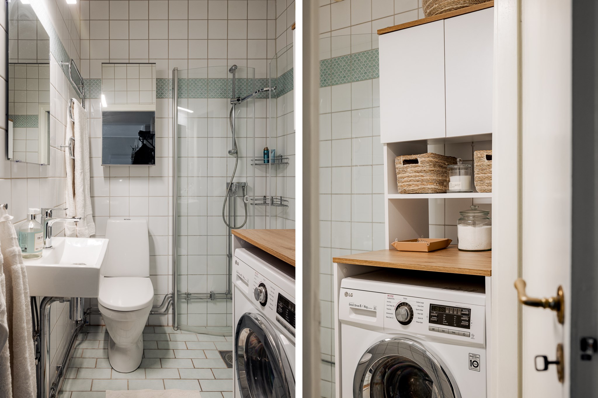 Badrummet är en fortsättning på samma genomtänkta stil – helkaklat, fräscht och utrustat med dusch, handdukstork och en praktisk tvättmaskin som gör vardagen betydligt enklare. Känslan är modern, ren och tidlös.