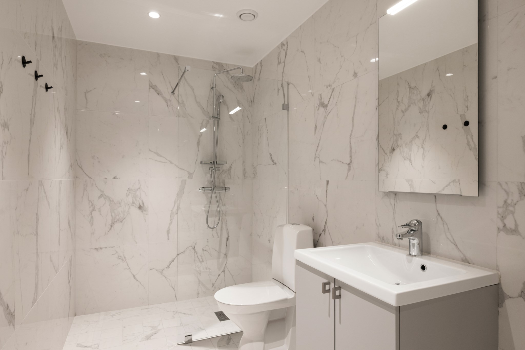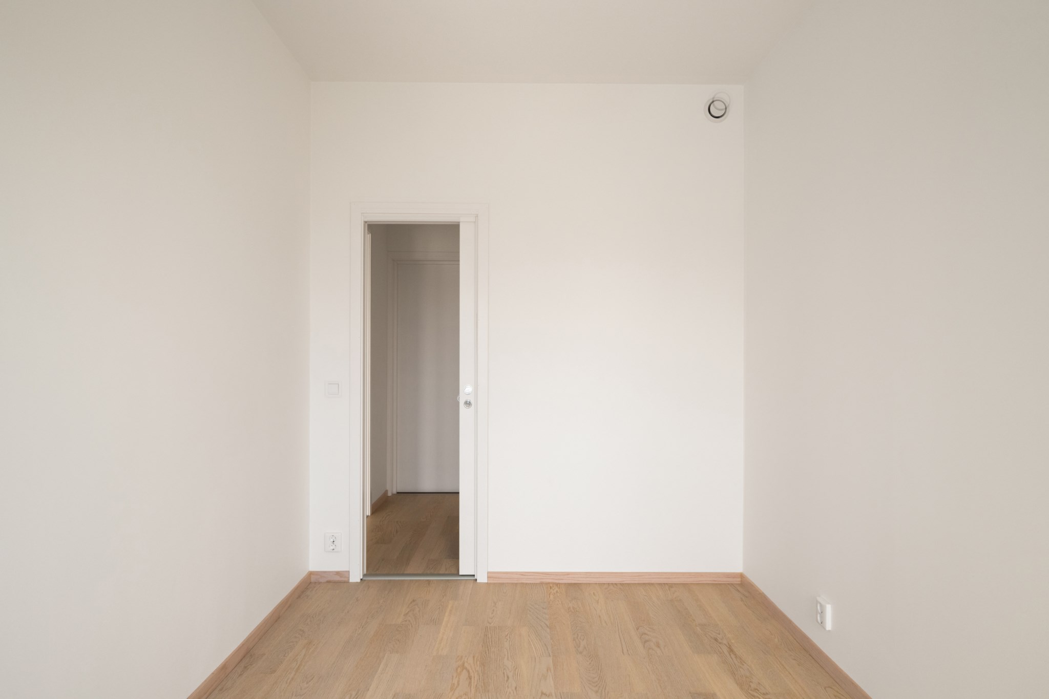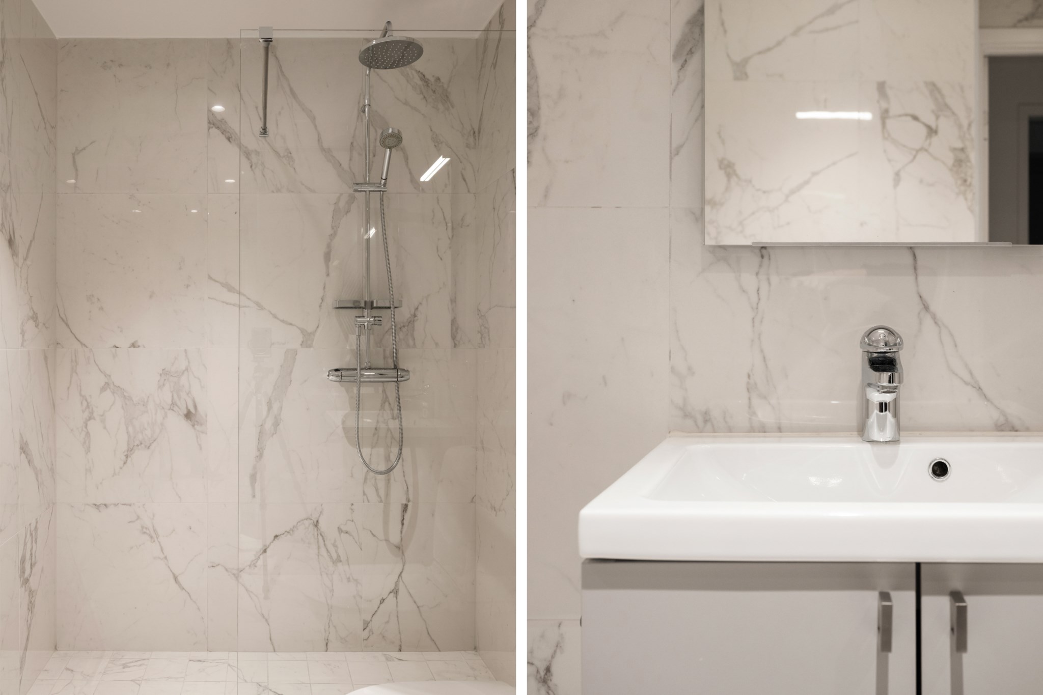 Sovrummet är lugnt och rogivande med plats för dubbelsäng, sängbord och förvaring. Det befintliga badrummet håller modern standard med helkaklade ytor, dusch med glasvägg, tvättmaskin, förvaring och komfortvärme i golvet – en känsla av hotellstandard hemma.