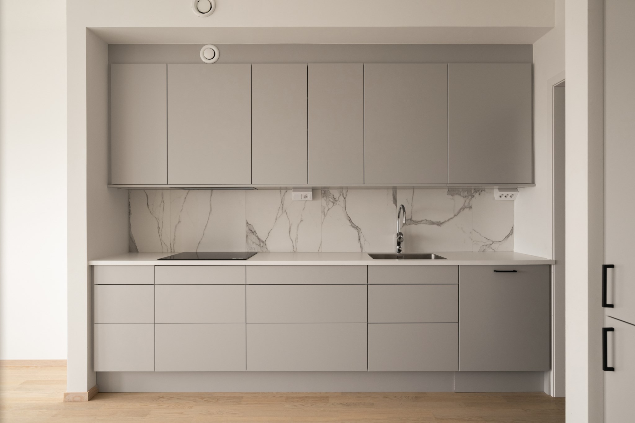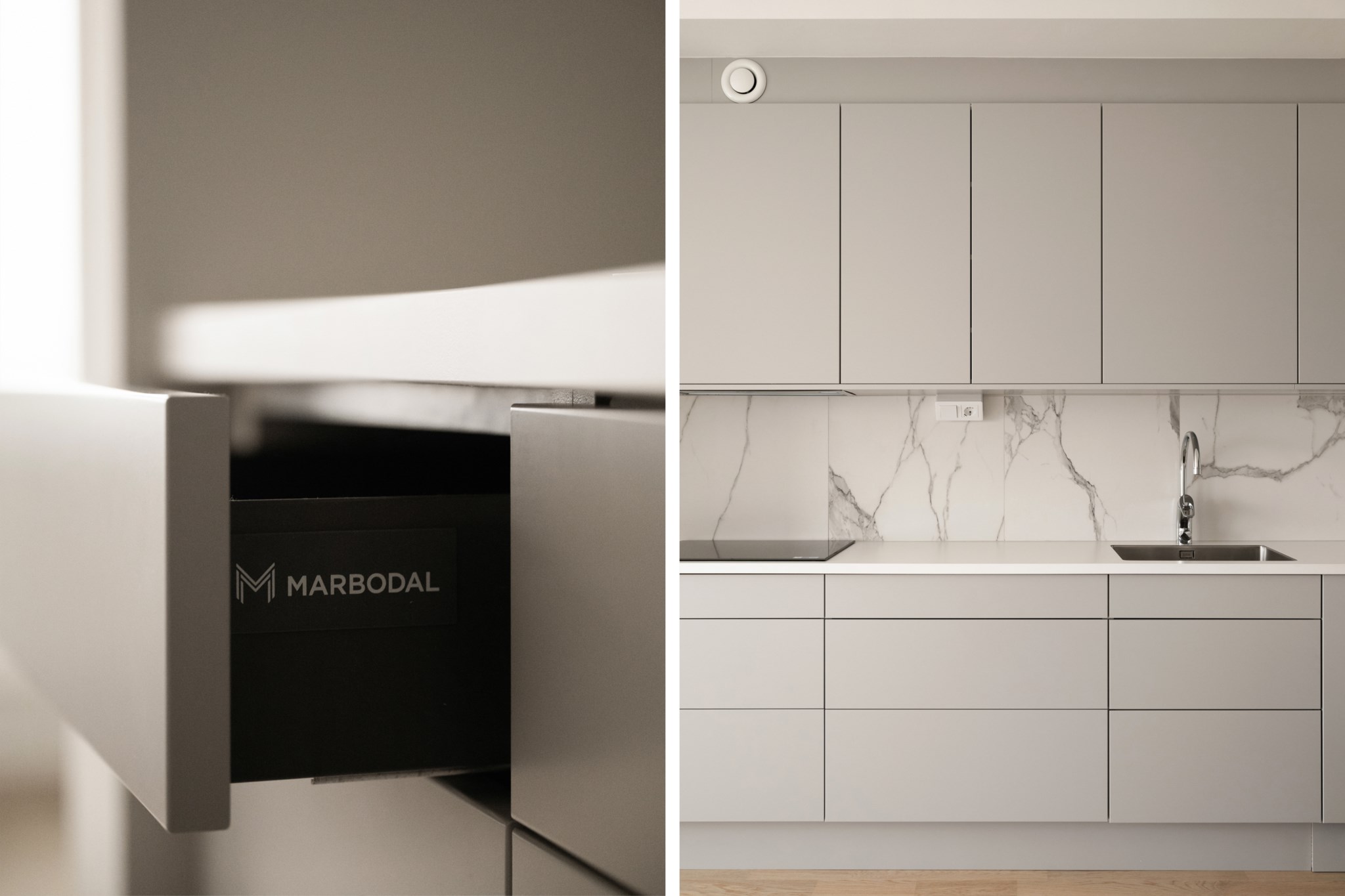 Planlösningen är öppen och social, med ett nytt kök från Marbodal som kommer att utrustas med integrerade vitvaror, induktionshäll och marmorinspirerat stänkskydd – perfekt för både vardagsliv och bjudningar. Vardagsrummet rymmer både matplats och soffgrupp med utsikt som bakgrund.
