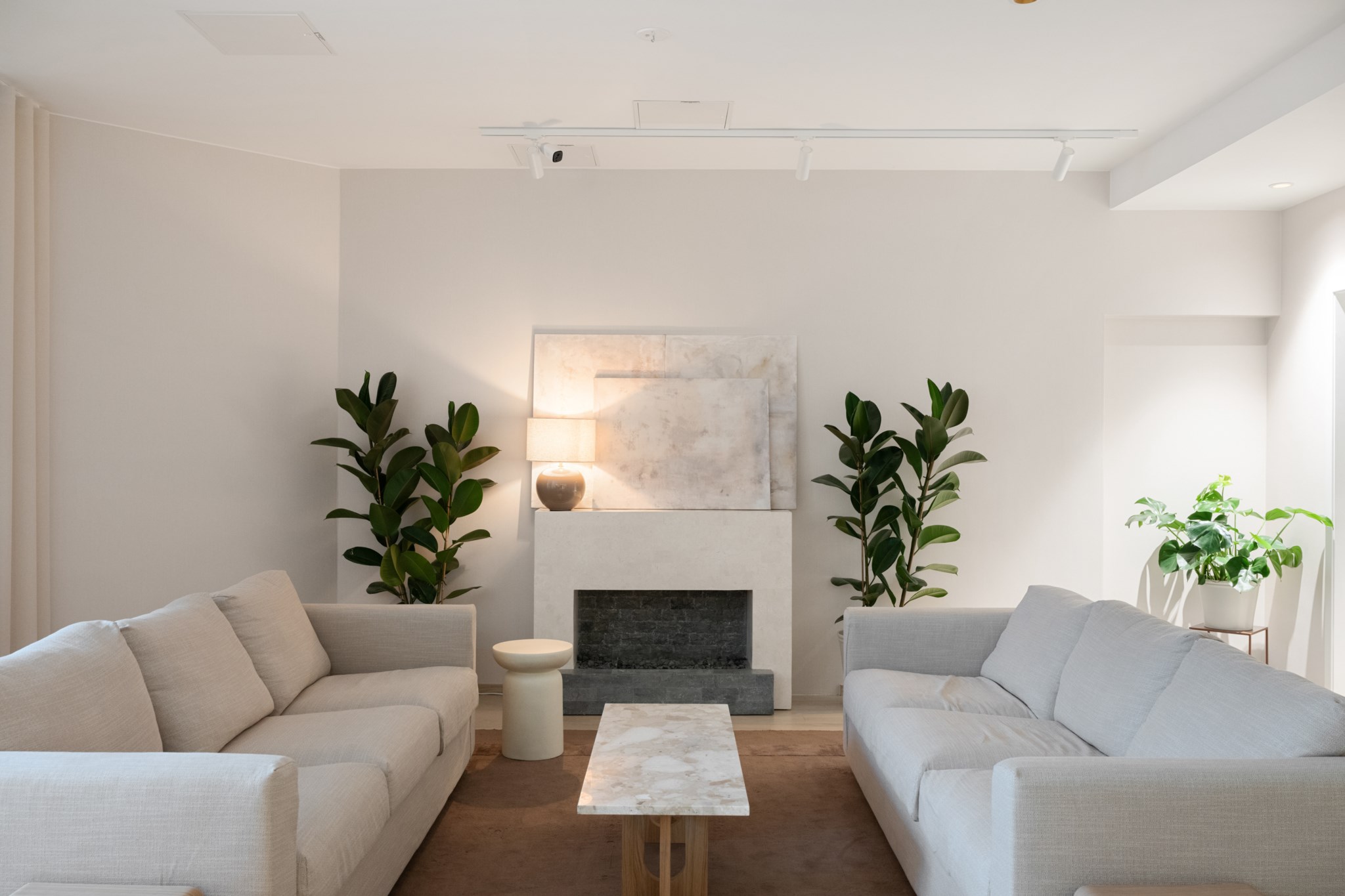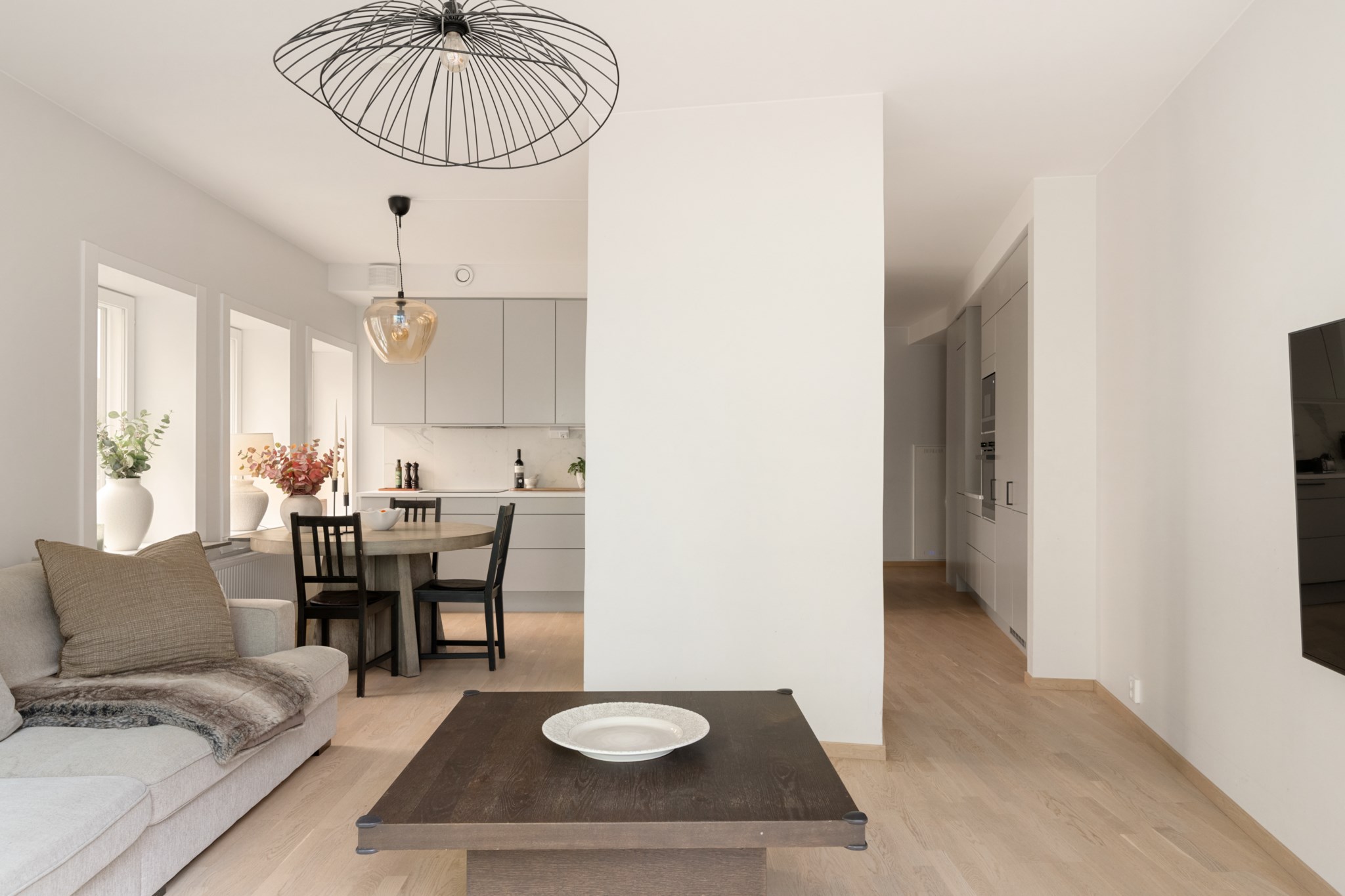 Vardagsrummet badar i ljus tack vare stora fönsterpartier och erbjuder gott om plats för både umgänge och avkoppling. Det stilrena köket är smakfullt inrett med exklusiva vitvaror och påkostade detaljer.