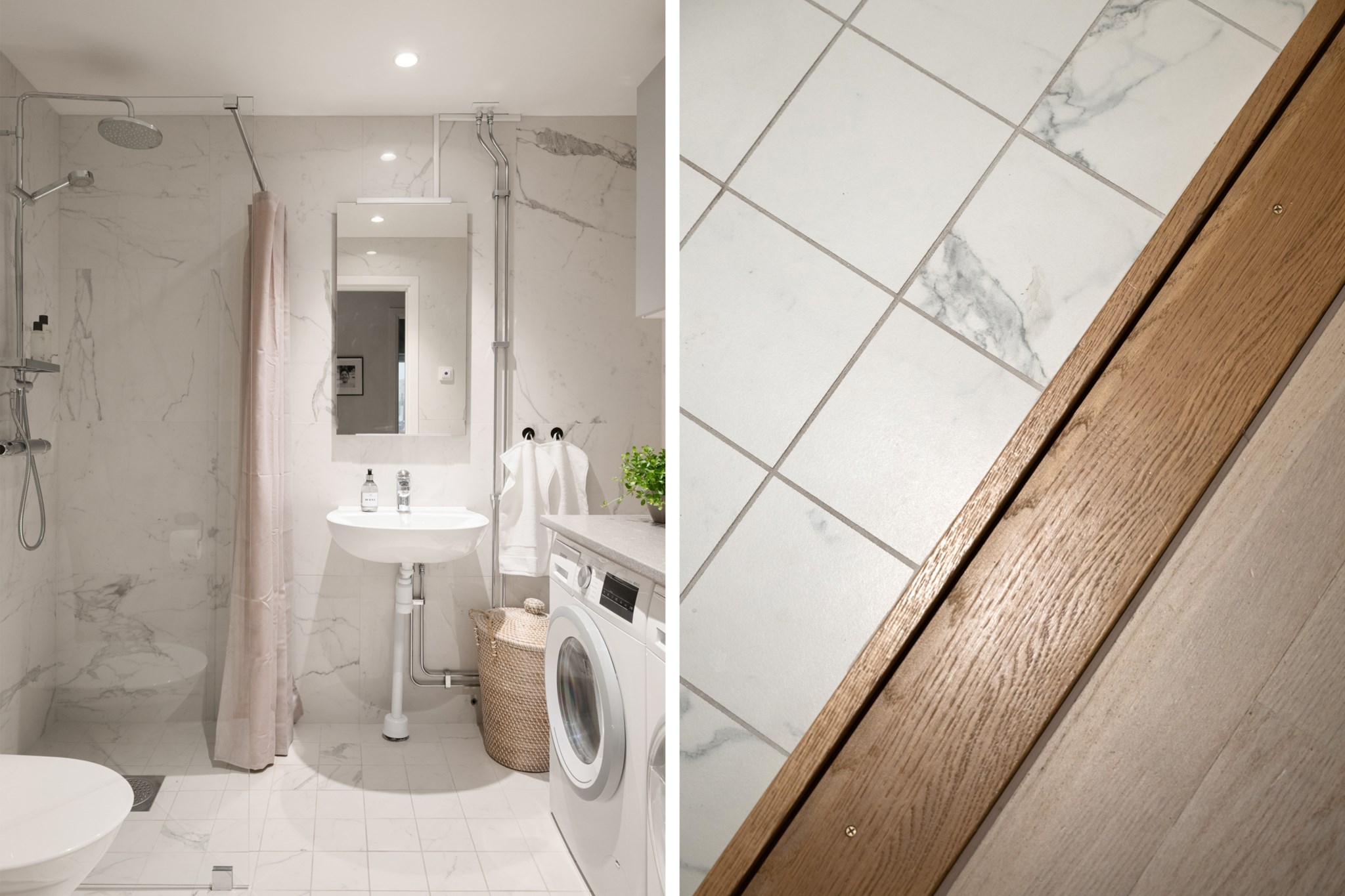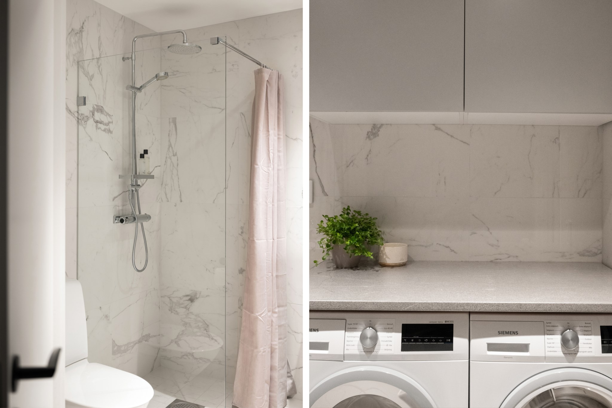 Badrummen är helkaklade och utrustade med tvättmaskin, torktumlare och separat gäst-wc för extra bekvämlighet.