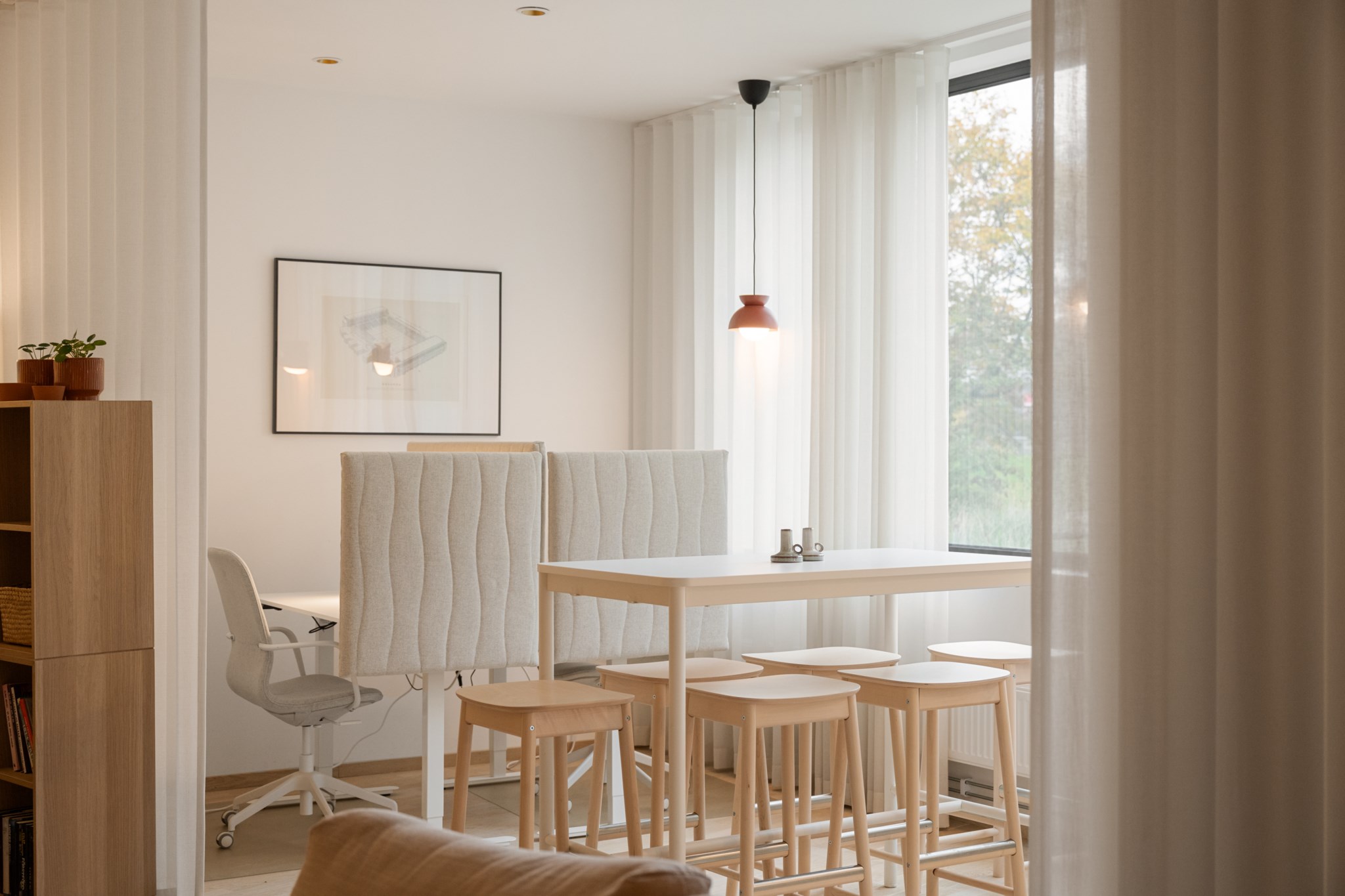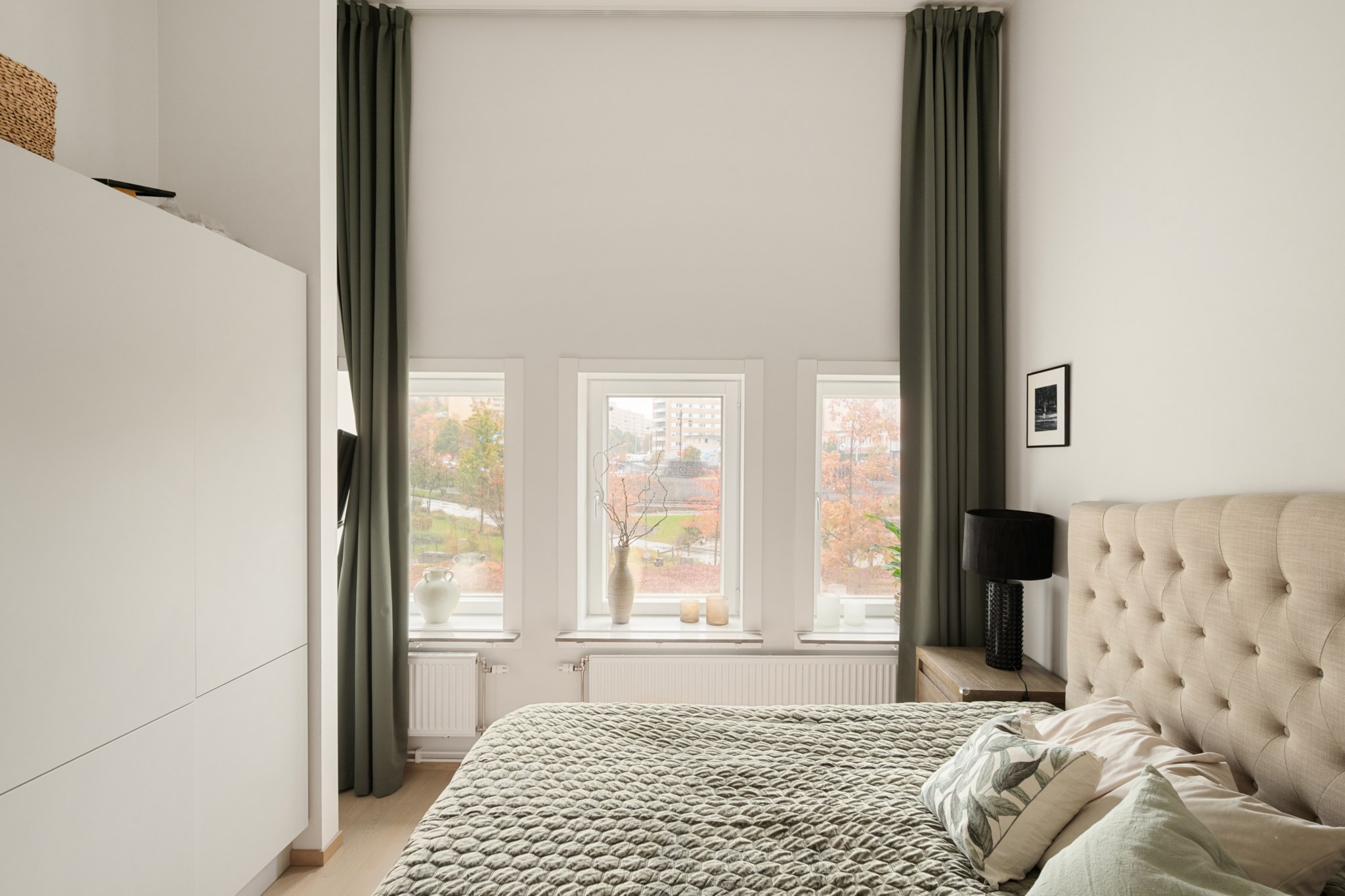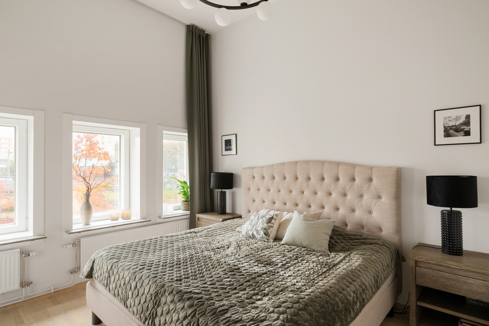 Bostaden präglas av öppen planlösning som skapar en luftig och social atmosfär. Takhöjden på över 3,8 meter i sovrummen ger en exceptionell rymd och karaktär – och för den som vill kan samma känsla enkelt skapas även i vardagsrum och kök.