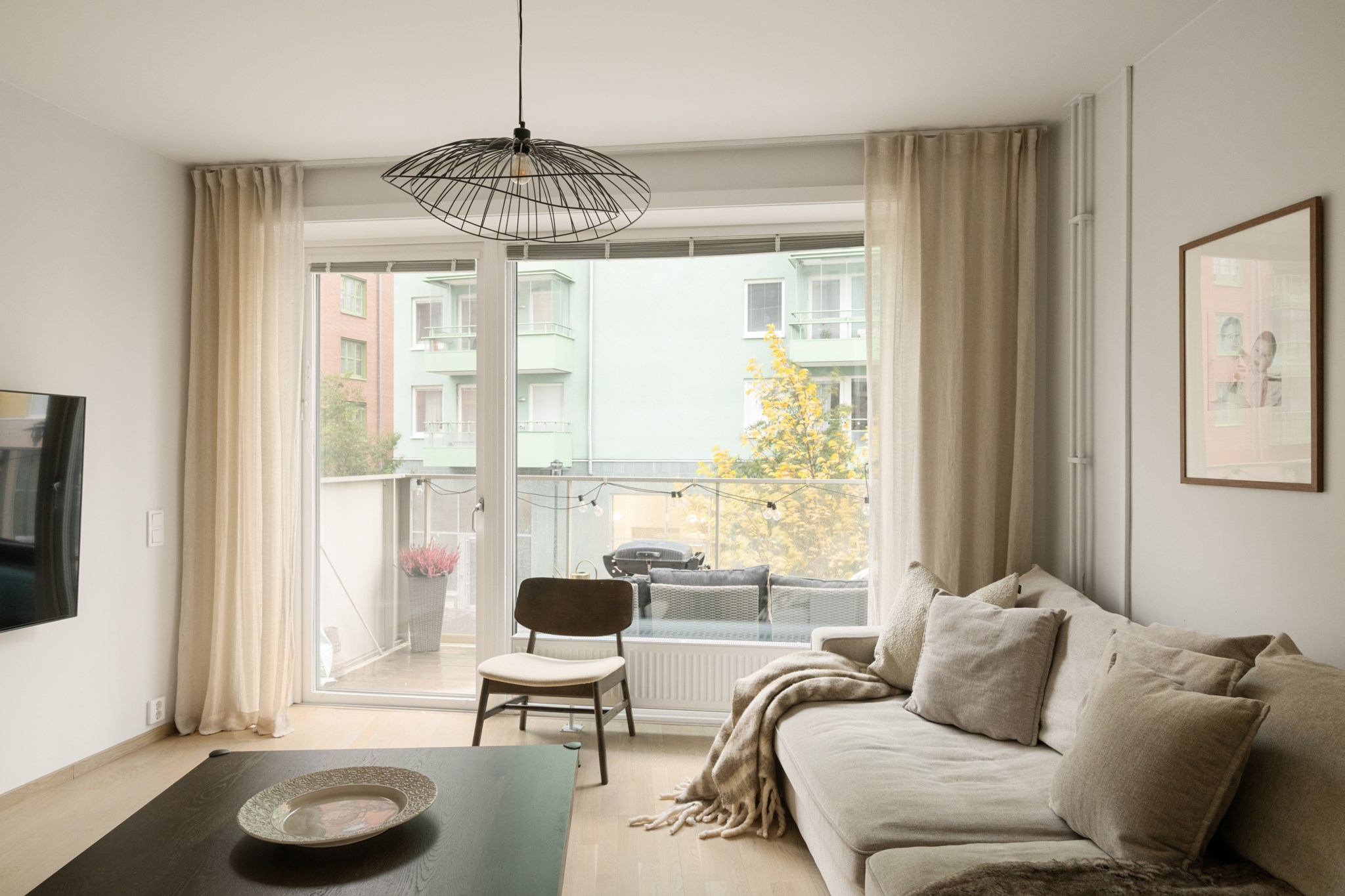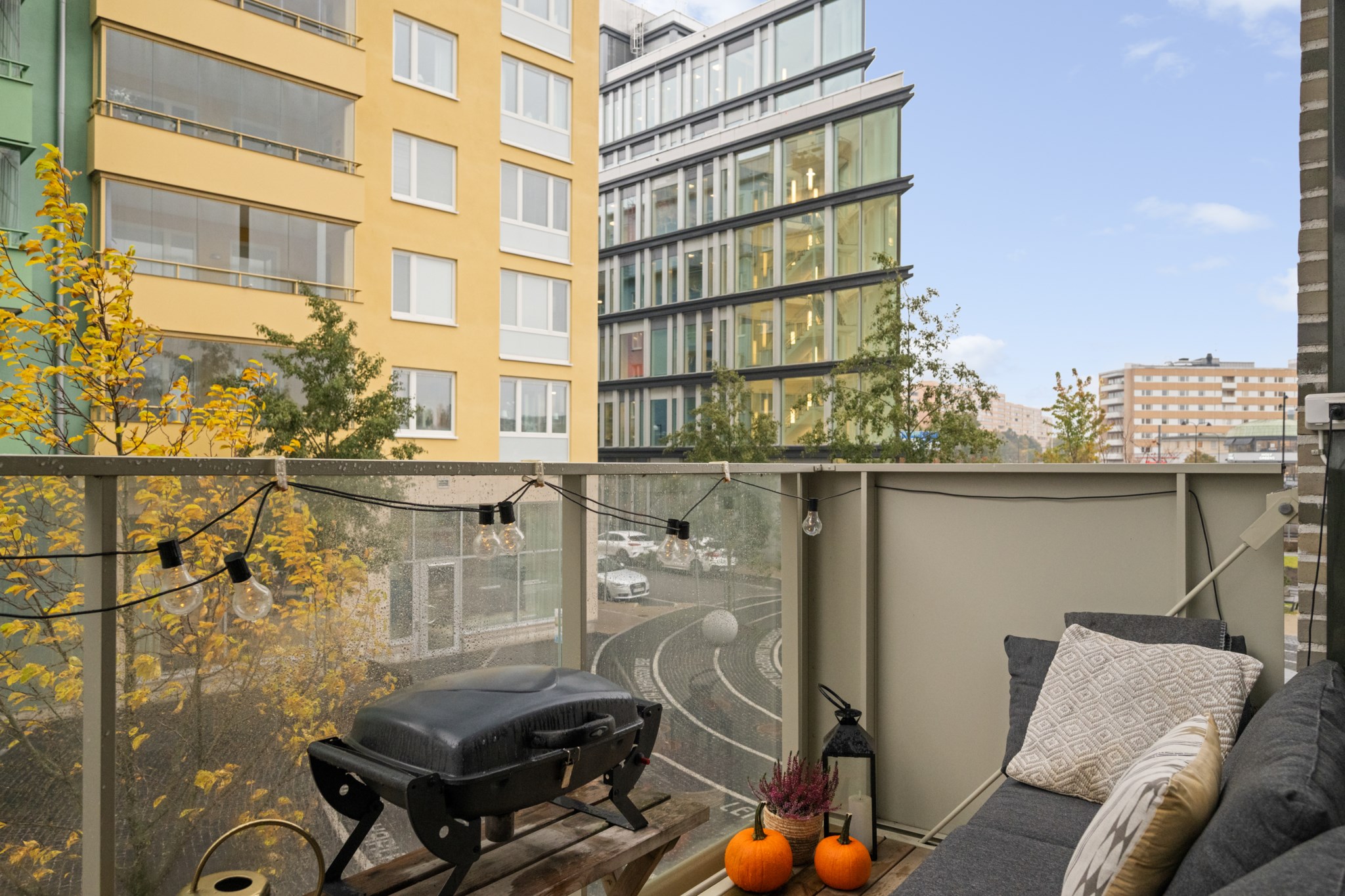Den rymliga balkongen blir en naturlig förlängning av bostaden och erbjuder en perfekt plats för avkoppling eller middagar i kvällssolen.