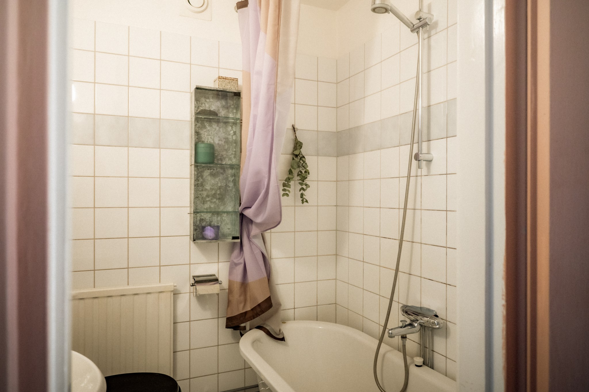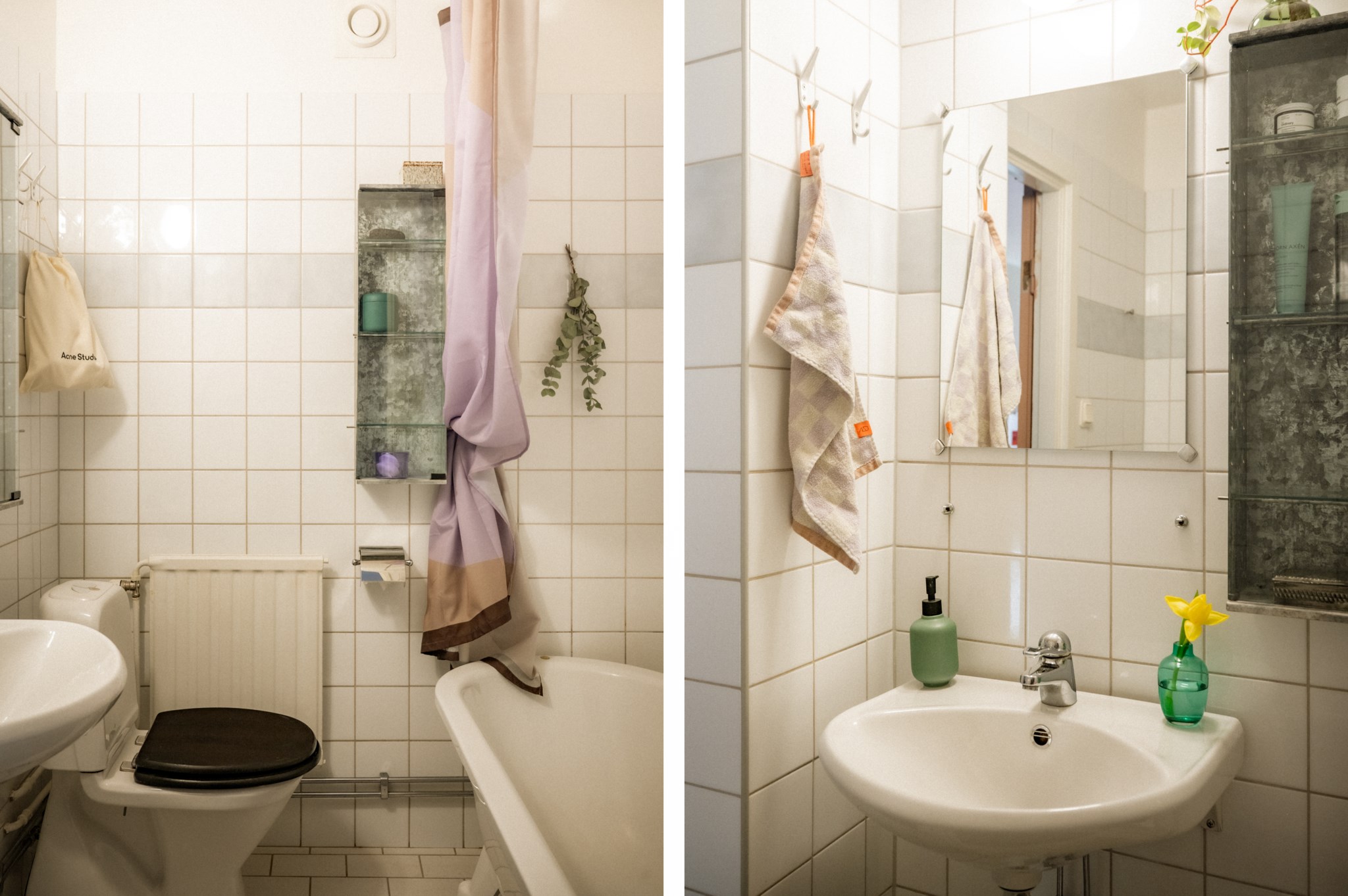 Badrummet är stilrent och utrustat med badkar, wc och handfat.