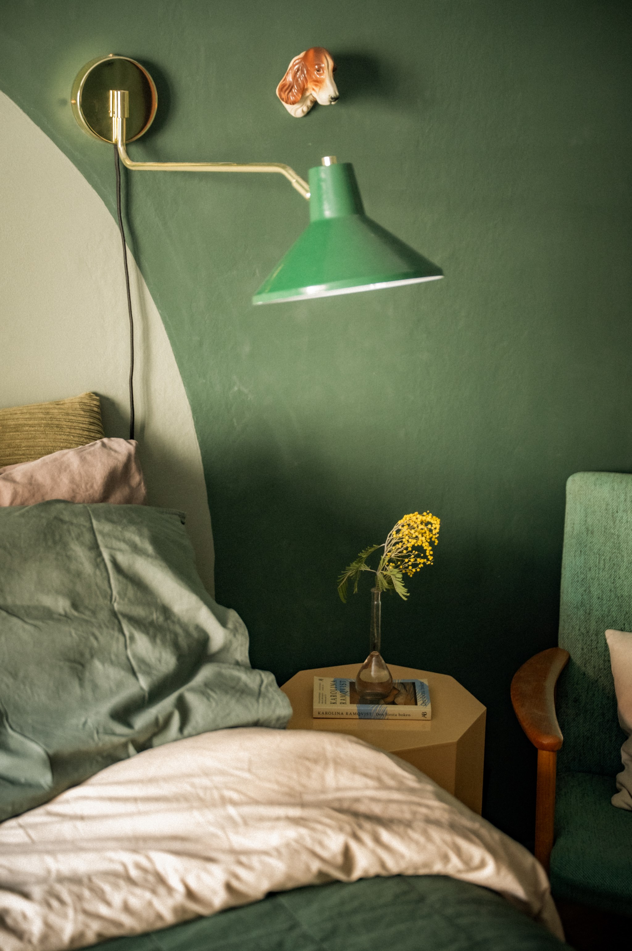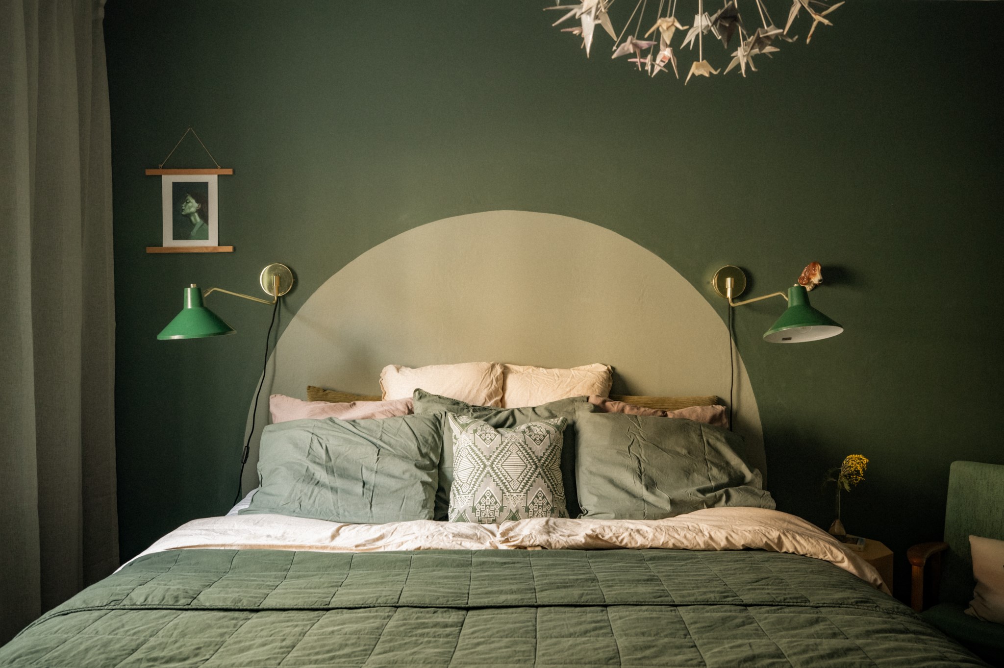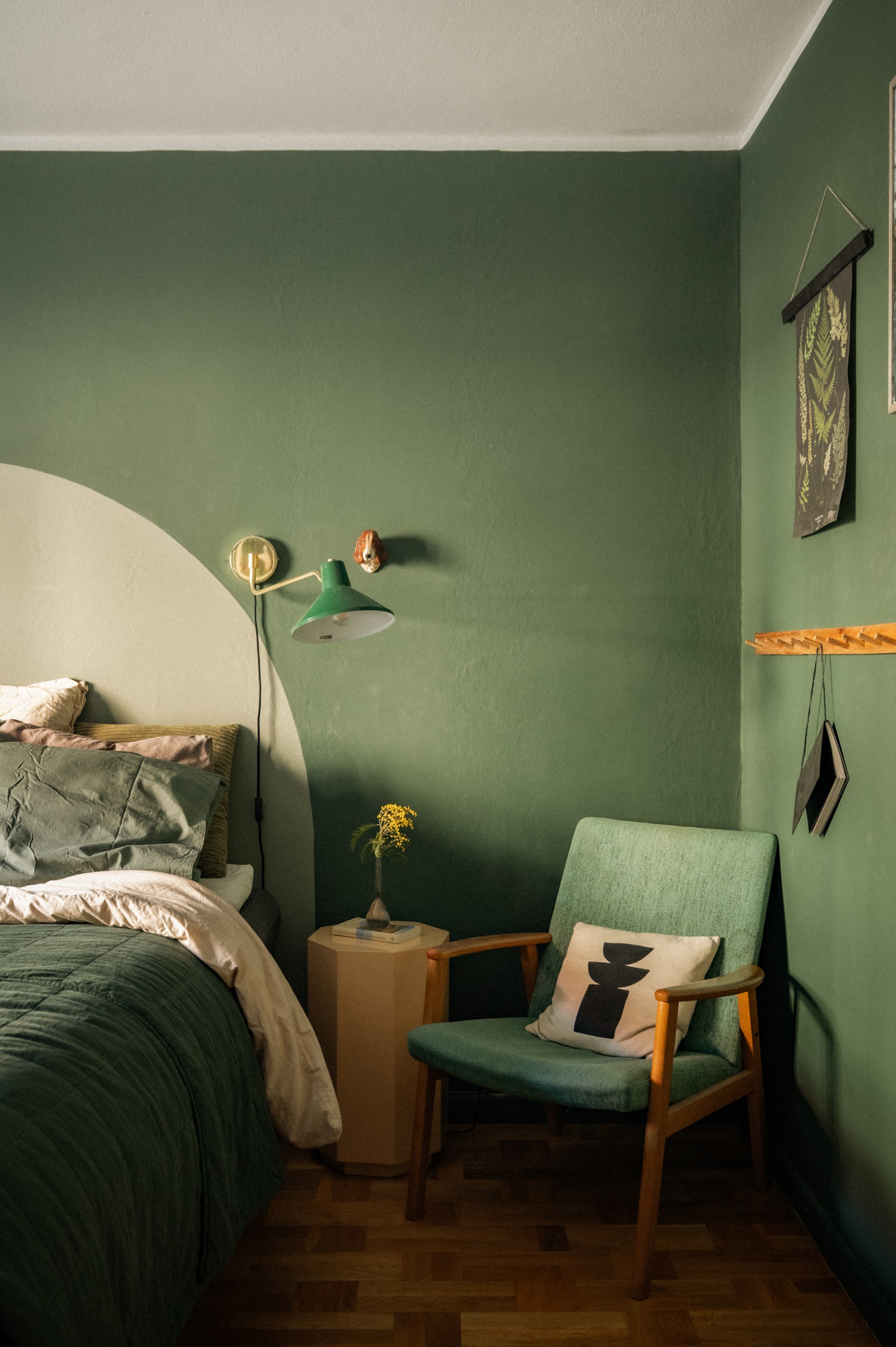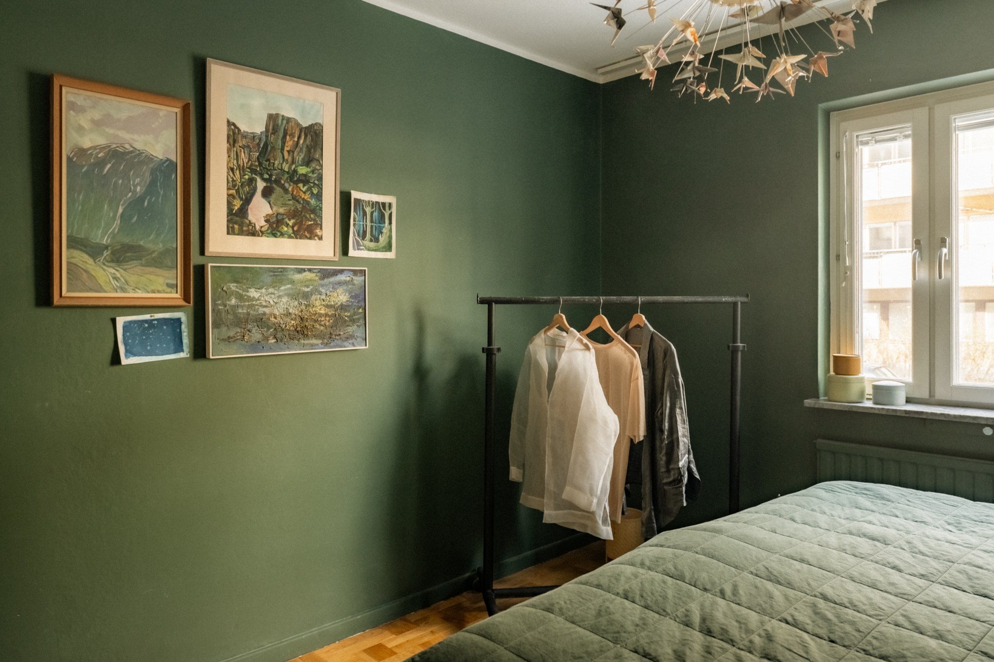 Sovrummet är rofyllt placerat och erbjuder plats för dubbelsäng samt ytterligare möblemang. Den djupa gröna färgsättningen bidrar till en lugn och harmonisk känsla som passar väl för ett sovrum.