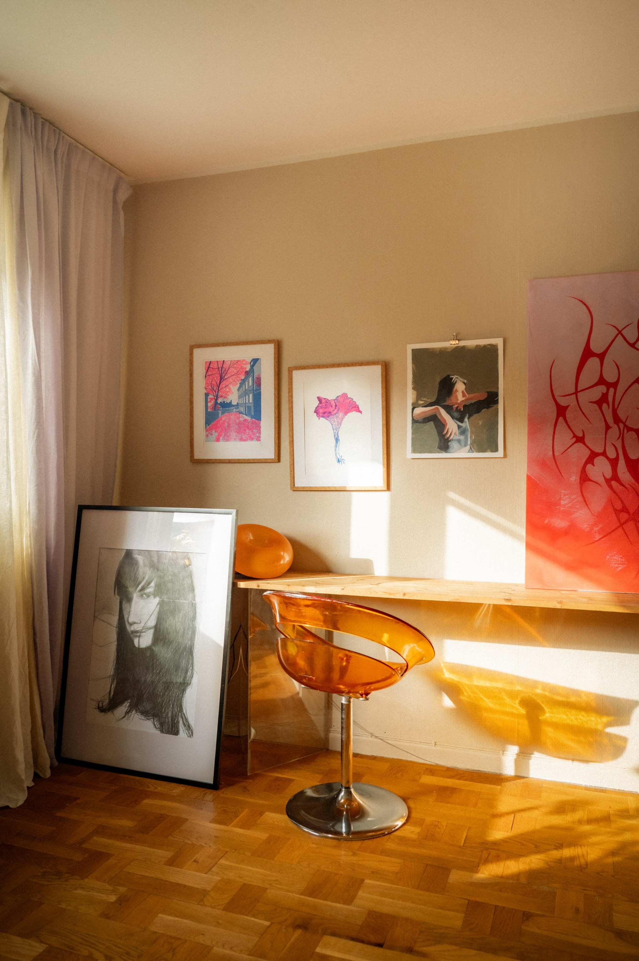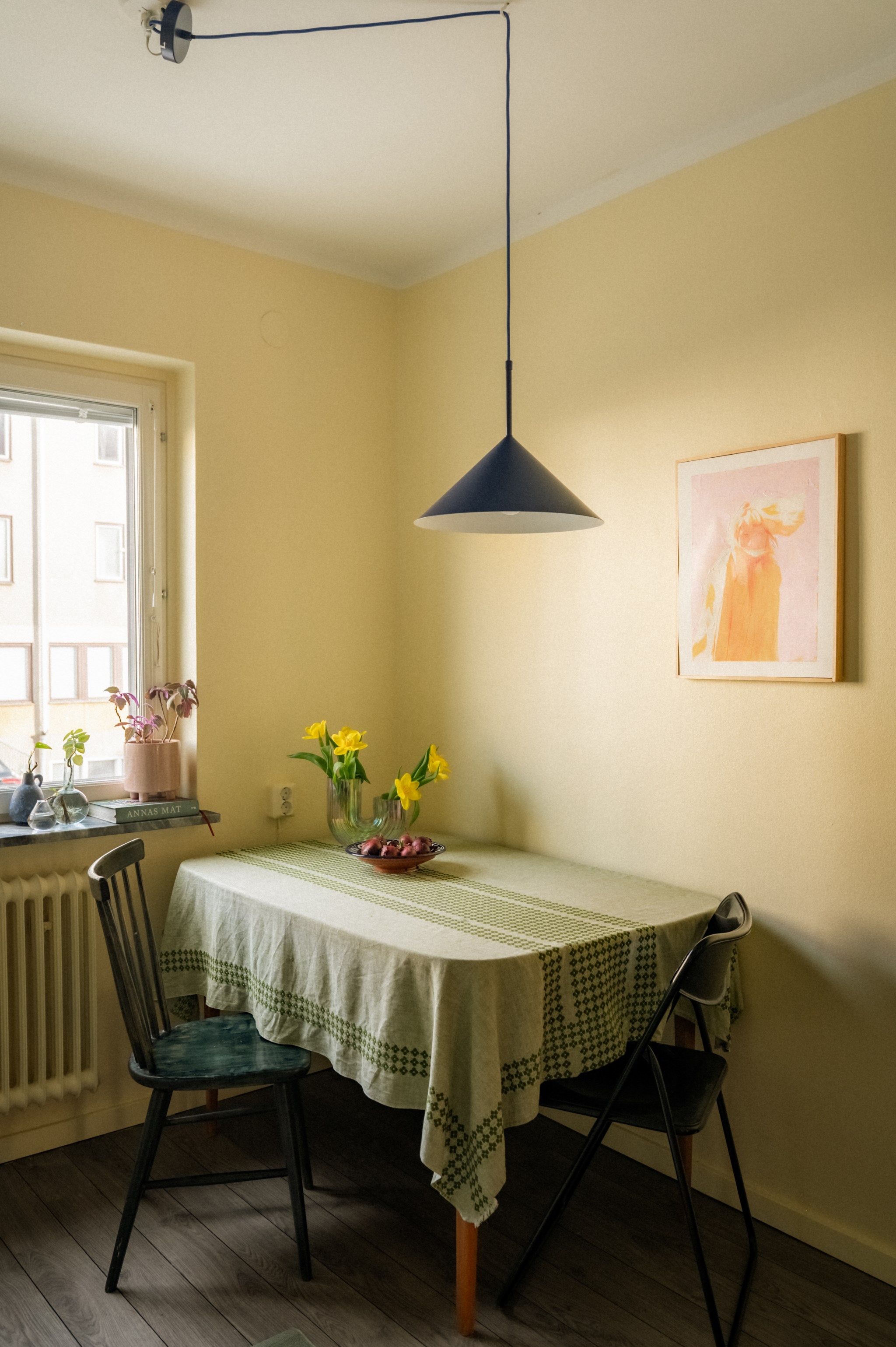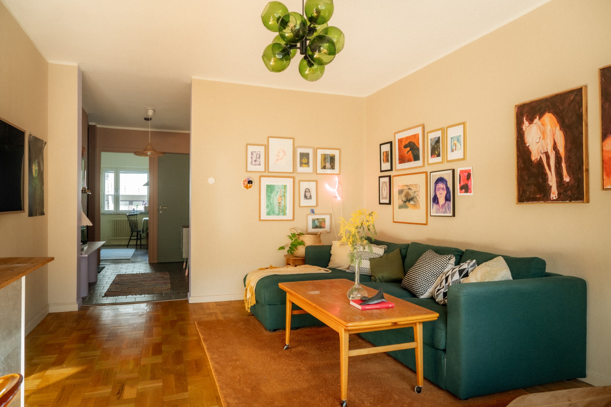 Vardagsrummet är rymligt och ljust med vackert parkettgolv och generöst ljusinsläpp från fönsterpartiet. Här finns gott om plats för både soffgrupp och matplats och rummet bjuder in till både sociala tillställningar och lugna kvällar hemma. Väggarna pryds av konst och tillsammans med rummets varma färgsättning skapas en ombonad och trivsam miljö.