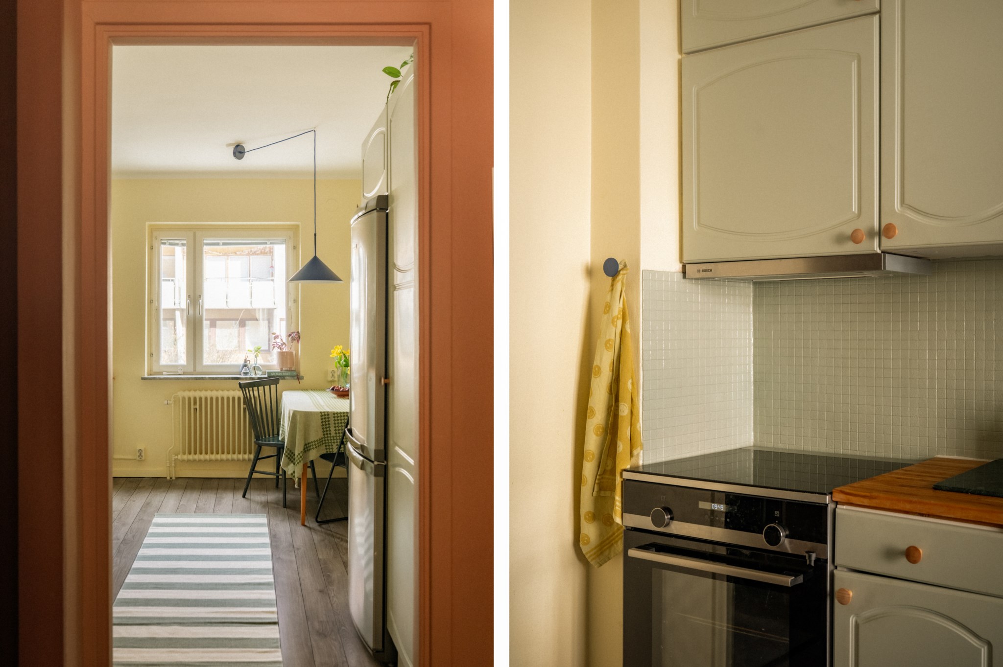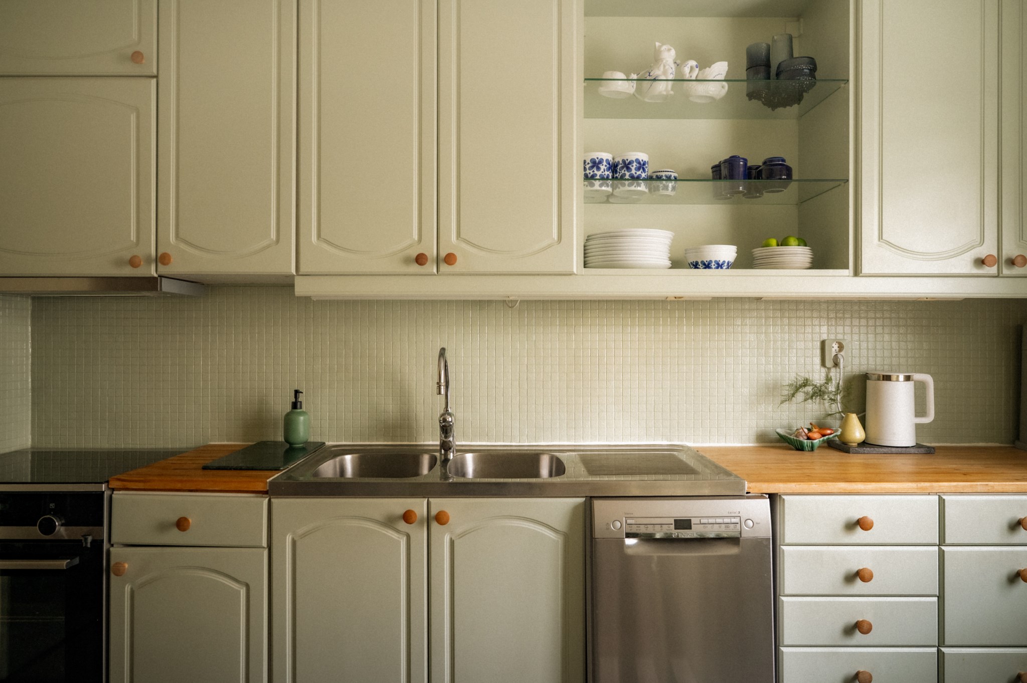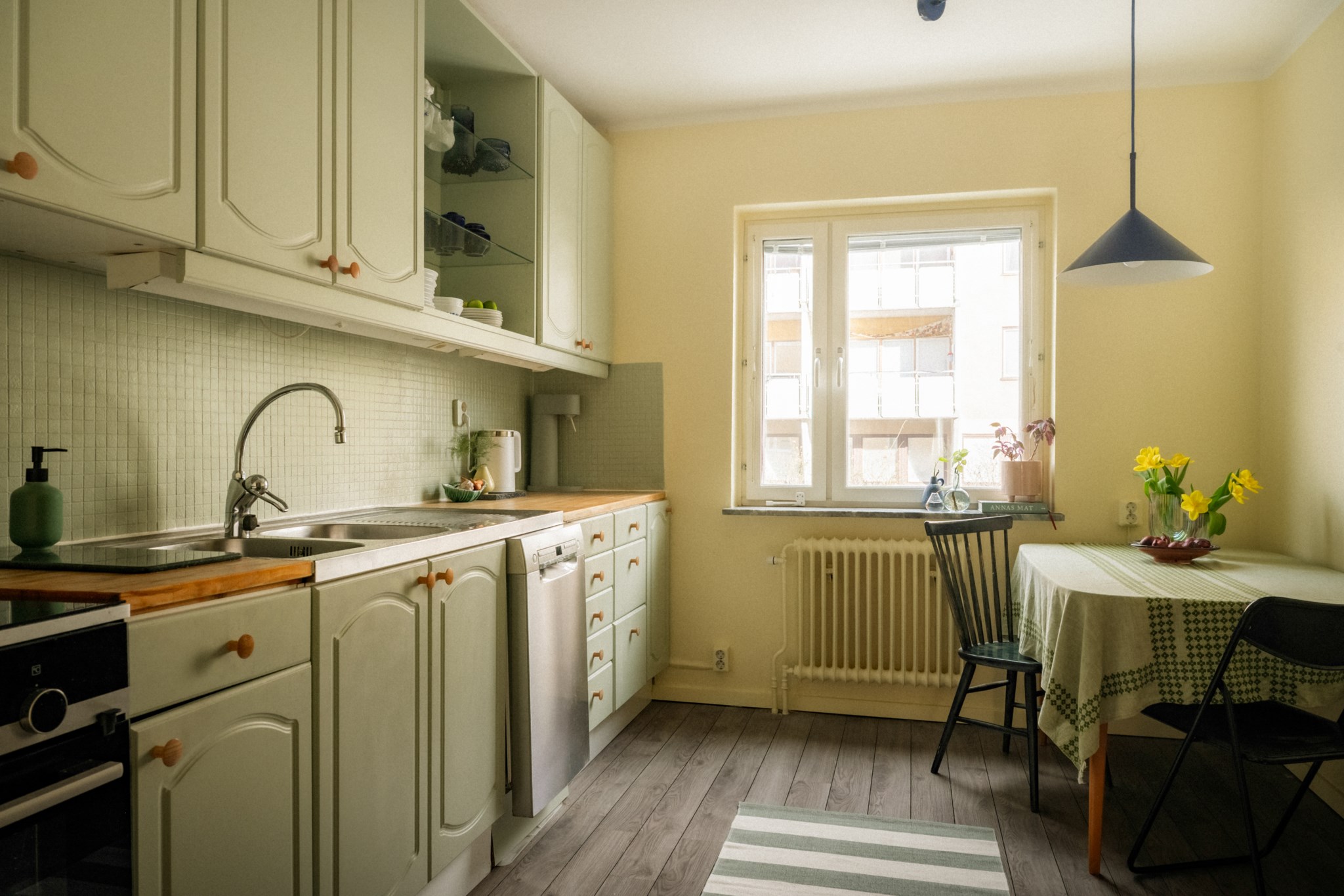 Köket är hemtrevligt och funktionellt med goda arbetsytor, bra förvaring och plats för matbord vid fönster. Här finns alla förutsättningar för både vardagsmatlagning och trevliga middagar.