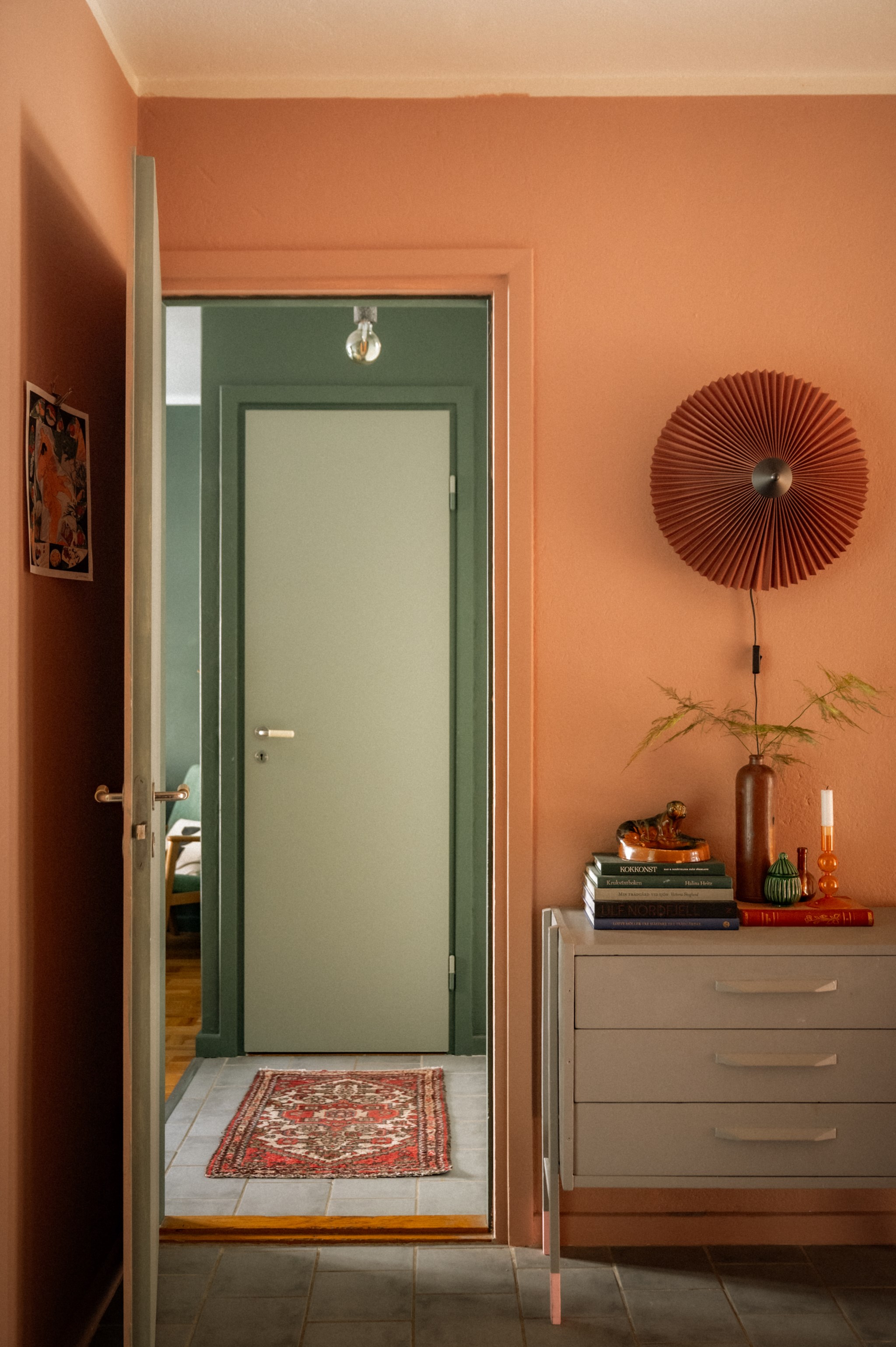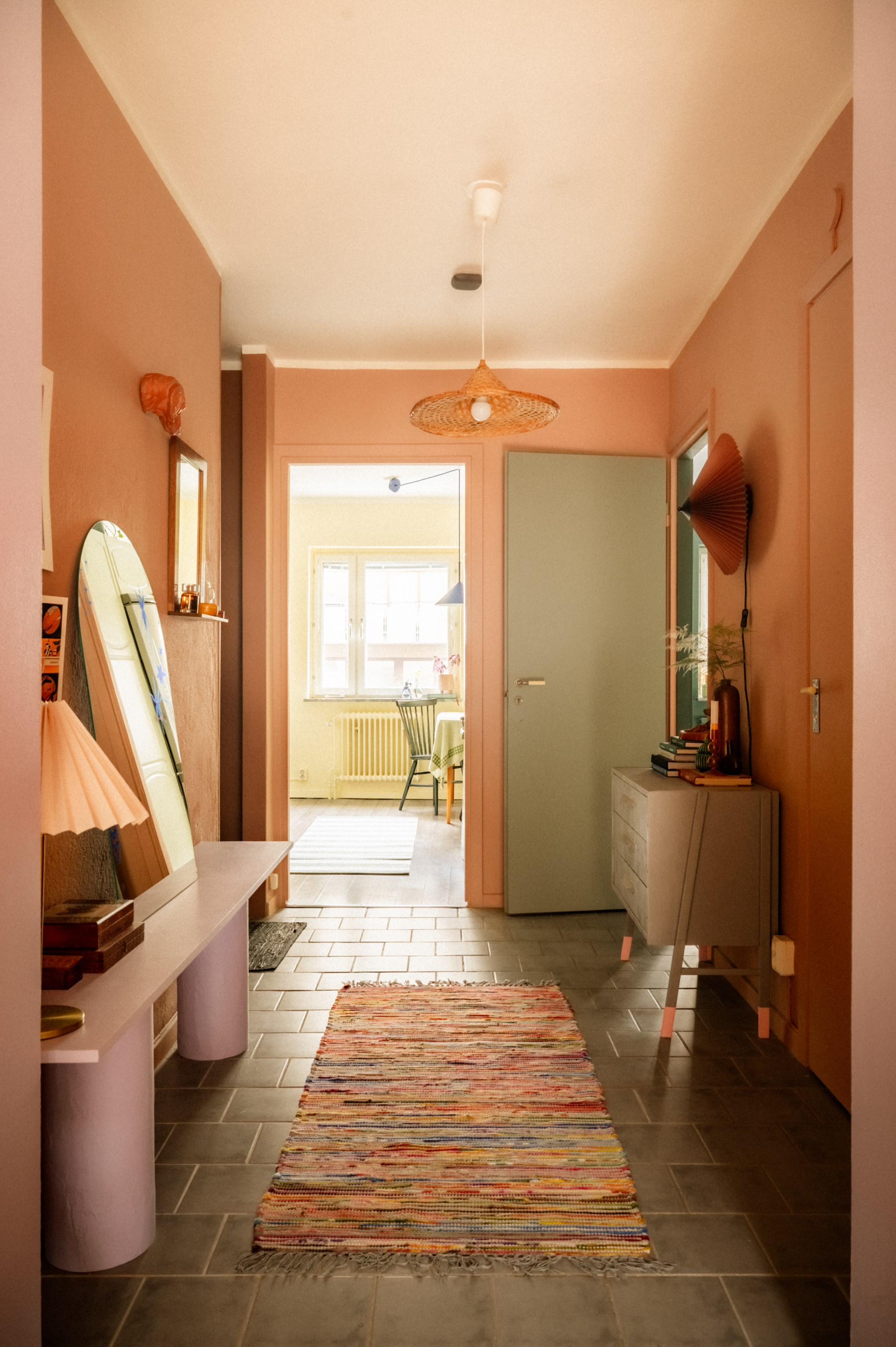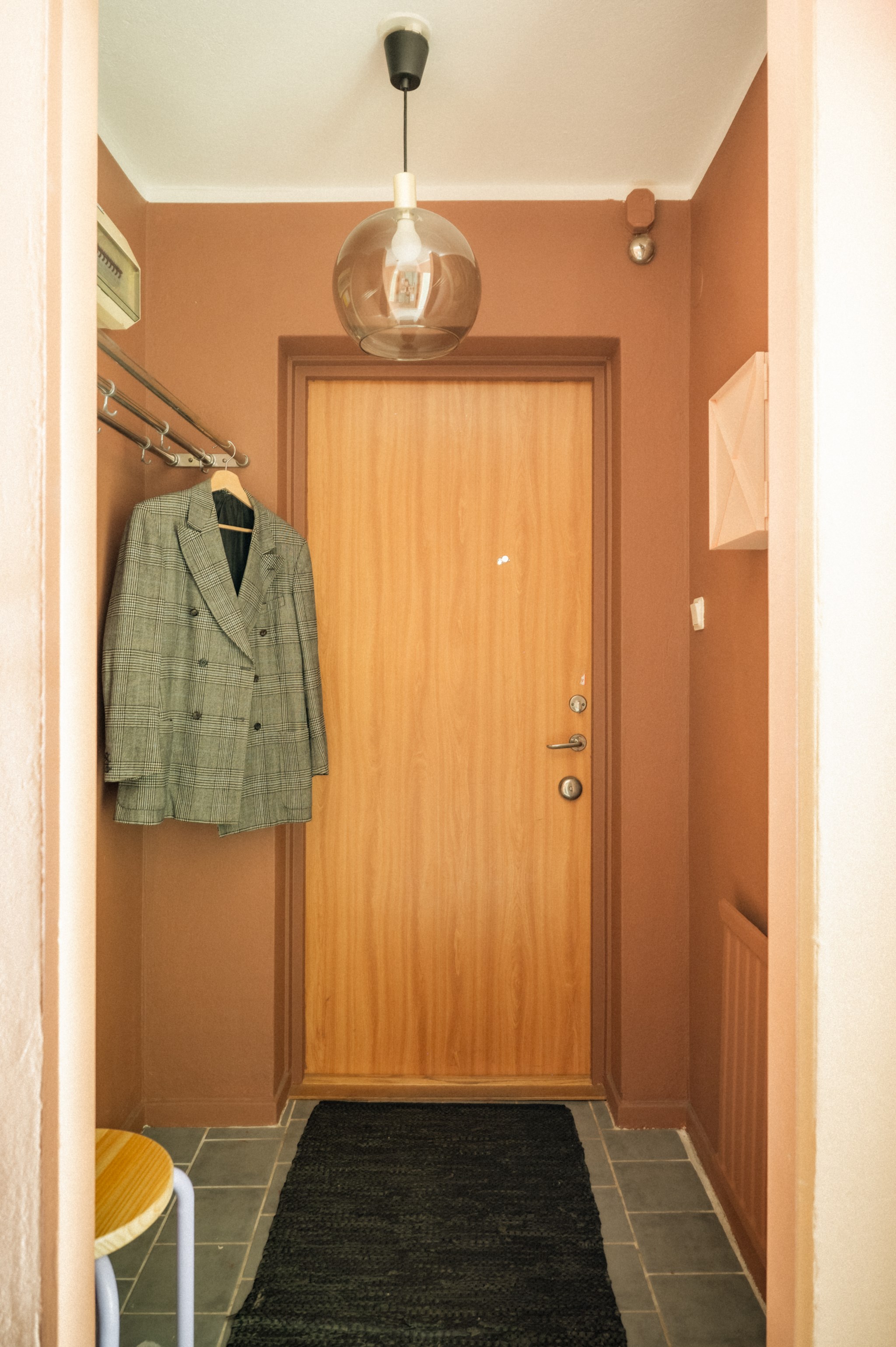 Redan i hallen sätts tonen för bostaden. Den varma färgsättningen skapar ett starkt första intryck och här finns gott om plats för ytterkläder och förvaring. Från hallen nås bostadens samtliga rum vilket ger en praktisk och funktionell planlösning.