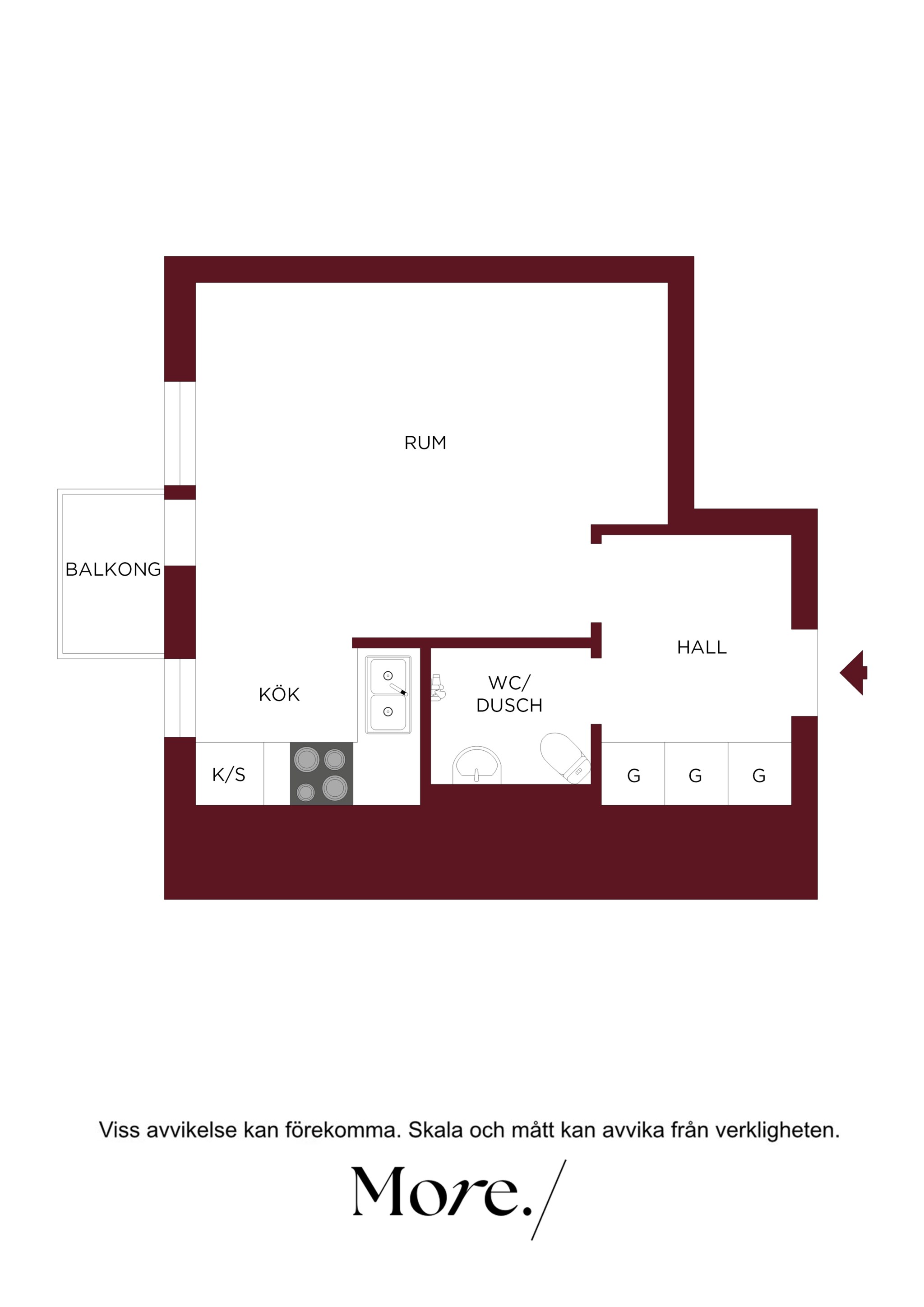 Redan i hallen möts du av en praktisk och inbjudande entré med goda förvaringsmöjligheter. Vidare in öppnar bostaden upp sig mot ett ljust och trivsamt allrum med plats för både soffgrupp, säng och matplats. Den smarta disponeringen gör det enkelt att skapa en tydlig rumsindelning trots den kompakta ytan. Den mörka fondväggen tillför karaktär och skapar en ombonad känsla.