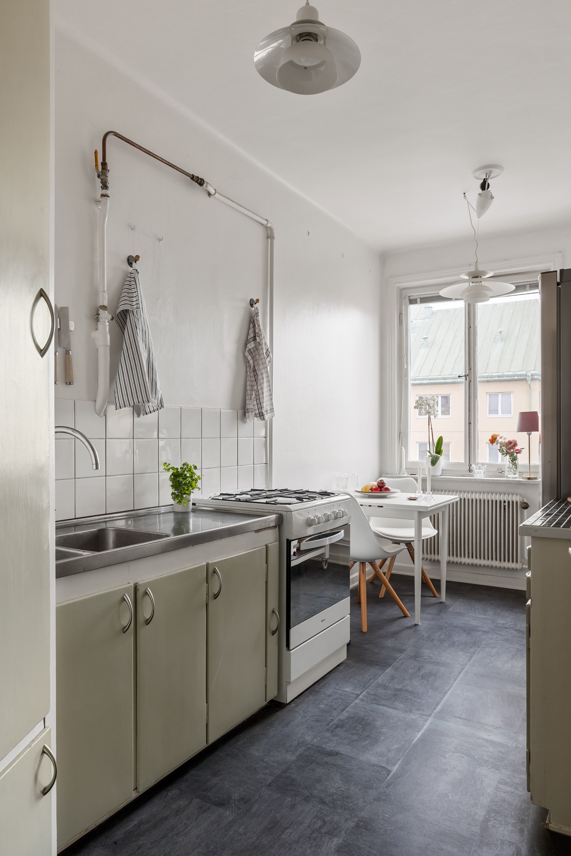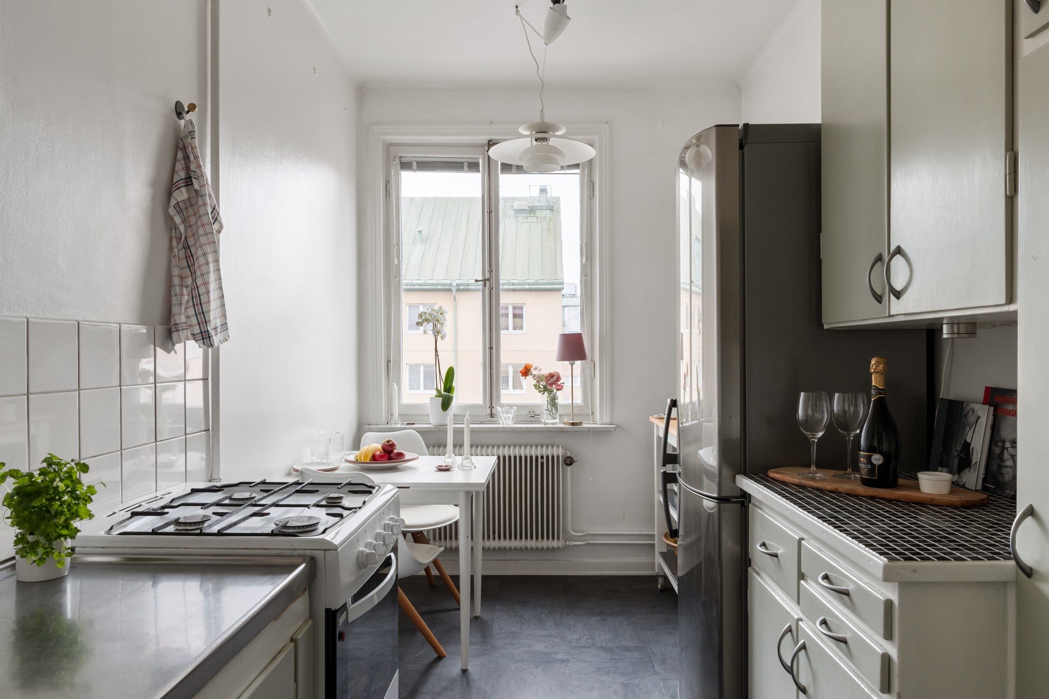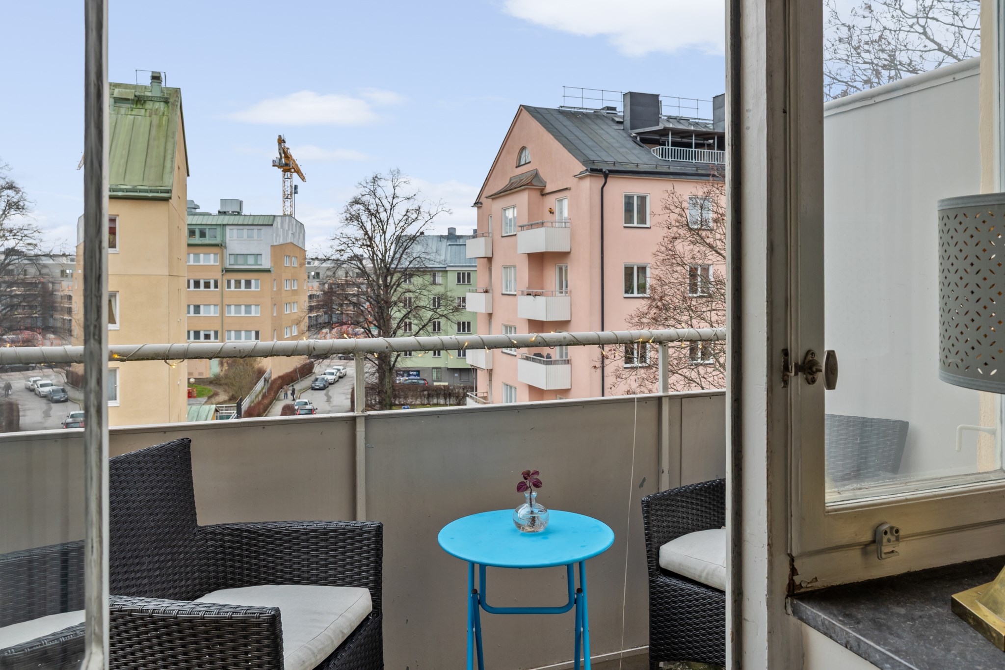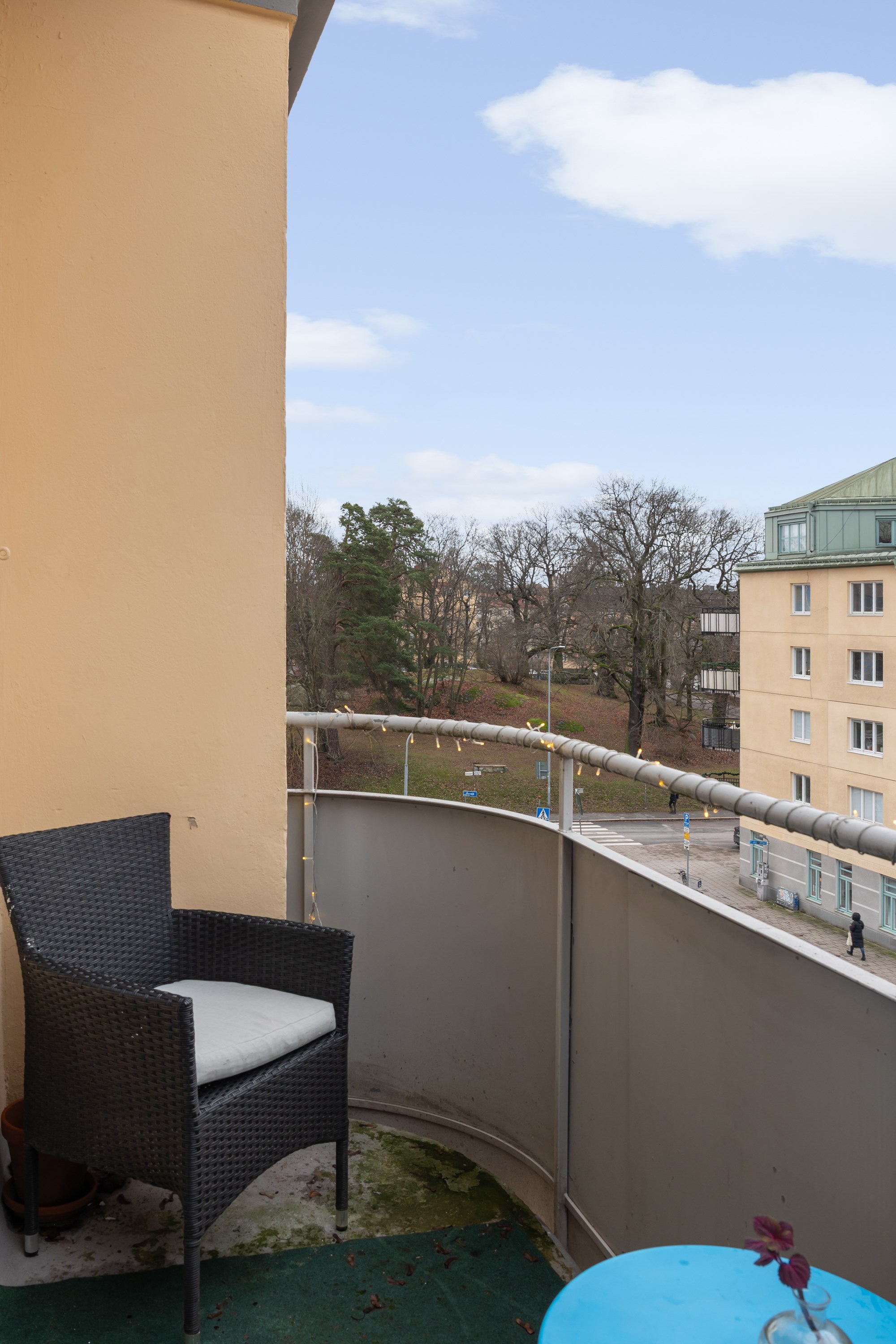 Bostaden ligger högt upp i huset och har balkong – ett perfekt läge för eftermiddagskaffe, odling eller en stunds avkoppling i solen. Lägenheten är genomgående ljus med generösa fönsterpartier som släpper in ordentligt med dagsljus. Planlösningen är smart och effektiv, och köket erbjuder gott om förvaring och arbetsyta. För den som vill finns möjlighet att dela av för att skapa ett separat sovrum.