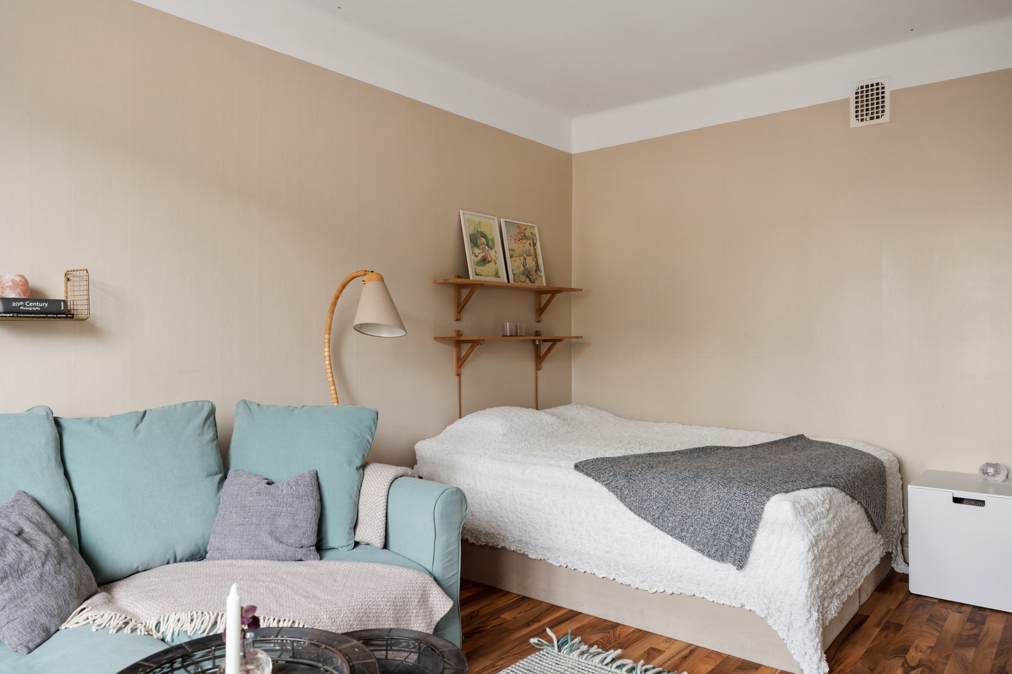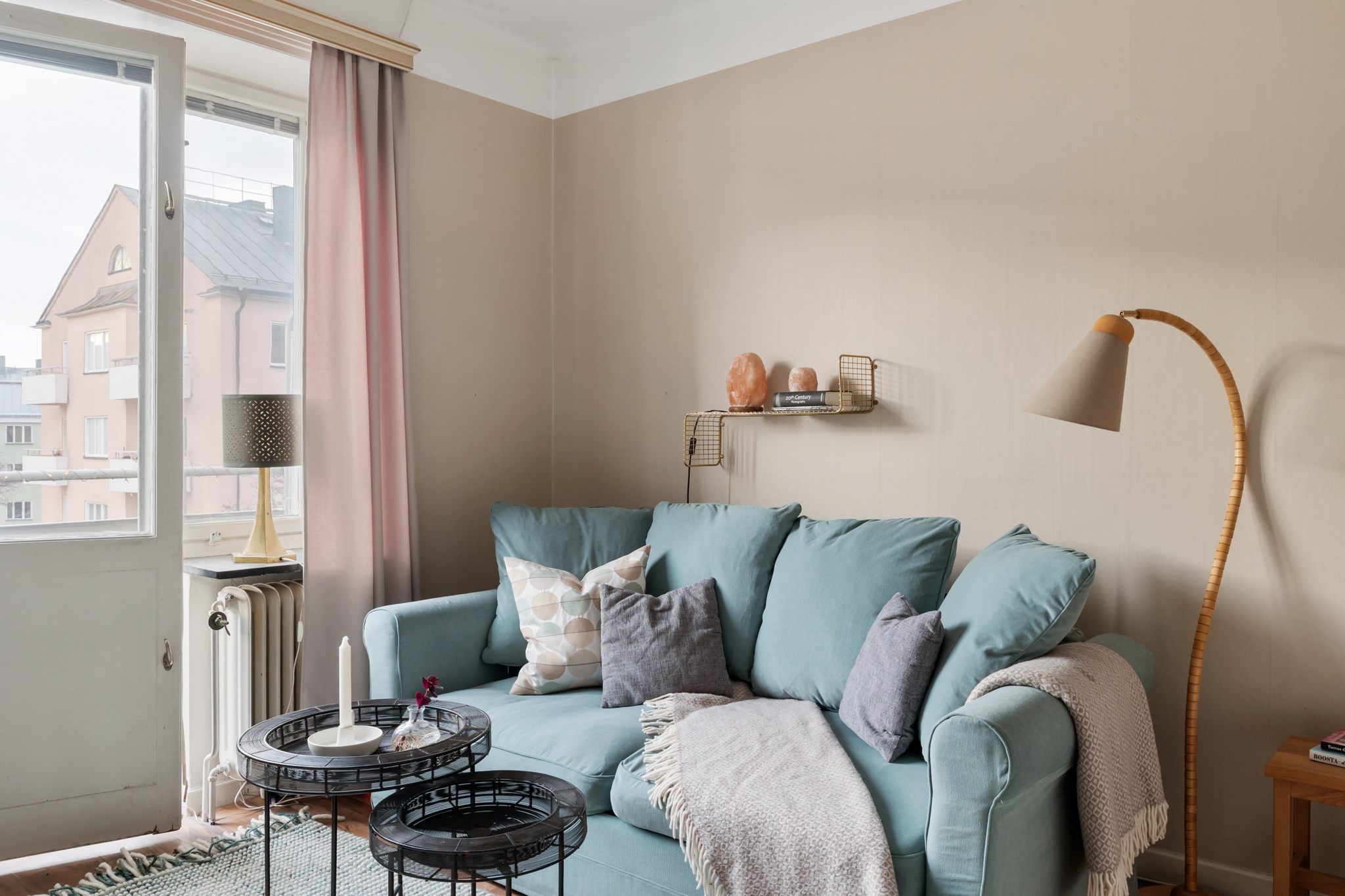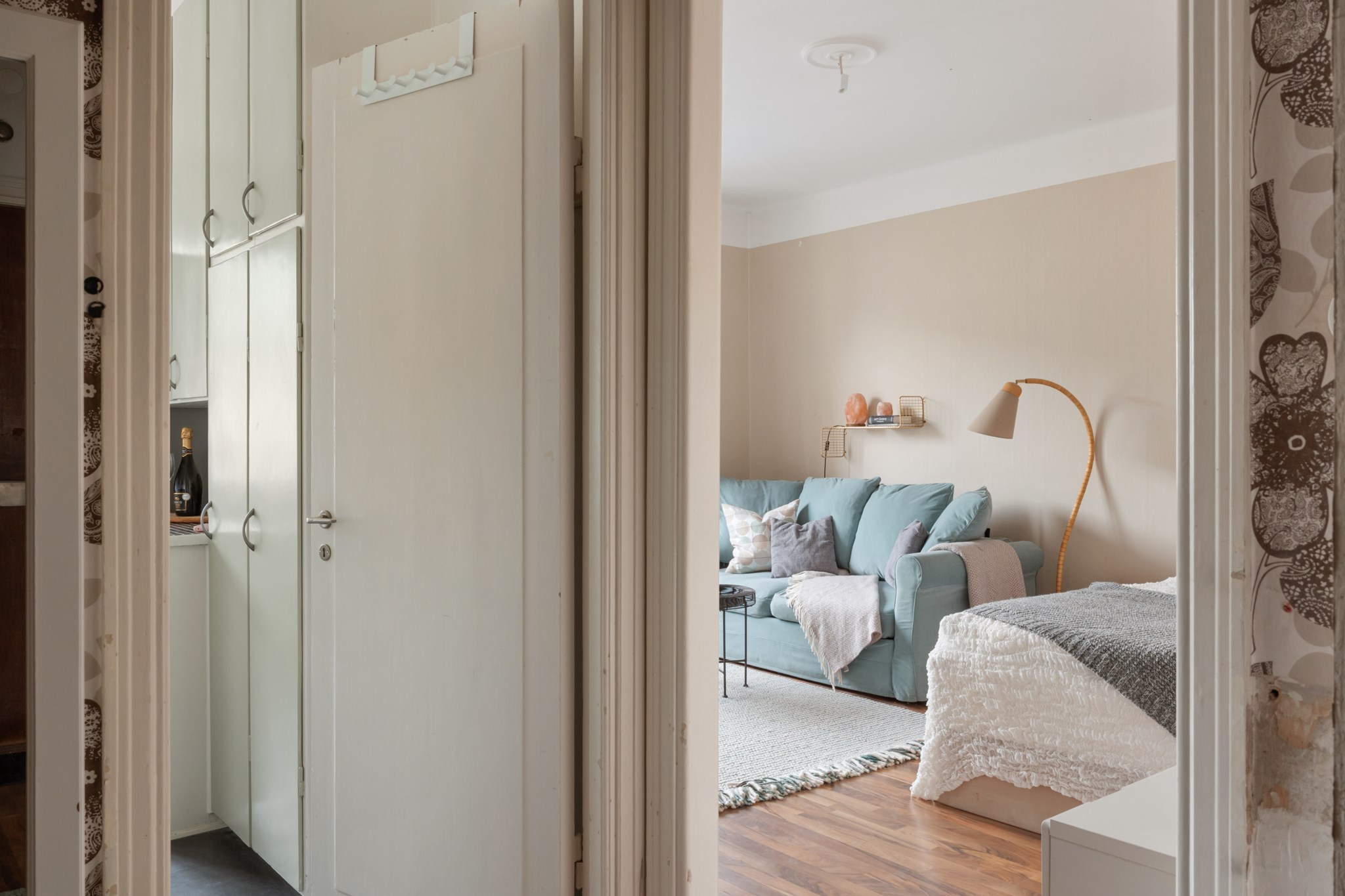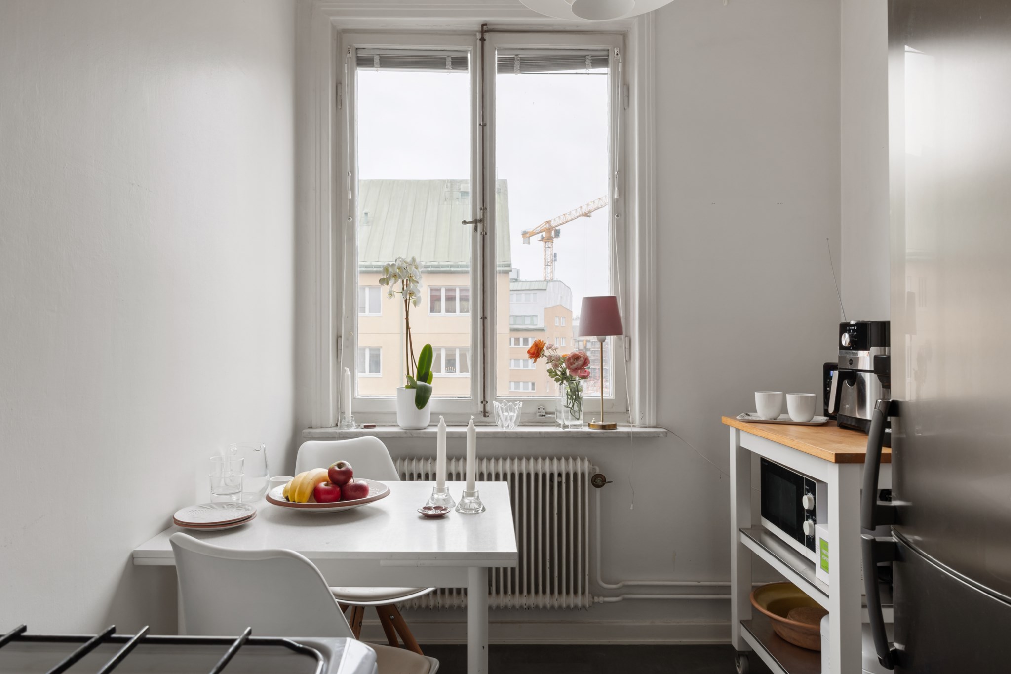 Bostaden ligger högt upp i huset och har balkong – ett perfekt läge för eftermiddagskaffe, odling eller en stunds avkoppling i solen. Lägenheten är genomgående ljus med generösa fönsterpartier som släpper in ordentligt med dagsljus. Planlösningen är smart och effektiv, och köket erbjuder gott om förvaring och arbetsyta. För den som vill finns möjlighet att dela av för att skapa ett separat sovrum.