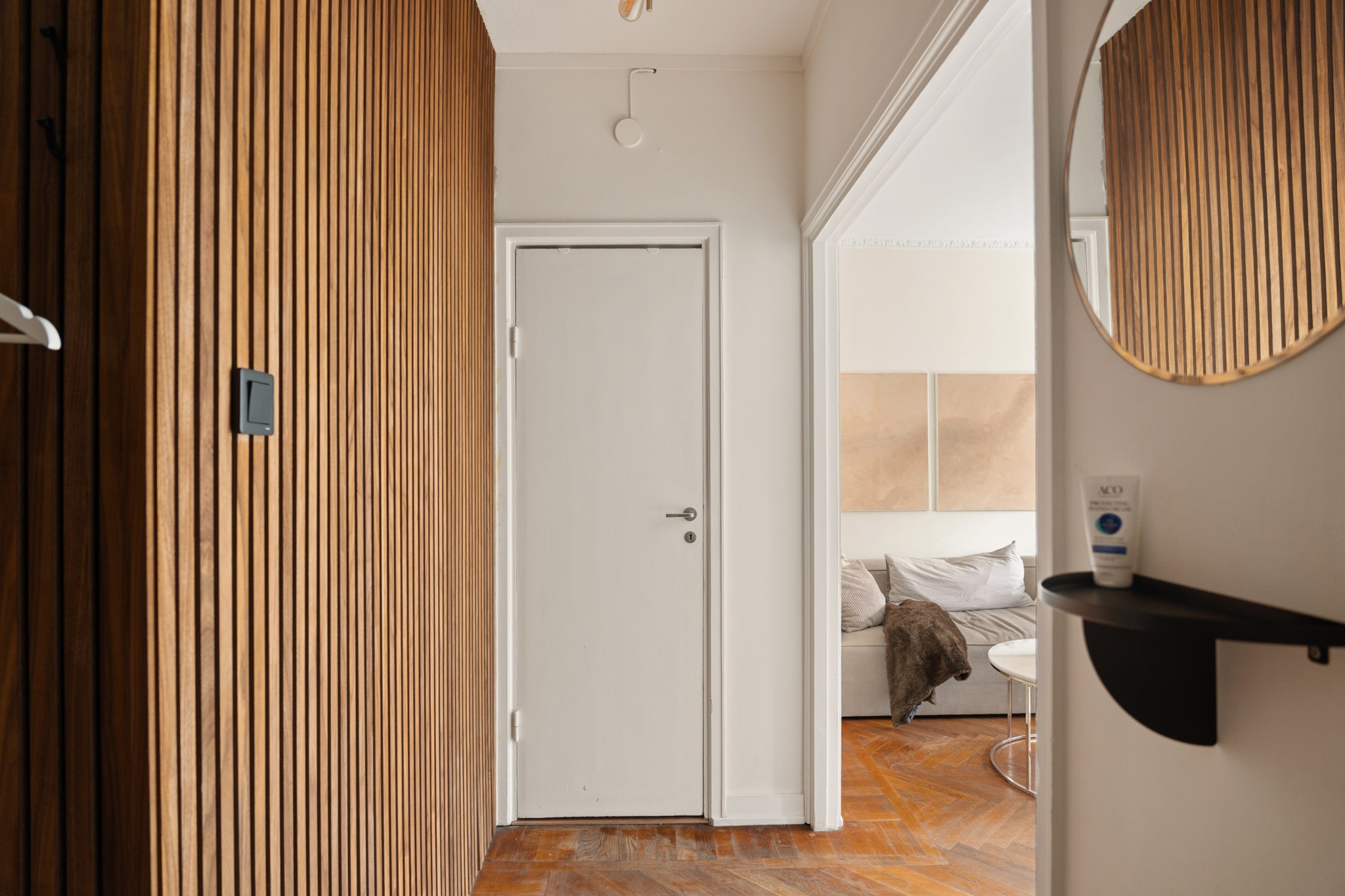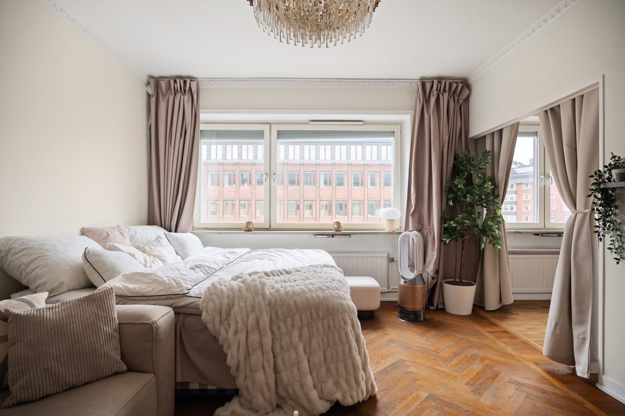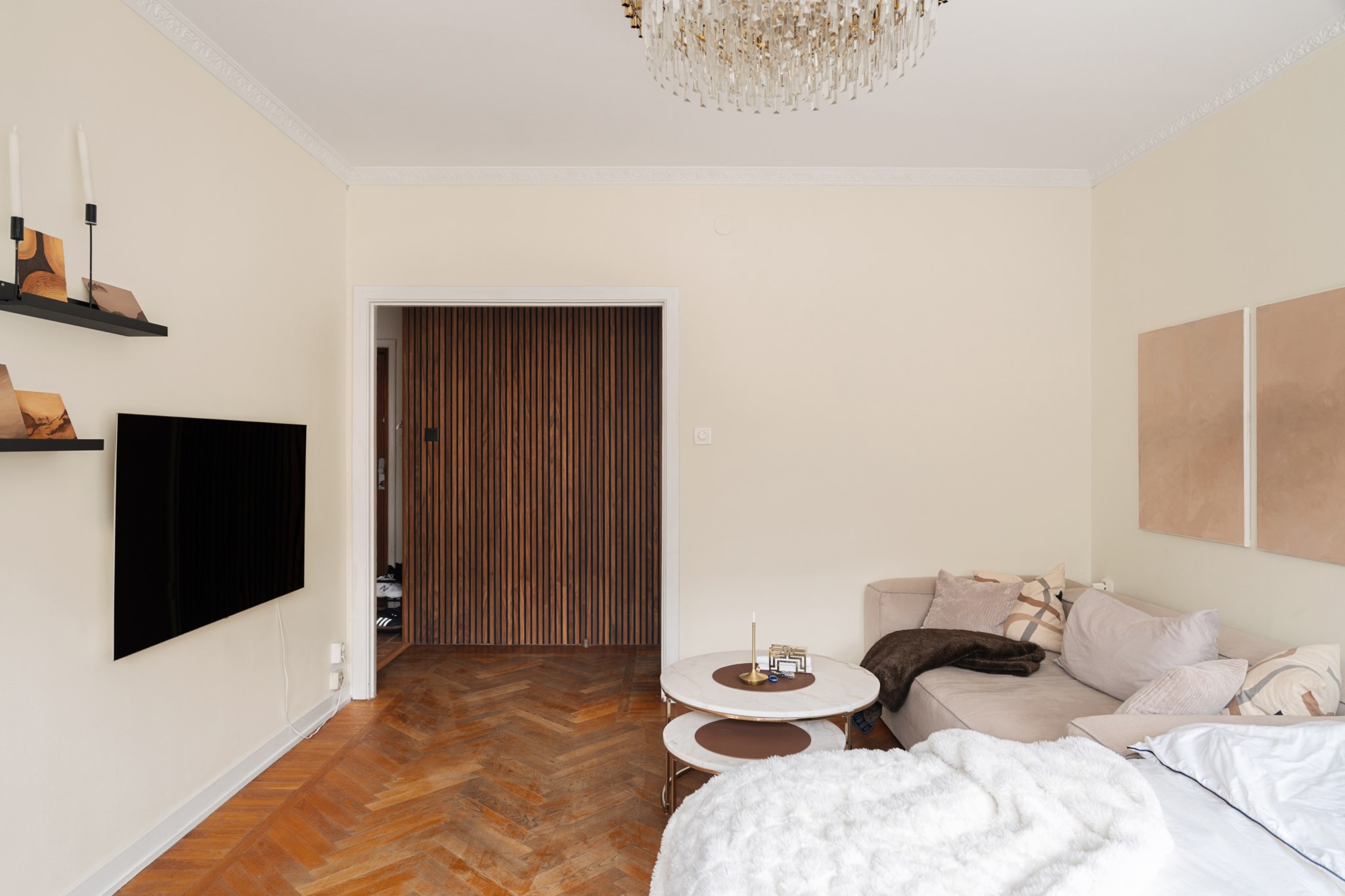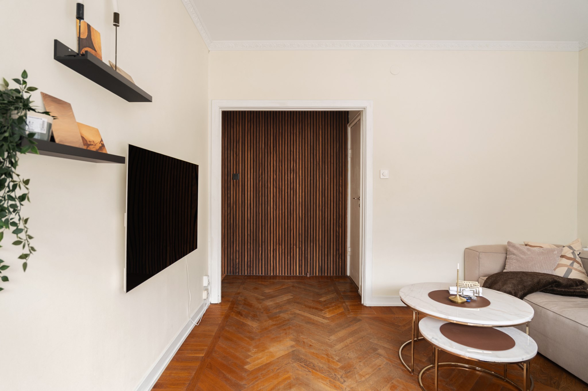 Det här är en bostad som direkt sätter tonen. Redan när du kliver in möts du av en känsla av rymd, ljus och genomtänkt design – där varje detalj bidrar till helheten. Den vackra fiskbensparketten löper elegant genom rummen och skapar en klassisk grund som möter det moderna på ett självklart sätt. Takhöjden förstärker upplevelsen ytterligare och ger bostaden en luftig, nästan svävande karaktär.
