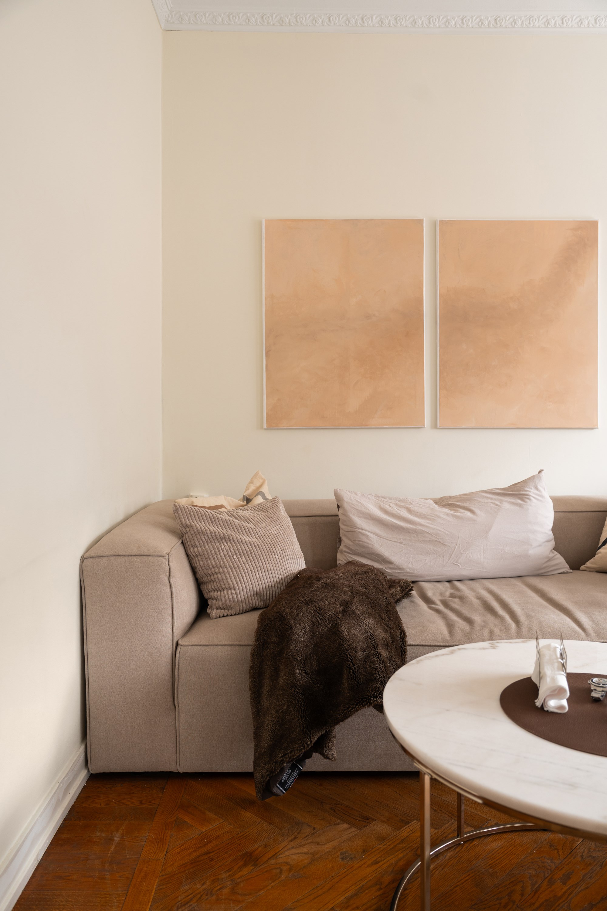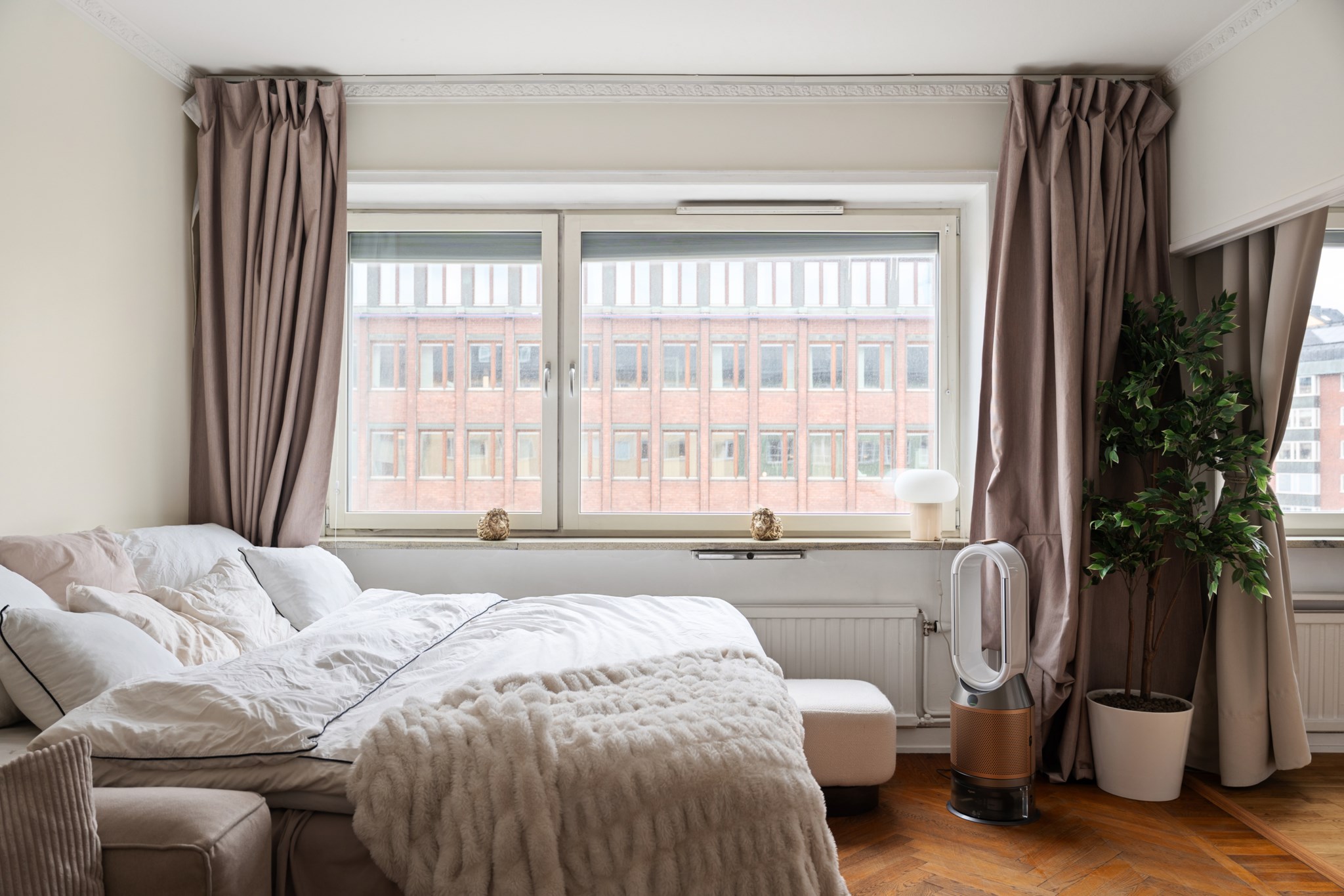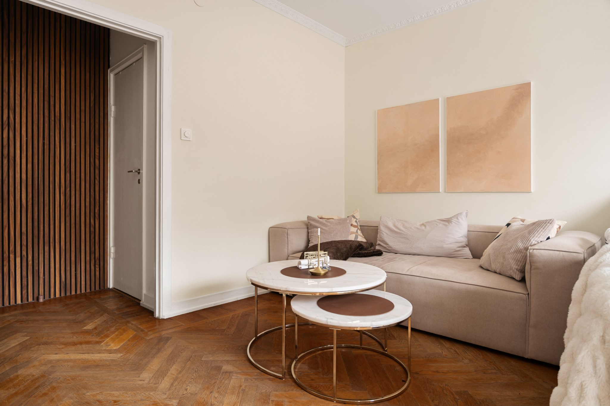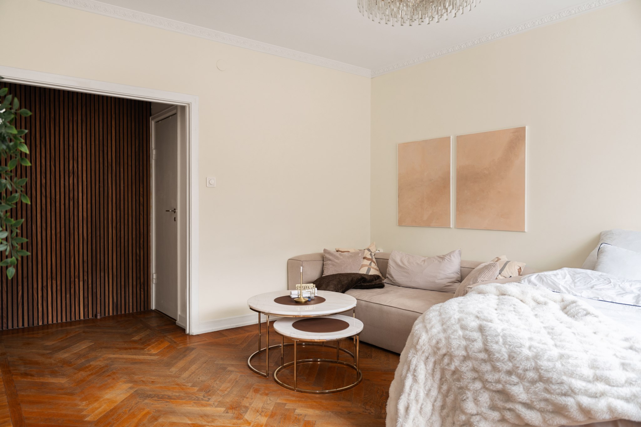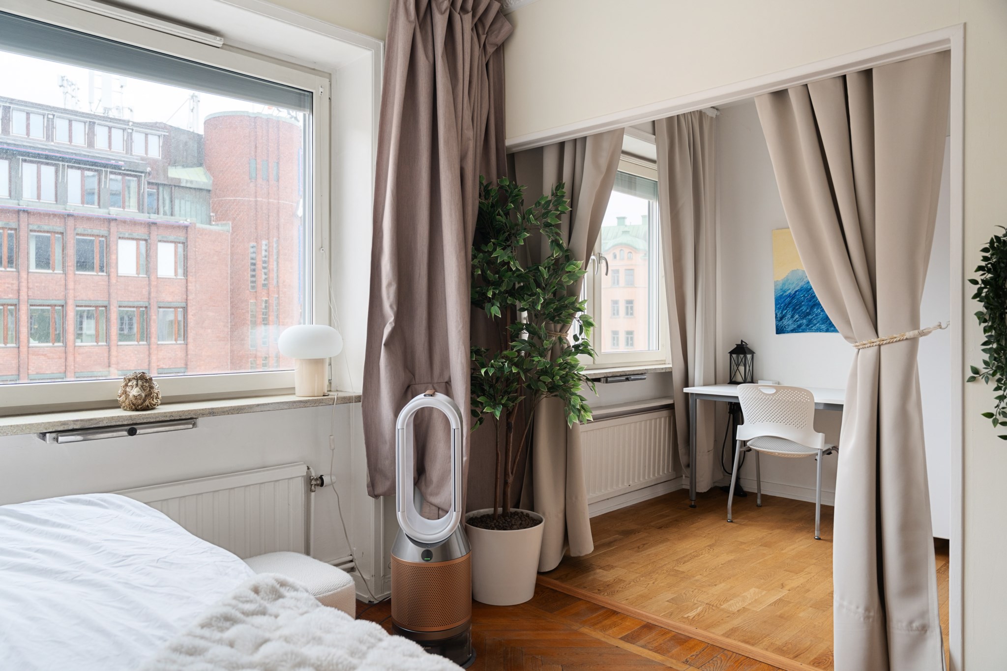 Det här är en bostad som direkt sätter tonen. Redan när du kliver in möts du av en känsla av rymd, ljus och genomtänkt design – där varje detalj bidrar till helheten. Den vackra fiskbensparketten löper elegant genom rummen och skapar en klassisk grund som möter det moderna på ett självklart sätt. Takhöjden förstärker upplevelsen ytterligare och ger bostaden en luftig, nästan svävande karaktär.
