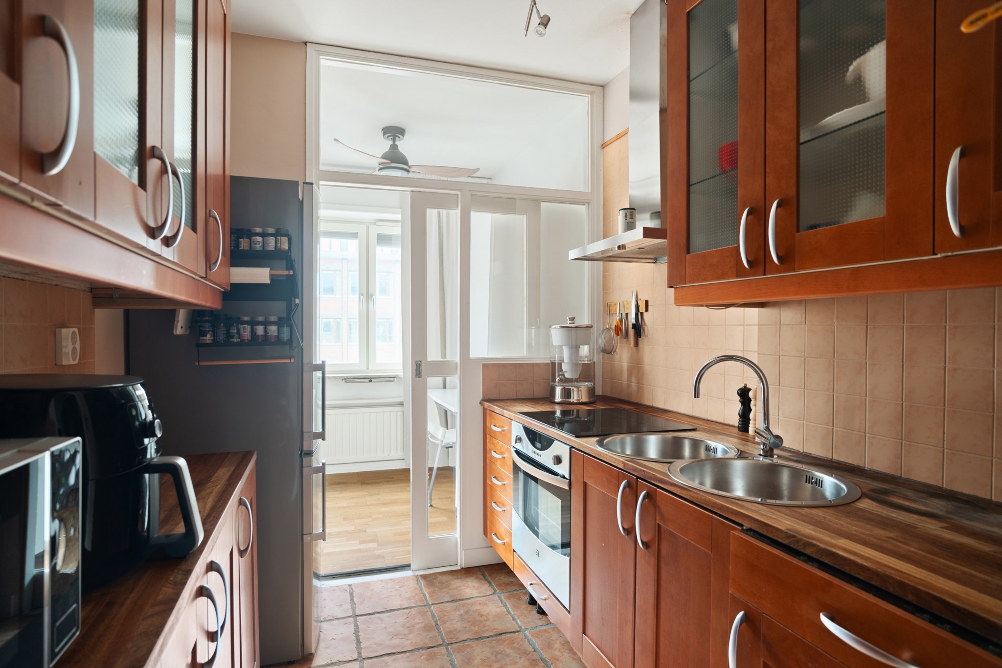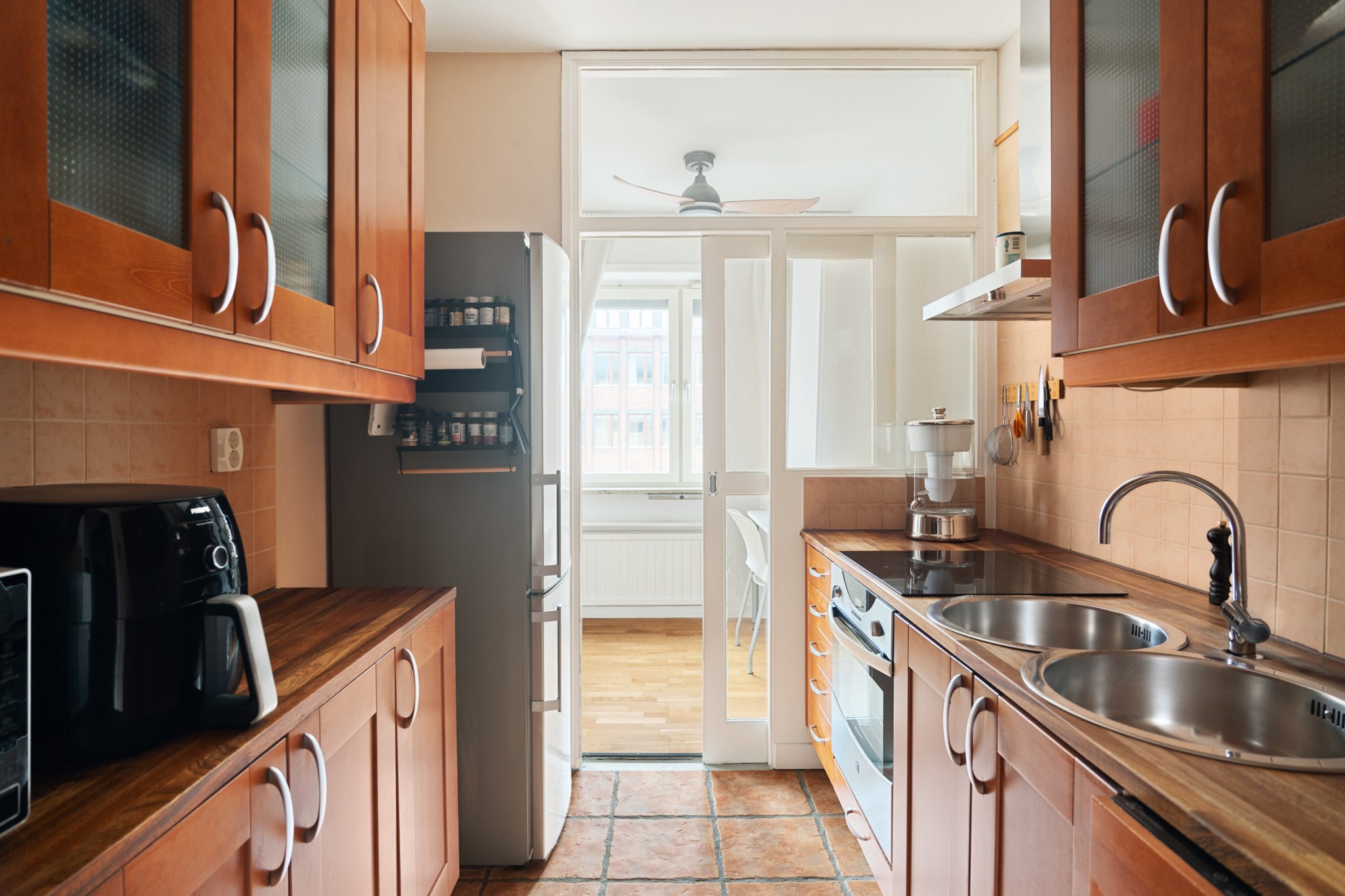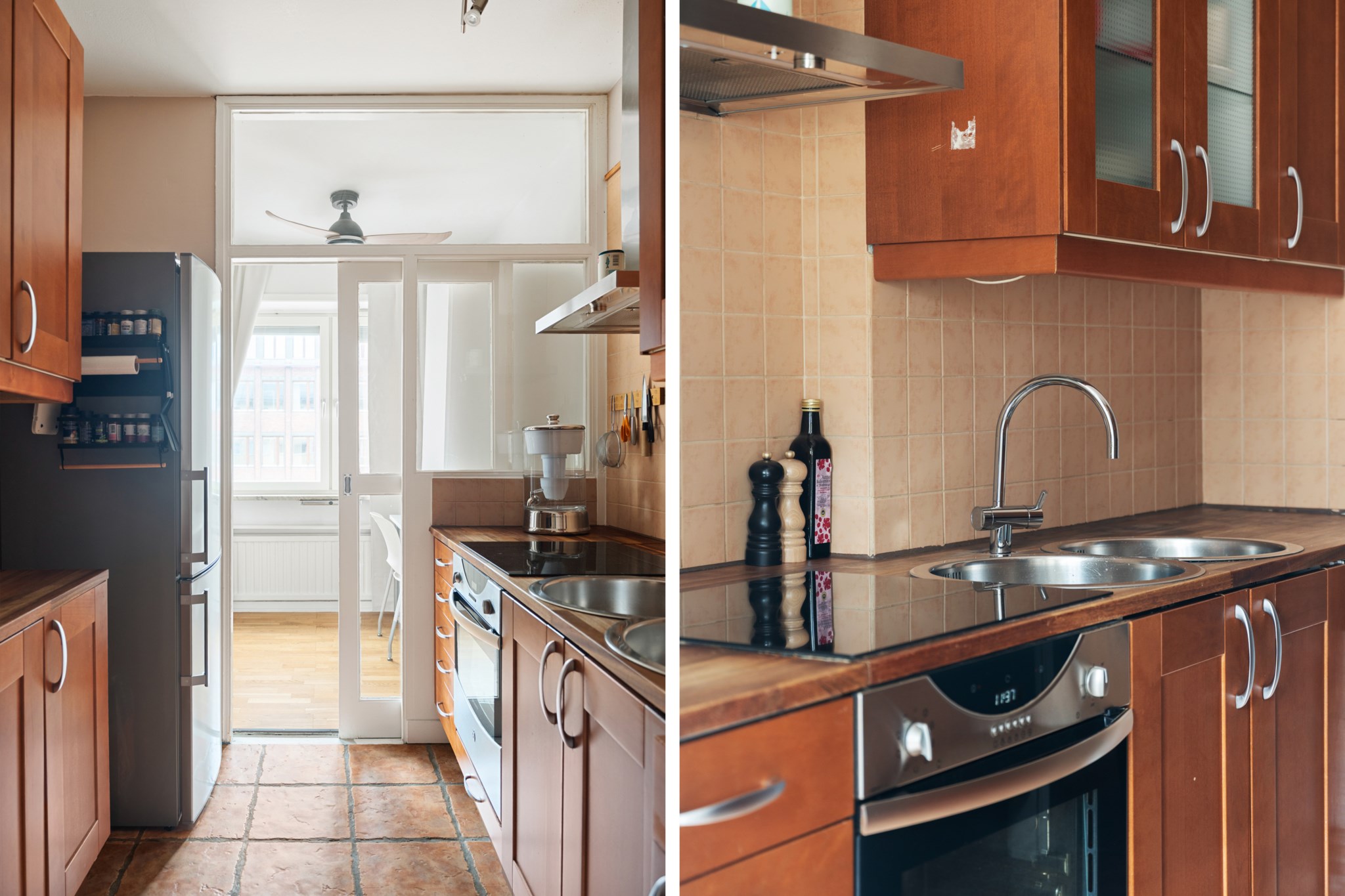 Köket är modernt och fullt utrustat med högkvalitativa vitvaror och smakfull inredning. Här finns gott om arbetsyta och förvaring, samtidigt som rummet behåller sin egen identitet – perfekt för dig som uppskattar en mer traditionell planlösning.